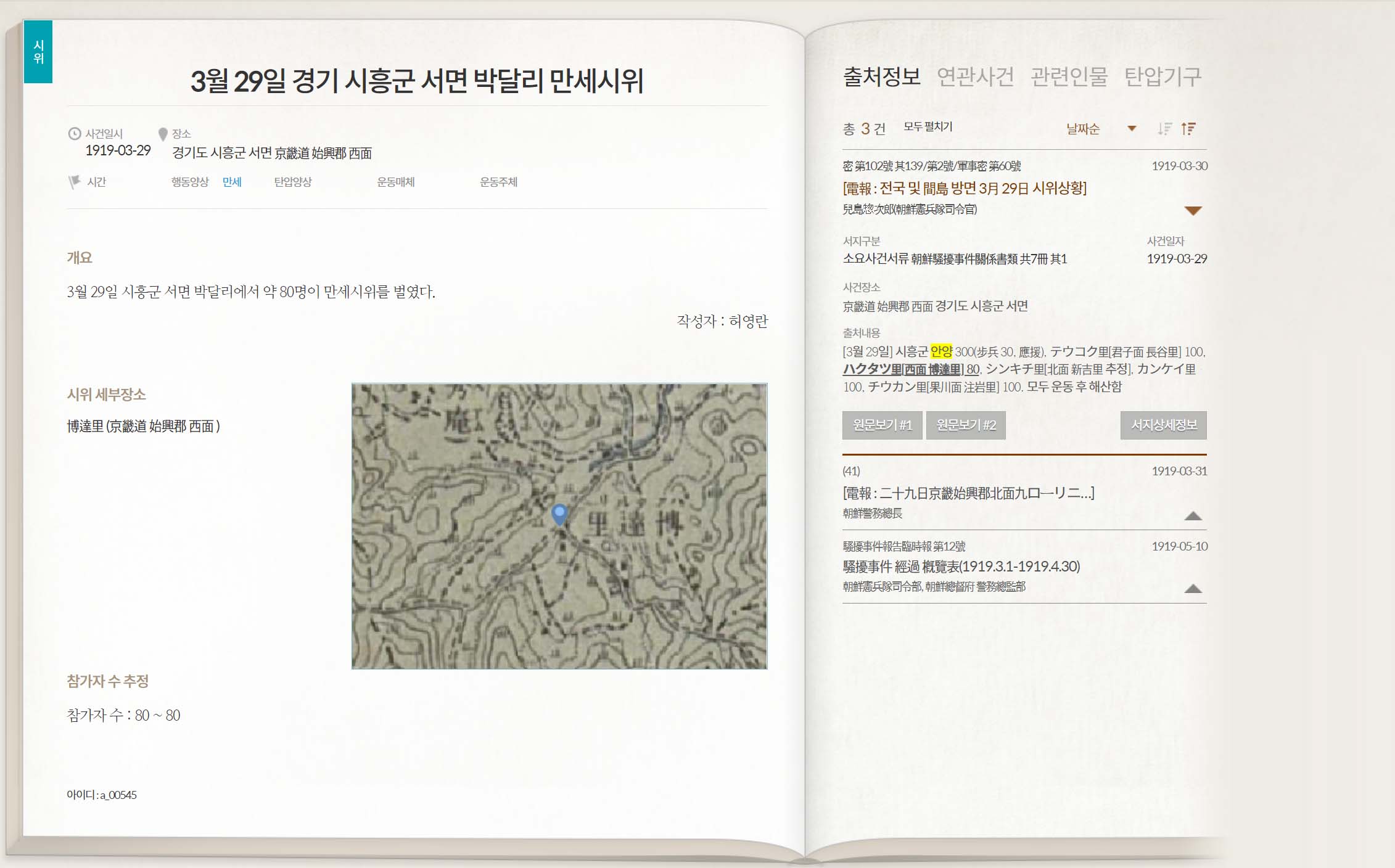삼일운동 데이터베이스의 [3월 29일 경기 시흥군 서면 박달리 만세시위] 제목의 조사 자료에 따르면 3월 29일 시흥군 서면 박달리에서 약 80명이 만세시위를 벌였다고 한다. 이같은 사실은 당시 일본 경찰이 작성해 조선총둑부와 일본 육군성에 보고한 '조선소요사건관계서류' 문건에 기록된 내용이다.