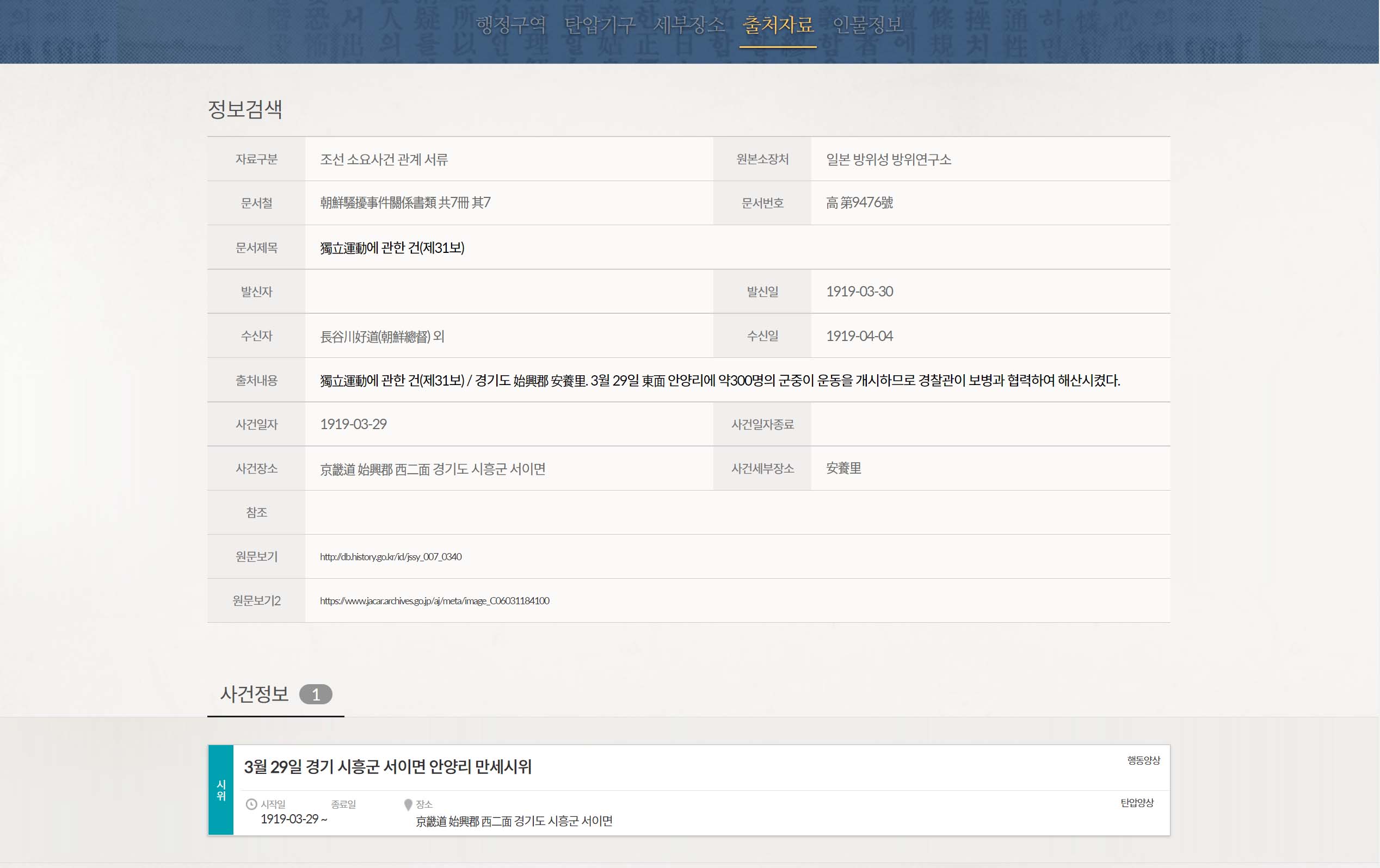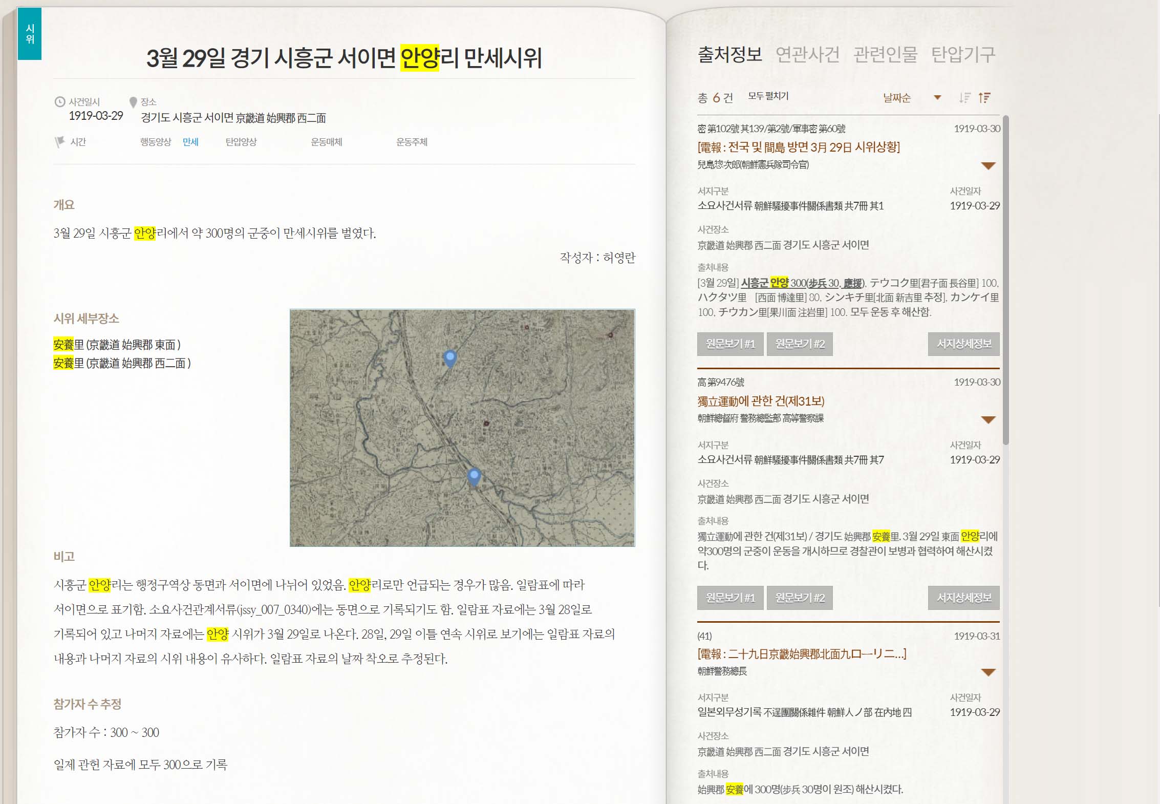 또 관련 문서들을 조사한 연구자는 시흥군 안양리는 행정구역상 동면과 서이면에 나뉘어 있었음. 안양리로만 언급되는 경우가 많음. 일람표에 따라 서이면으로 표기함. 소요사건관계서류(jssy_007_0340)에는 동면으로 기록되기도 함. 일람표 자료에는 3월 28일로 기록되어 있고 나머지 자료에는 안양 시위가 3월 29일로 나온다. 28일, 29일 이틀 연속 시위로 보기에는 일람표 자료의 내용과 나머지 자료의 시위 내용이 유사하다. 일람표 자료의 날짜 착오로 추정된다고 언급했다.