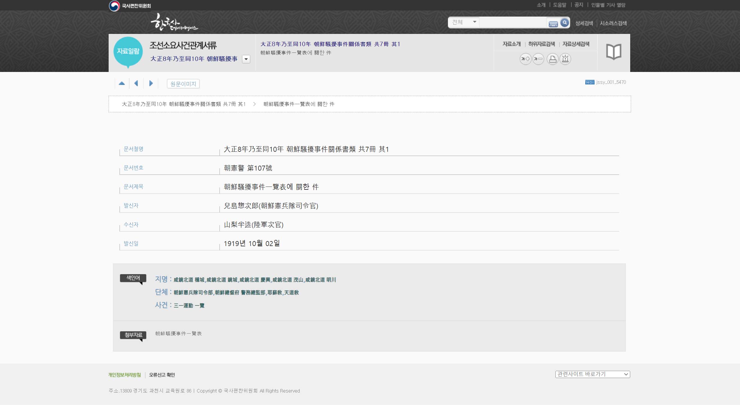 조선소요사건관계서류 데이터베이스는 국가보훈처로부터 공훈전자사료관에서 서비스하고 있는 데이터베이스를 제공받아 우리 위원회가 소장하고 있는 원문이미지와 대조하여 메타데이터를 보완 제작하여 2016년말 서비스하게 되었다. 본 데이터베이스는 국가보훈처 공훈전자사료관에서도 볼 수 있으며, 일본 아시아역사자료센터에서는 자체 제작한 데이터베이스를 서비스하고 있다.