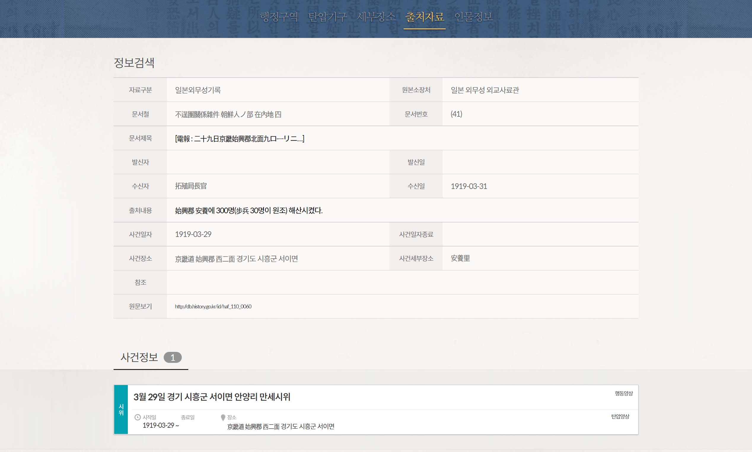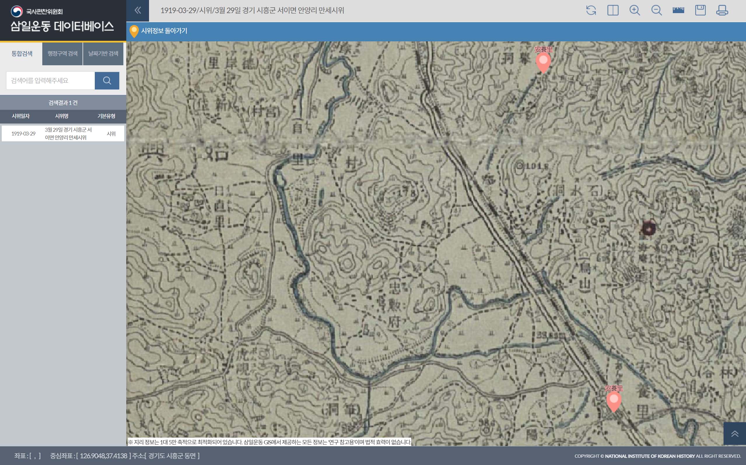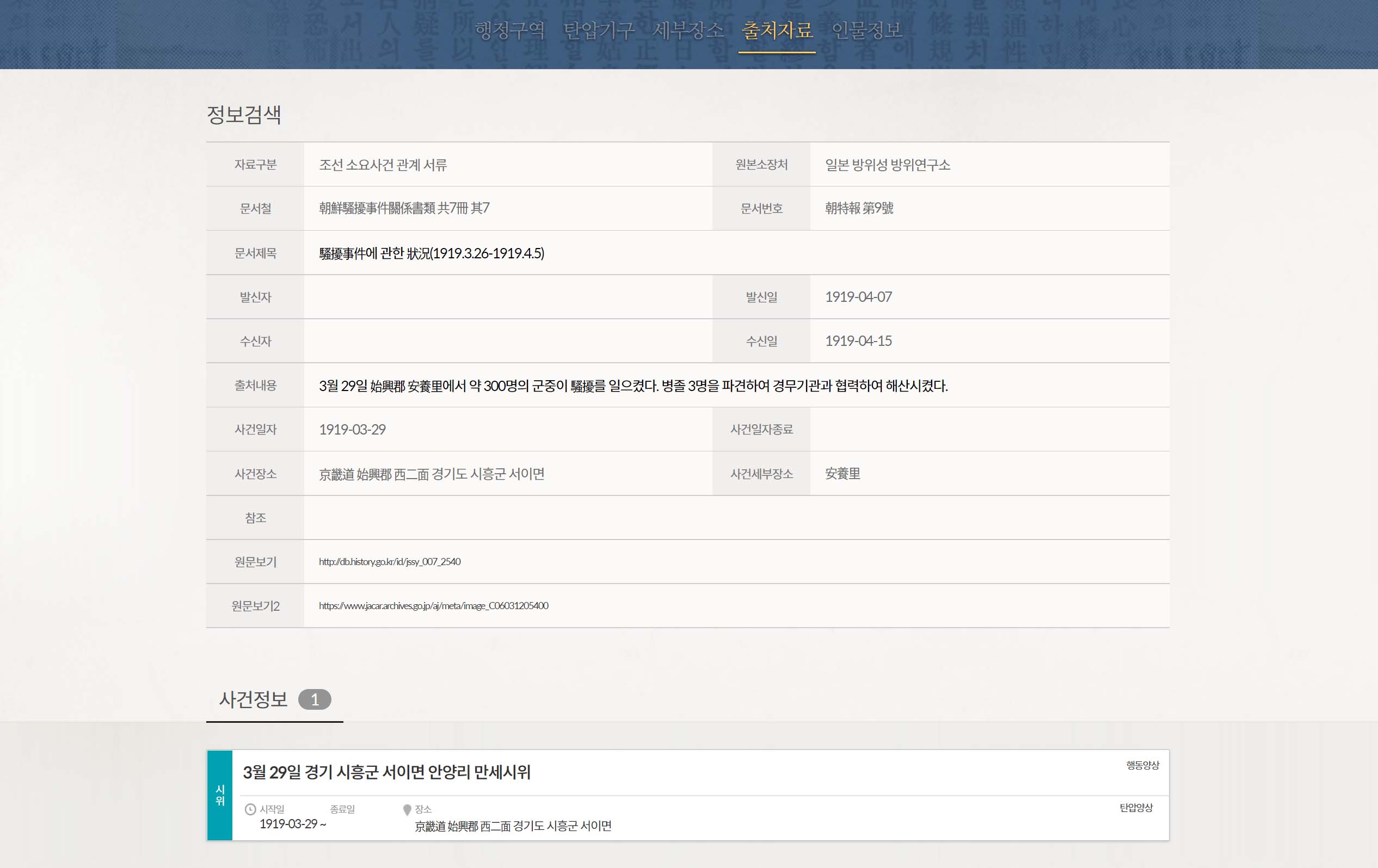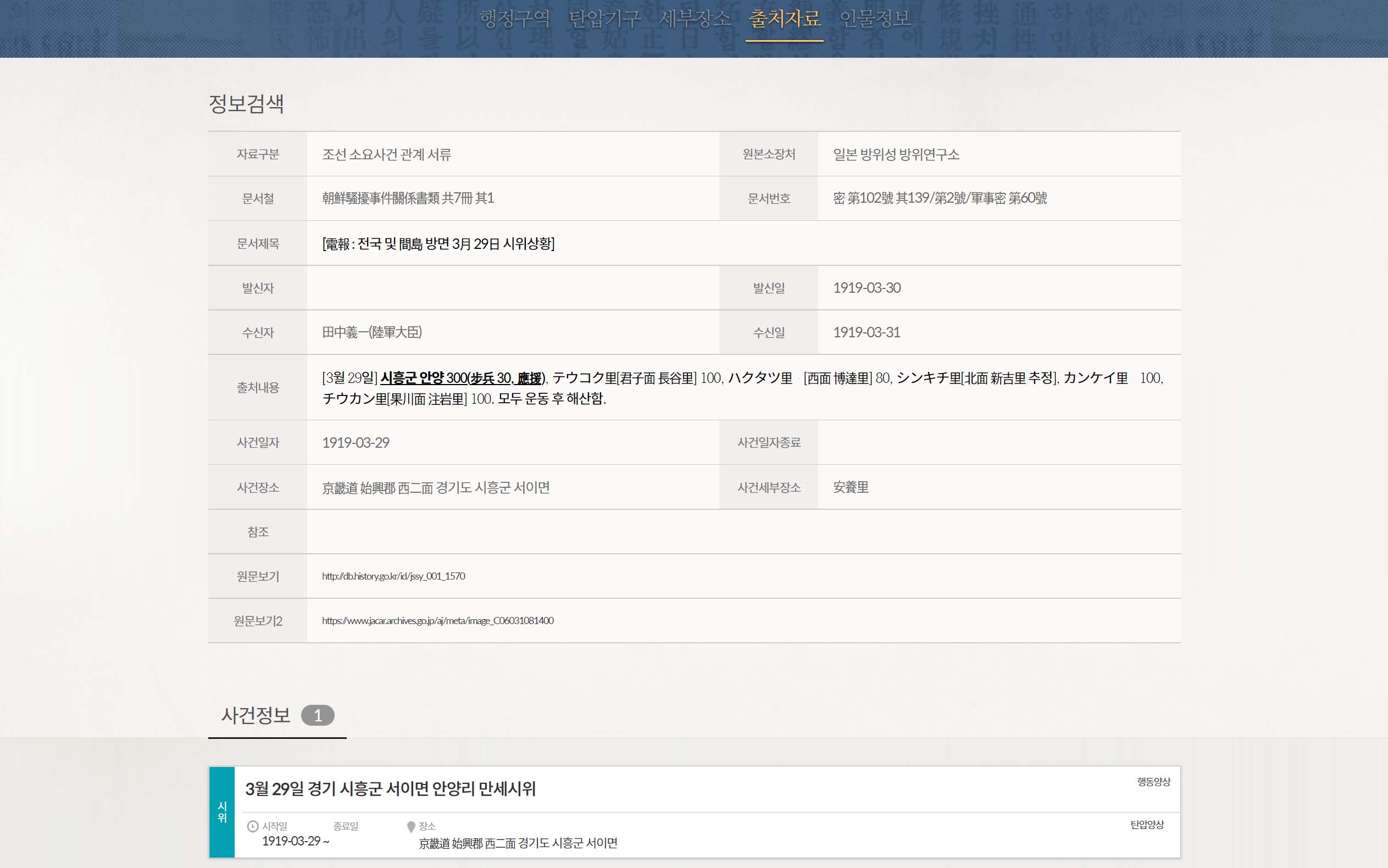 또 관련 문서들을 조사한 연구자는 시흥군 안양리는 행정구역상 동면과 서이면에 나뉘어 있었음. 안양리로만 언급되는 경우가 많음. 일람표에 따라 서이면으로 표기함. 소요사건관계서류(jssy_007_0340)에는 동면으로 기록되기도 함. 일람표 자료에는 3월 28일로 기록되어 있고 나머지 자료에는 안양 시위가 3월 29일로 나온다. 28일, 29일 이틀 연속 시위로 보기에는 일람표 자료의 내용과 나머지 자료의 시위 내용이 유사하다. 일람표 자료의 날짜 착오로 추정된다고 언급했다.