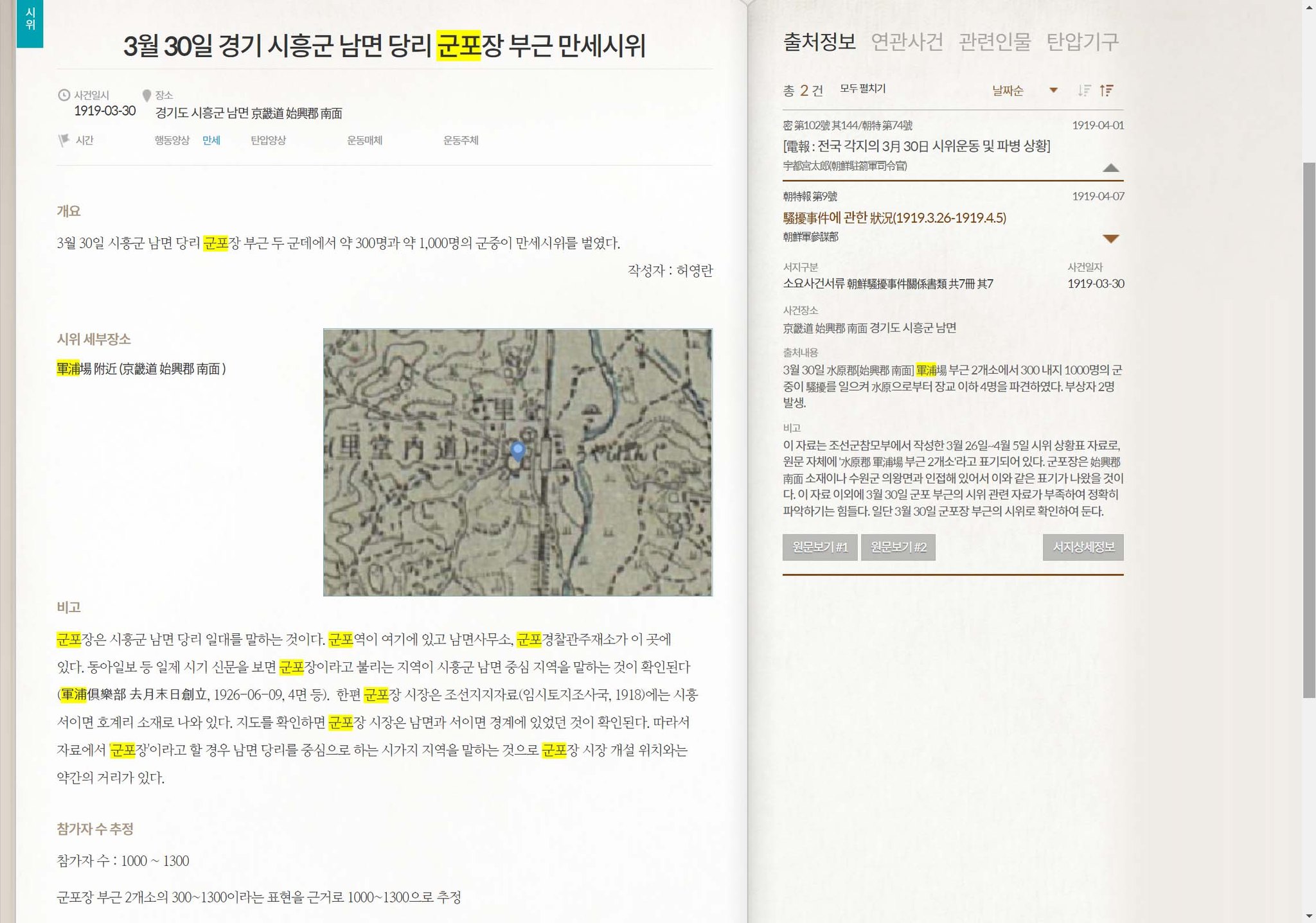 이 자료는 조선군참모부에서 작성한 3월 26일~4월 5일 시위 상황표 자료로, 원문 자체에 '水原郡 軍浦場 부근 2개소'라고 표기되어 있다. 군포장은 始興郡 南面 소재이나 수원군 의왕면과 인접해 있어서 이와 같은 표기가 나왔을 것이라고 조사자는 분석했다.