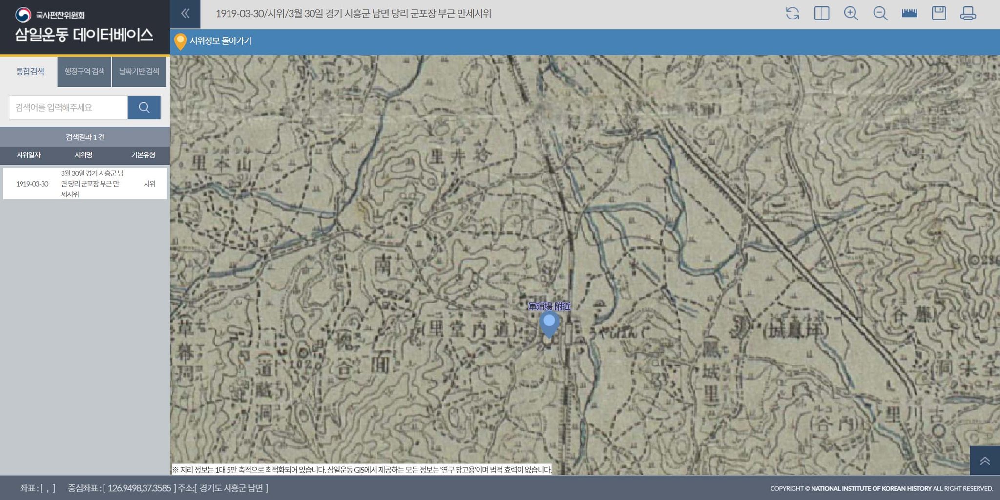 국사편찬위원회의 삼일운동 데이터베이스를 확인한 결과 1919년 3월 30일 시흥군 남면 당리 군포장 부근 두 군데에서 약 300명과 약 1,000명의 군중이 만세시위를 벌였다.