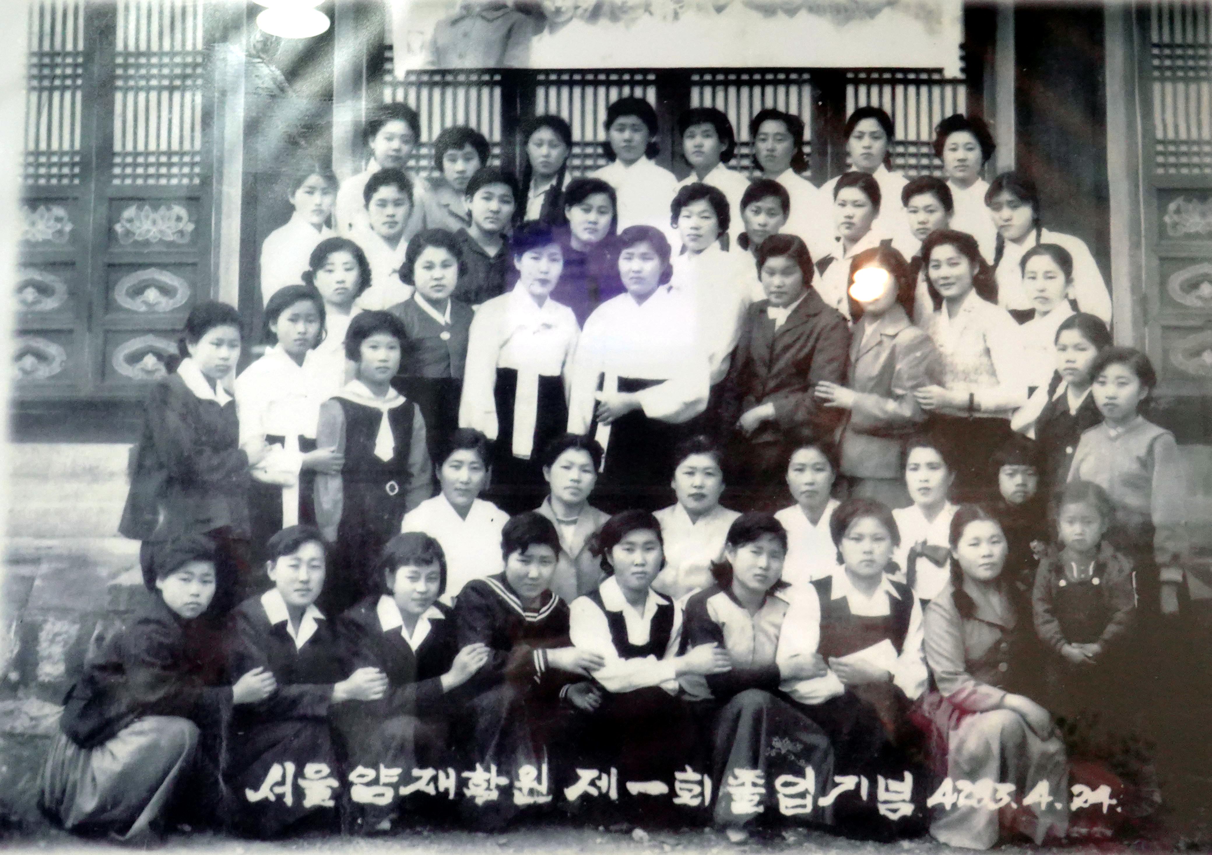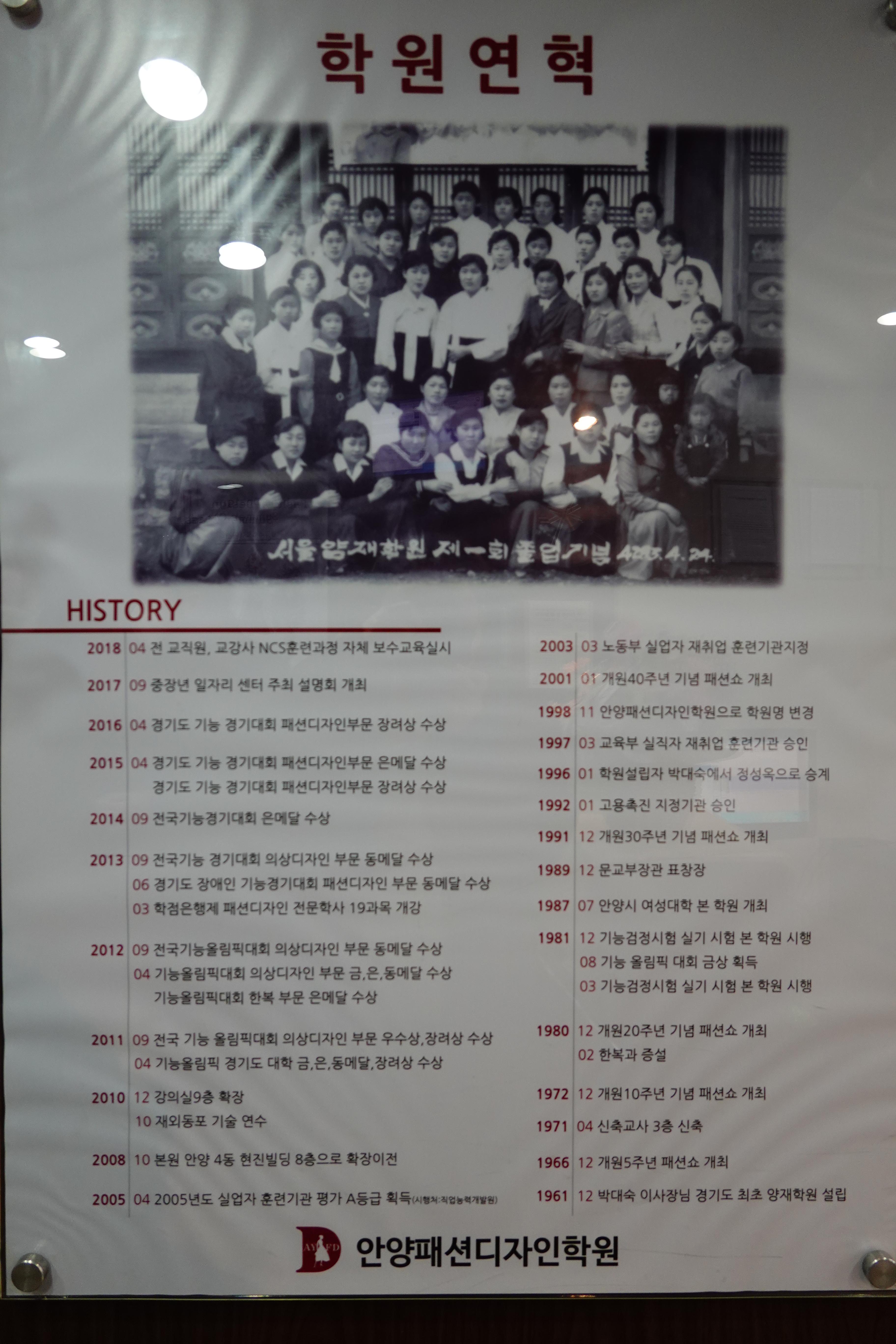 안양1동 674-296 건물 2.3층에 자리했던 서울 양재학원(안양4동으로 이전. 현 안양 패션디자인학원)의 1회 졸업기념사진으로 1962년(단기4295년 4월24일)에 찍은 것으로 지난 13일 만안구청과 만문누리에서 추진하는 만년가게 선정에 따른 선정패 부착괴정에서 발견한 사진이다.