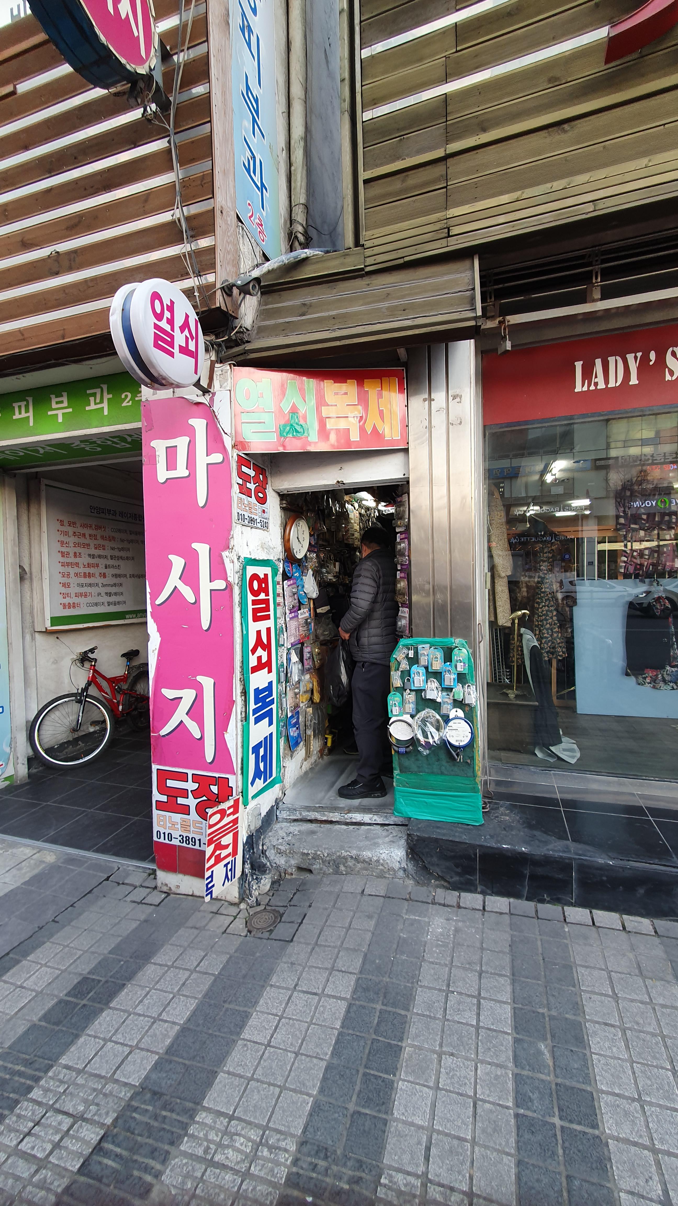 2022.12.16/ #도시기록 #틈새 #안양일번가 #열쇠가게/ 안양에서 가장 작은 가게가 아닐까. 안양일번가 국민은행옆에서 열쇠를 복제하고 도장을 파는 장인이 있는 가게 건물과 건물사이에 틈새를 이용한듯 충입구 폭이 1m에 불과.출입문도 없는데 이 추운 겨울 어찌 버티실까.