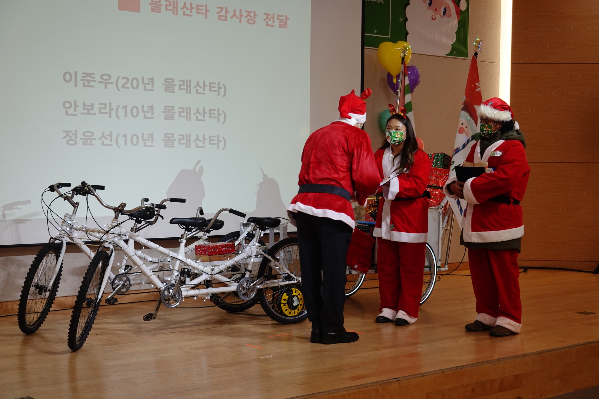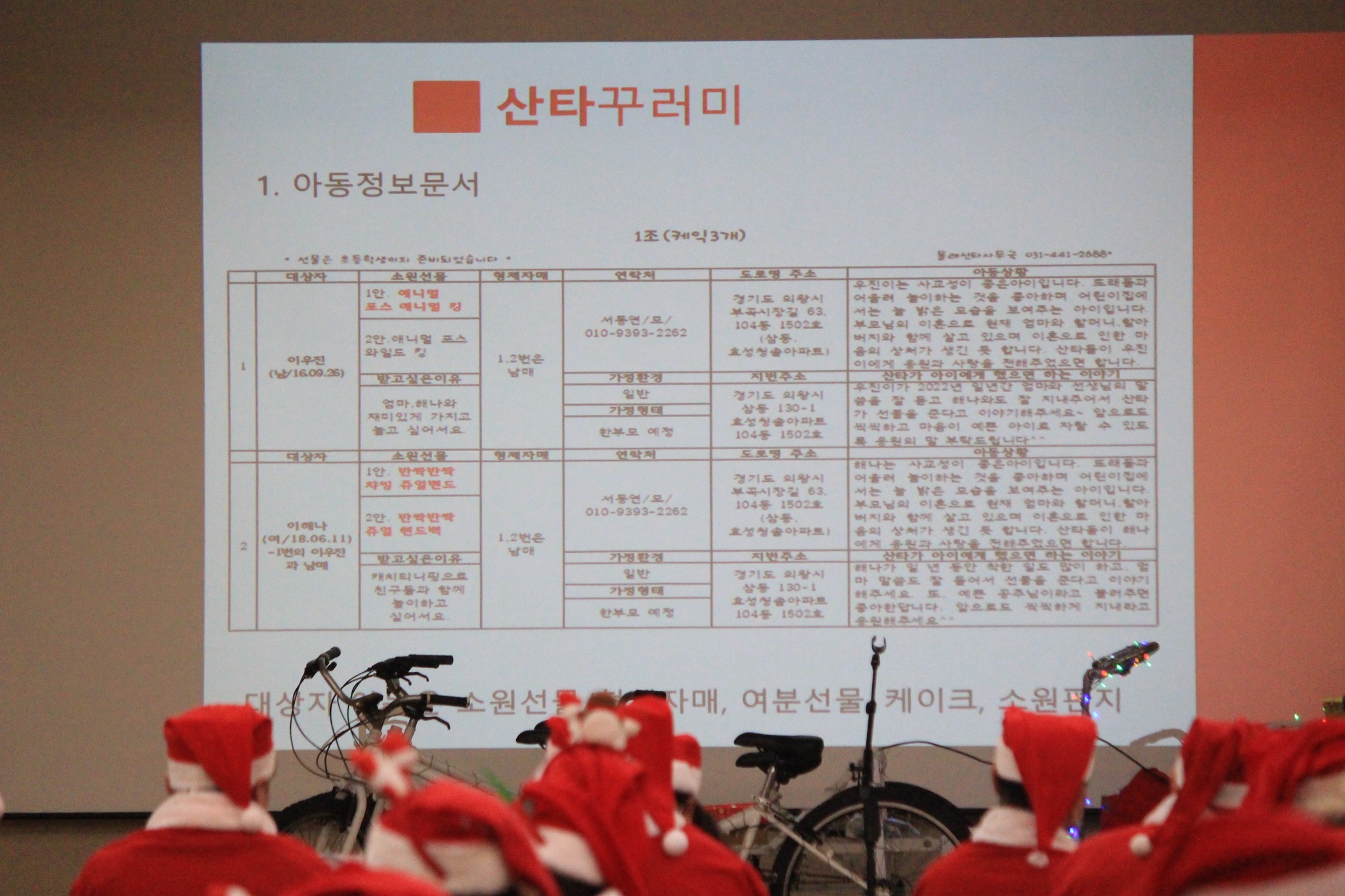 올해에는 안양.군포.의왕 지역에 250여명의 사는 저소득, 위기, 장애, 다문화, 조손, 한부모 가정 어린이들이 평소 갖고 싶었던 소원선물과 예쁜 케익과 더불어 산타들이 아이와 함께 즐길 수 있는 노래와 율동 등 다양한 이벤트를 준비해 찾아갔는데 올해 촐동한 산타들은 매년 크리스마스뿐만 아니라 어린이날, 한가위 등의 명절에도 어린이들을 방문한다.