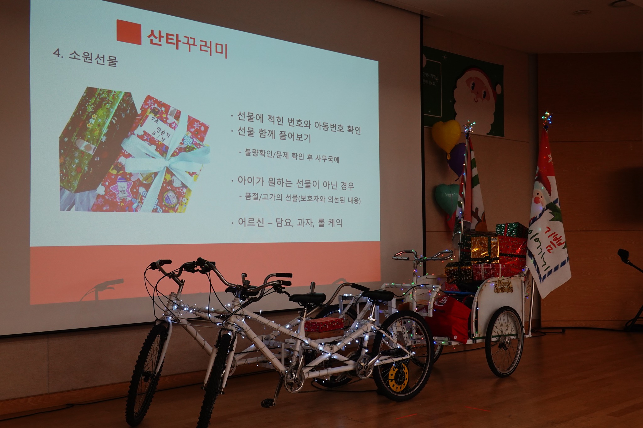 올해에는 안양.군포.의왕 지역에 250여명의 사는 저소득, 위기, 장애, 다문화, 조손, 한부모 가정 어린이들이 평소 갖고 싶었던 소원선물과 예쁜 케익과 더불어 산타들이 아이와 함께 즐길 수 있는 노래와 율동 등 다양한 이벤트를 준비해 찾아갔는데 올해 촐동한 산타들은 매년 크리스마스뿐만 아니라 어린이날, 한가위 등의 명절에도 어린이들을 방문한다.