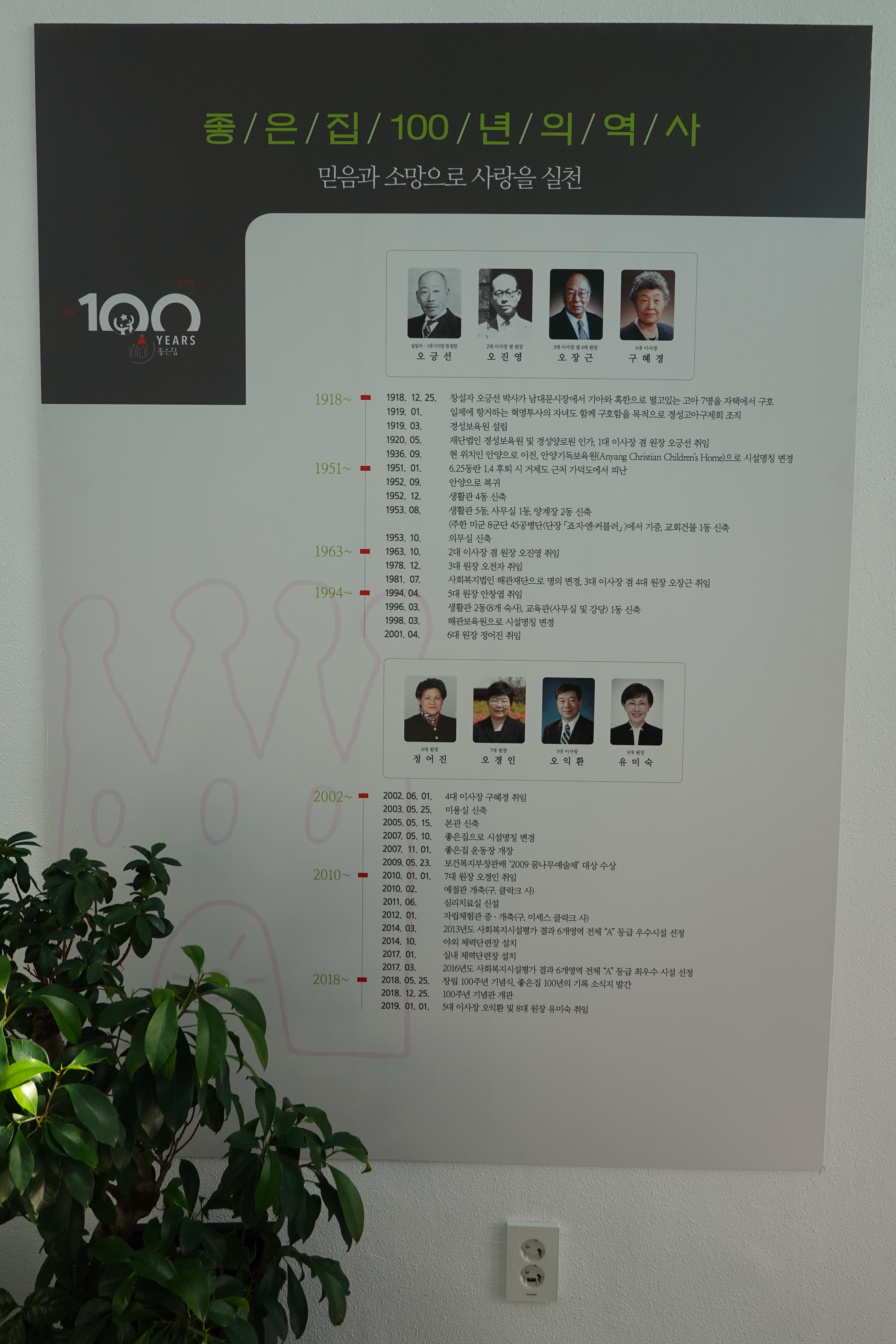 창립 100주년을 맞은 좋은집, 2018년 예술공원로 52번길 언덕 위에 벽돌색 지붕의 하얀 건물이 성곽처럼 우뚝 서 있습니다. 아이들을 보호하는 울타리이면서 또한 ‘좋은집’의 사무공간이지요. 아이들을 돕기위한 모든 행정이 이곳에서 이루어집니다.