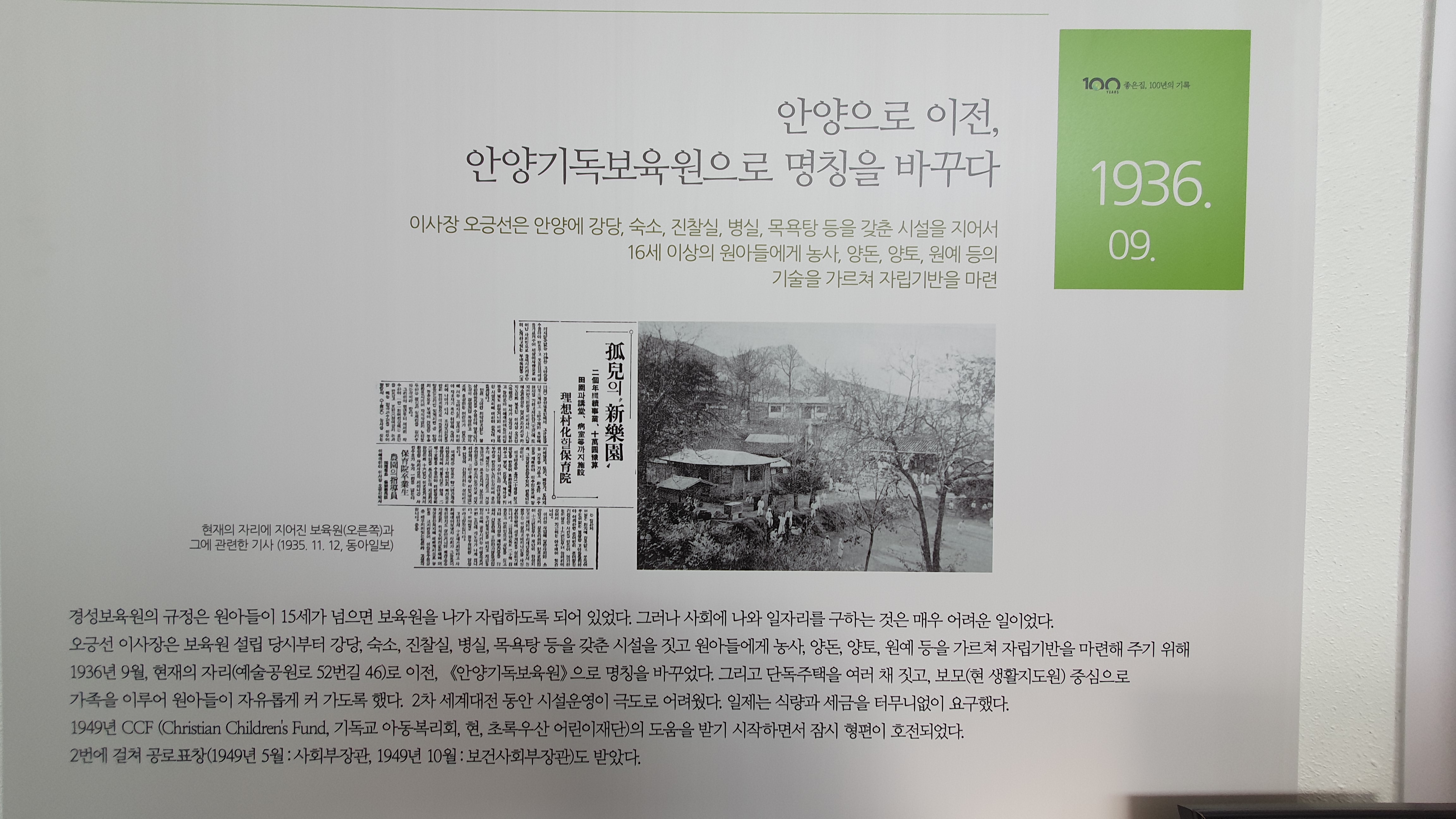 1936.09 현 위치인 안양으로 이전(안양 기독보육원으로 시설명칭 변경)
