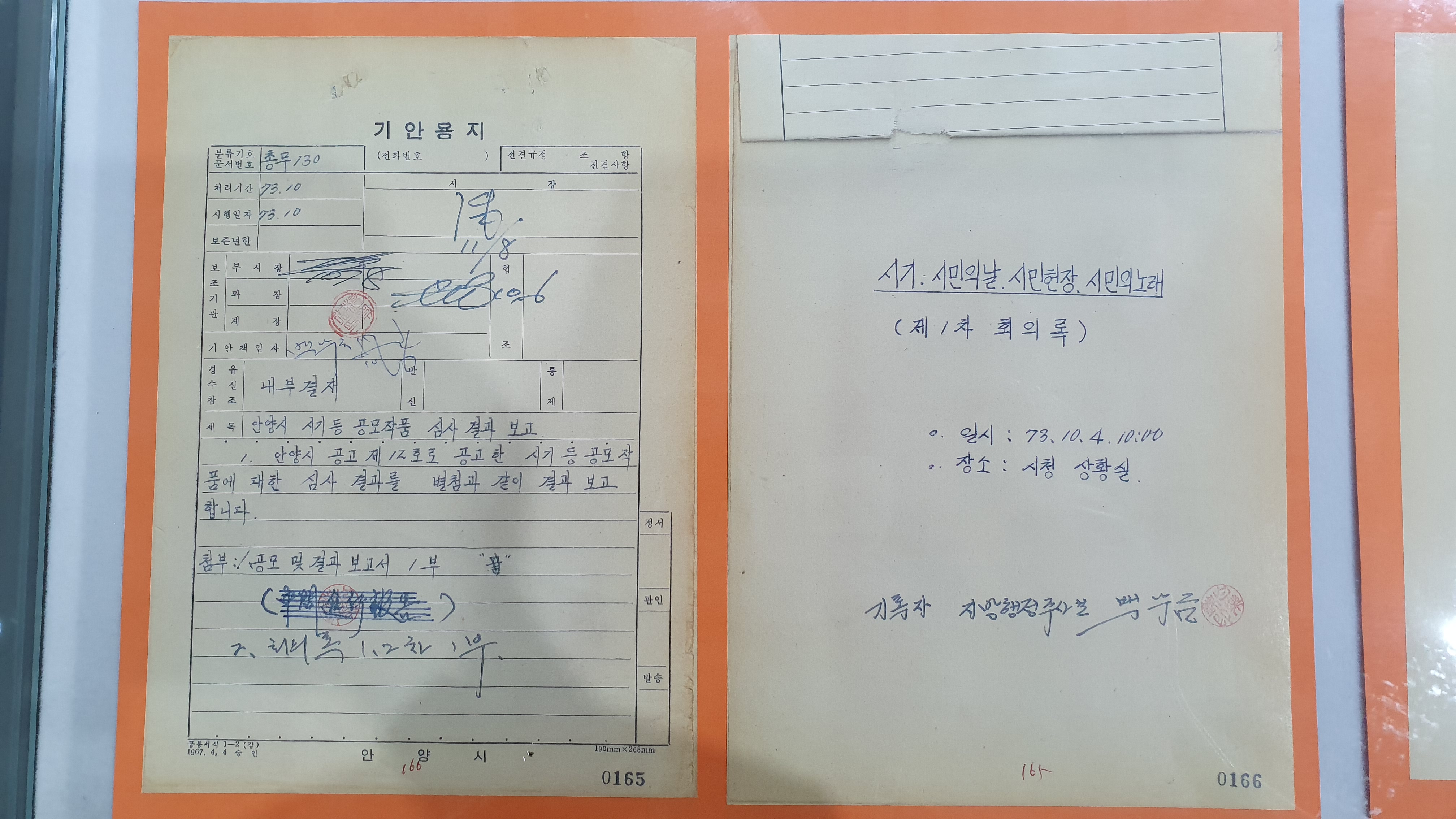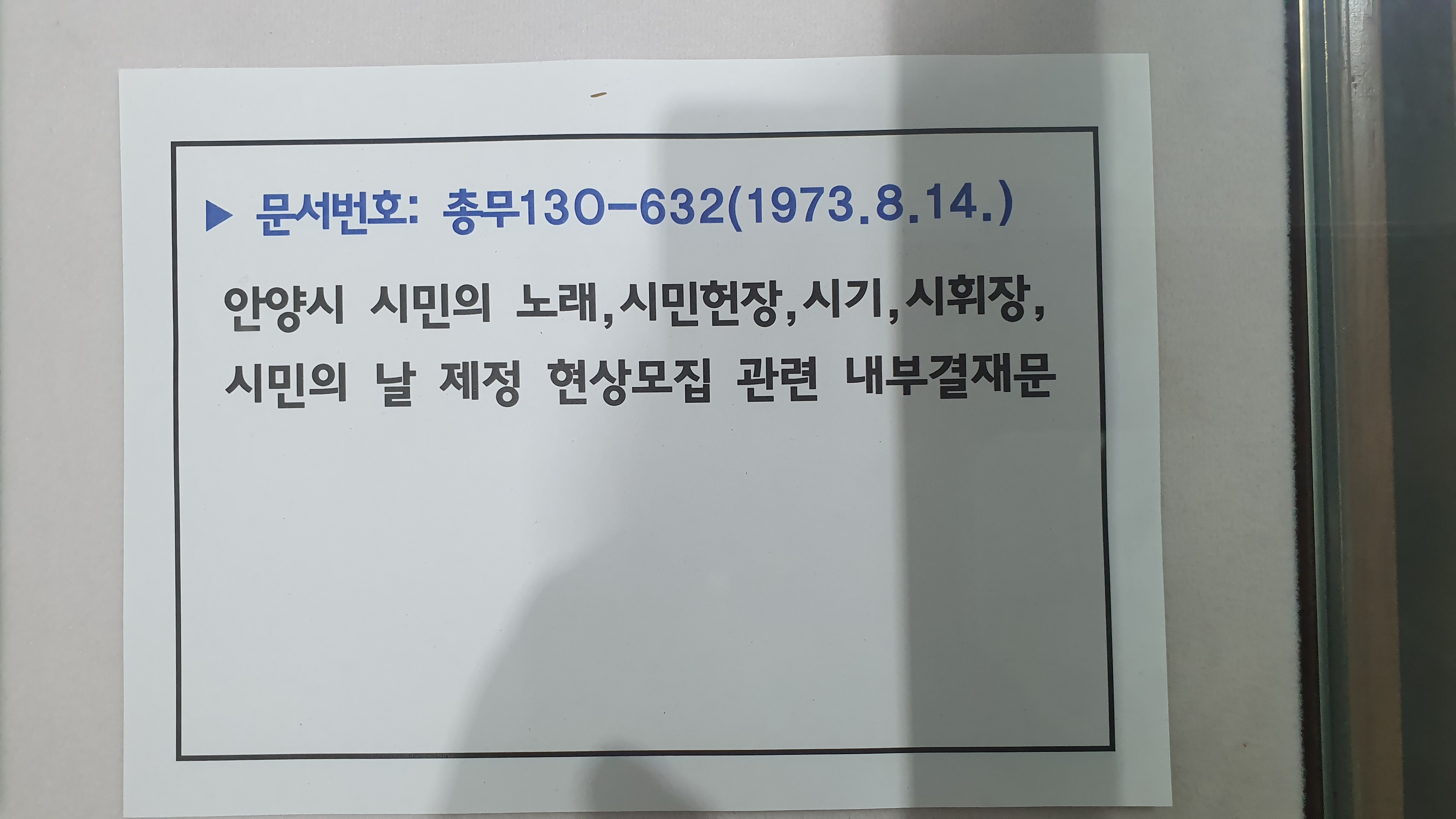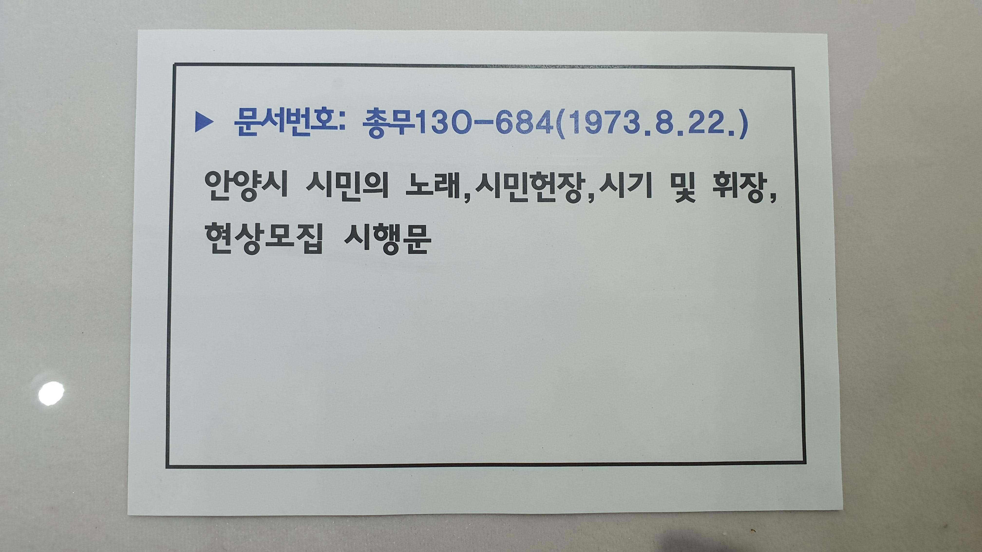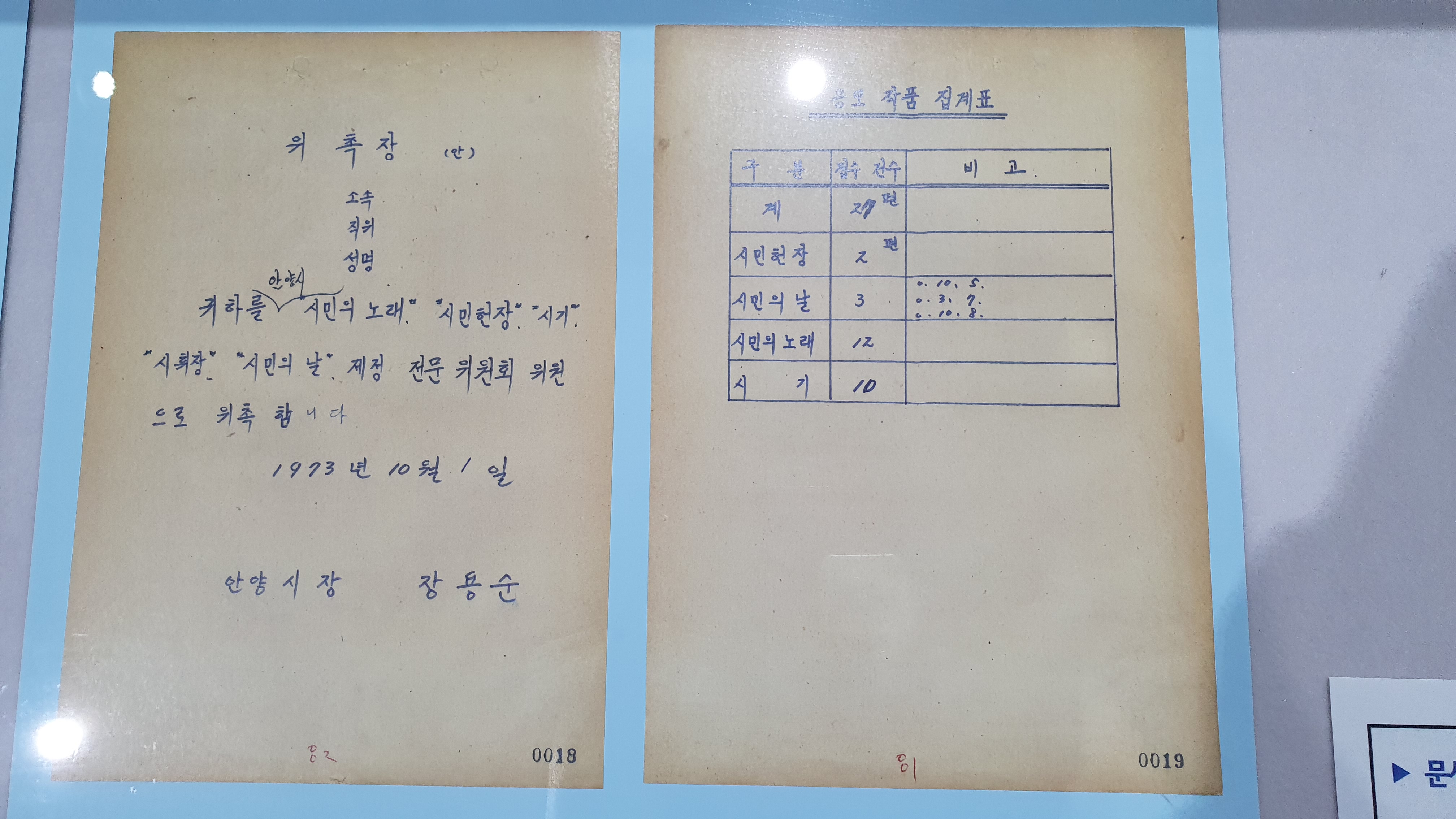 2019년 전시회에는 ‘안양시민의 노래’와 ‘안양시민헌장’ 등의 시 상징물이 제정되기까지 과정이 담긴 1973∼1974년 당시의 기록물 40여점이 선보였다.