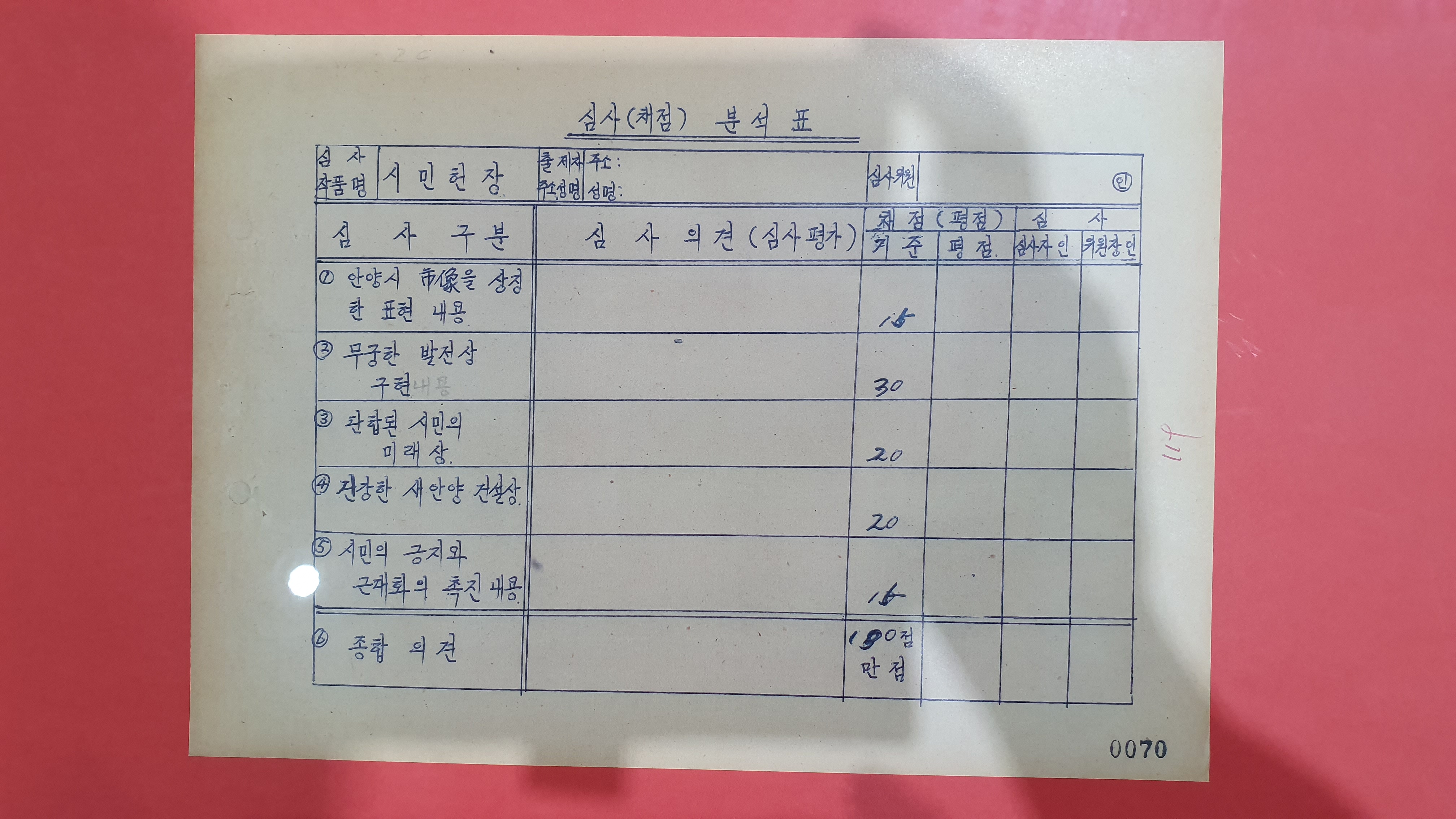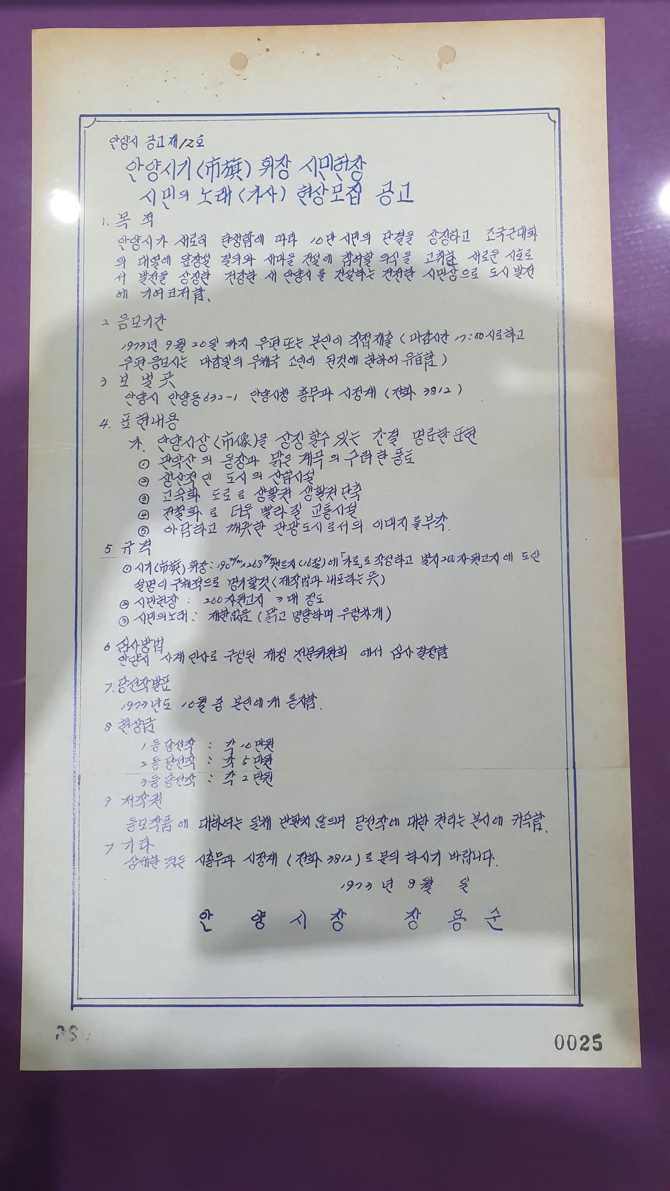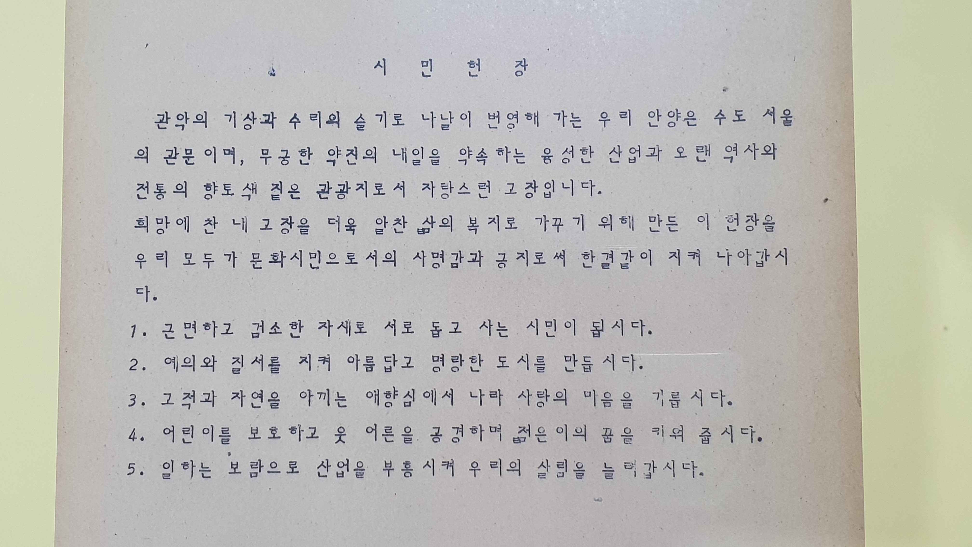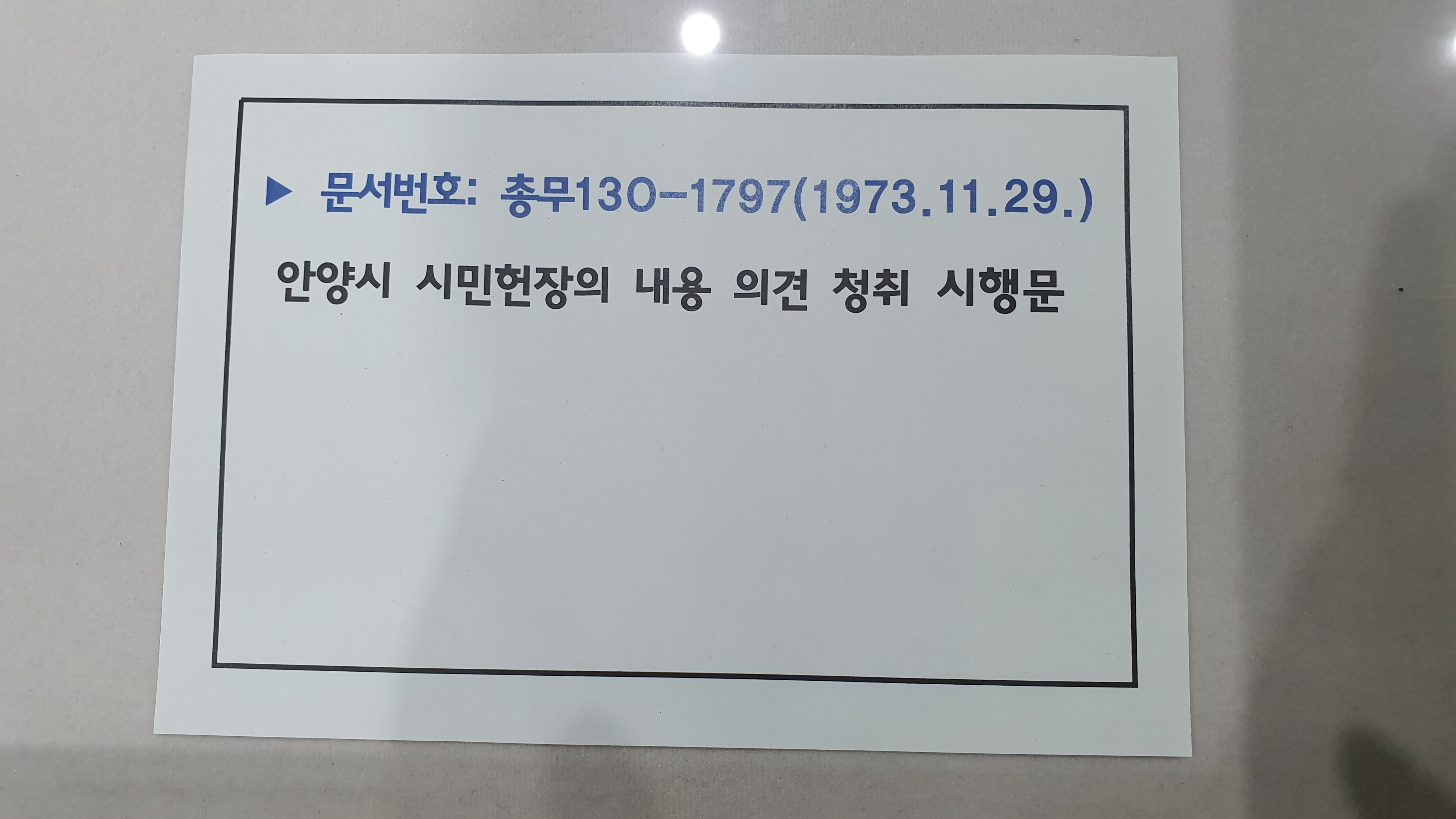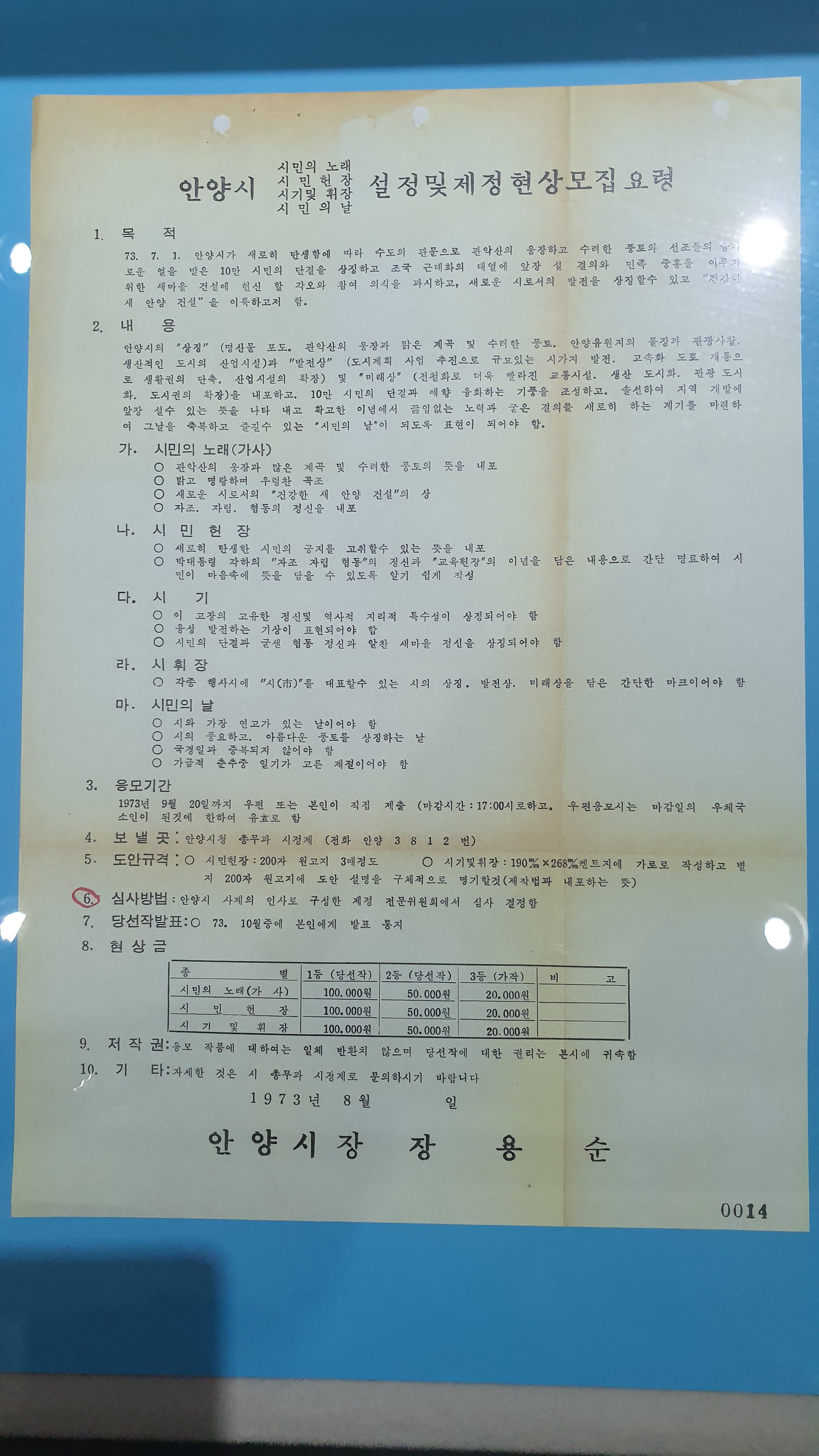 2019년 전시회에는 ‘안양시민의 노래’와 ‘안양시민헌장’ 등의 시 상징물이 제정되기까지 과정이 담긴 1973∼1974년 당시의 기록물 40여점이 선보였다.