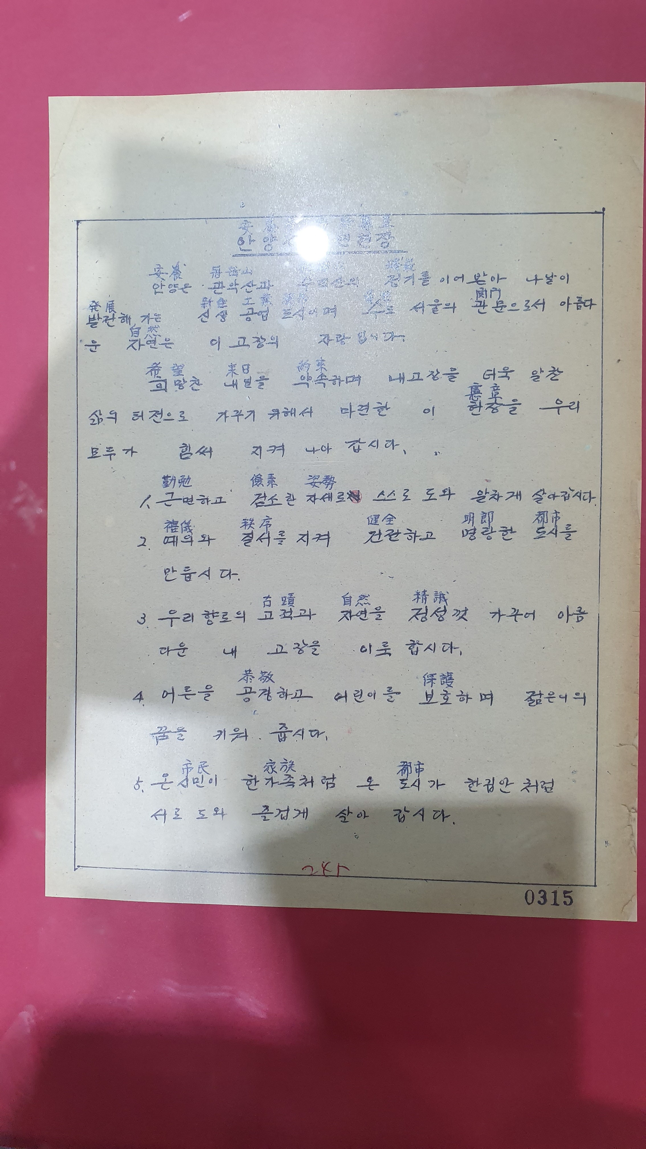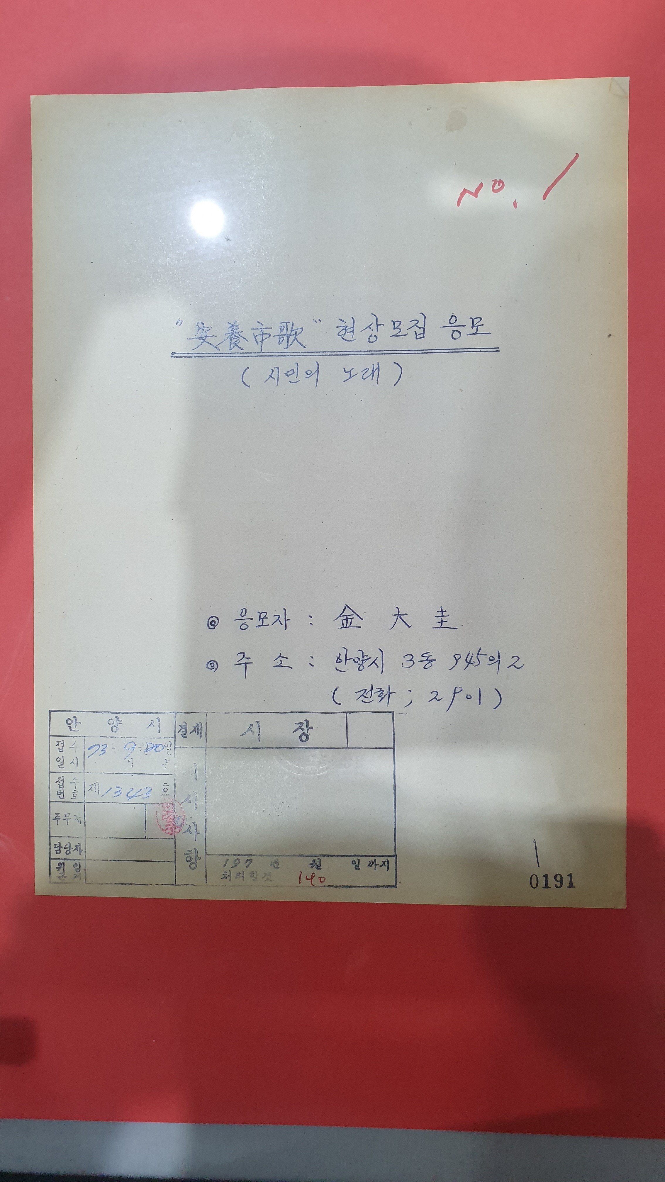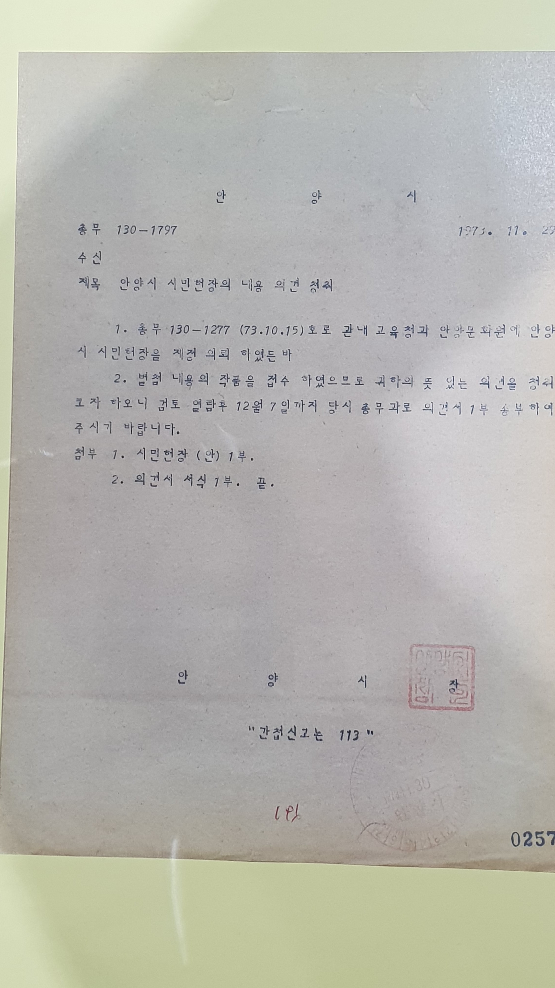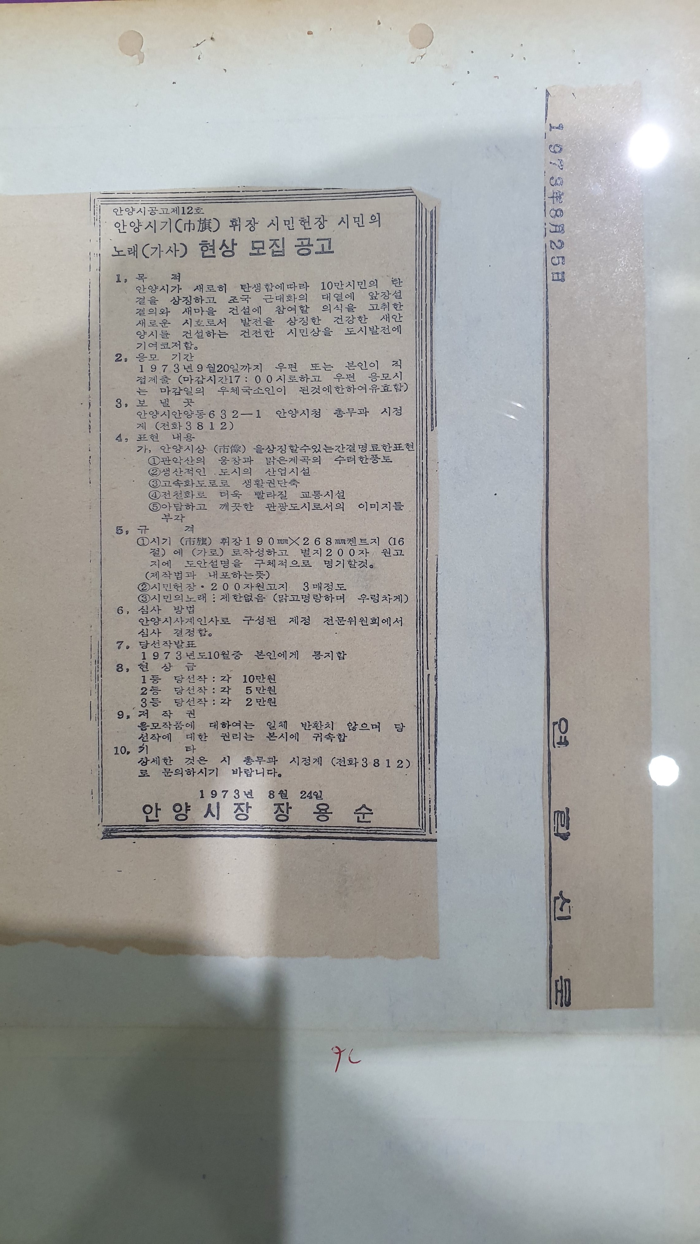 2019년 전시회에는 ‘안양시민의 노래’와 ‘안양시민헌장’ 등의 시 상징물이 제정되기까지 과정이 담긴 1973∼1974년 당시의 기록물 40여점이 선보였다.