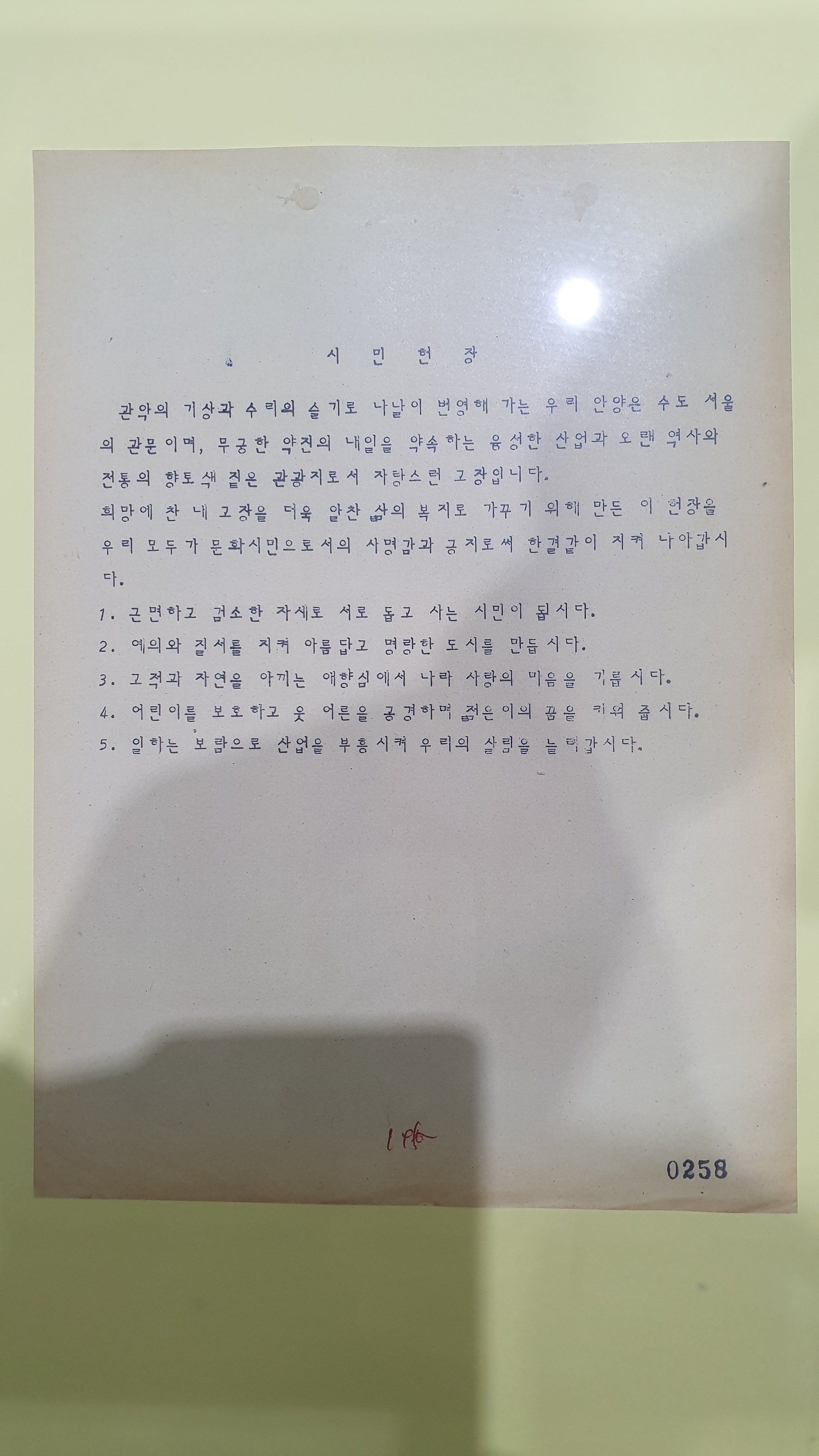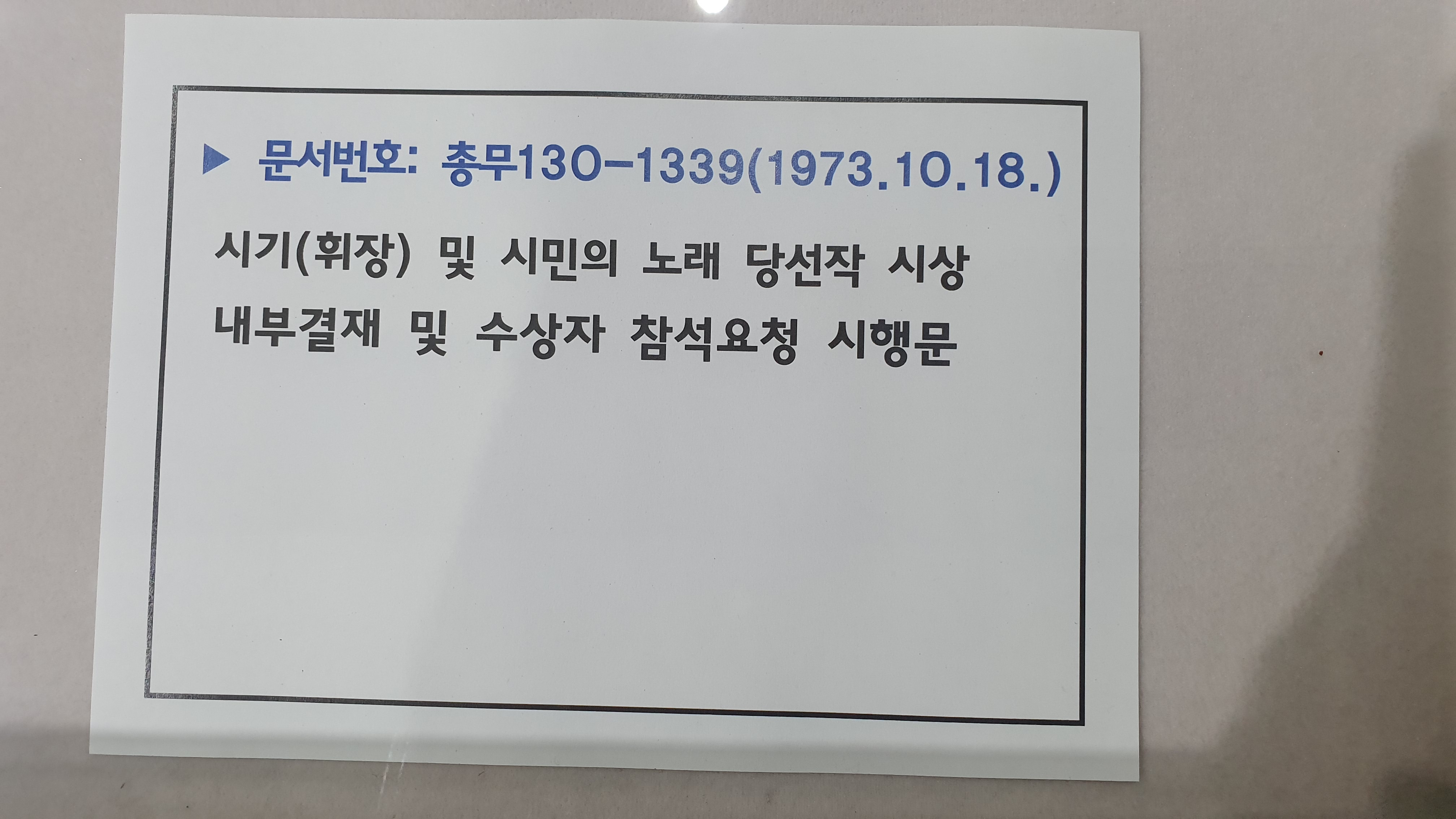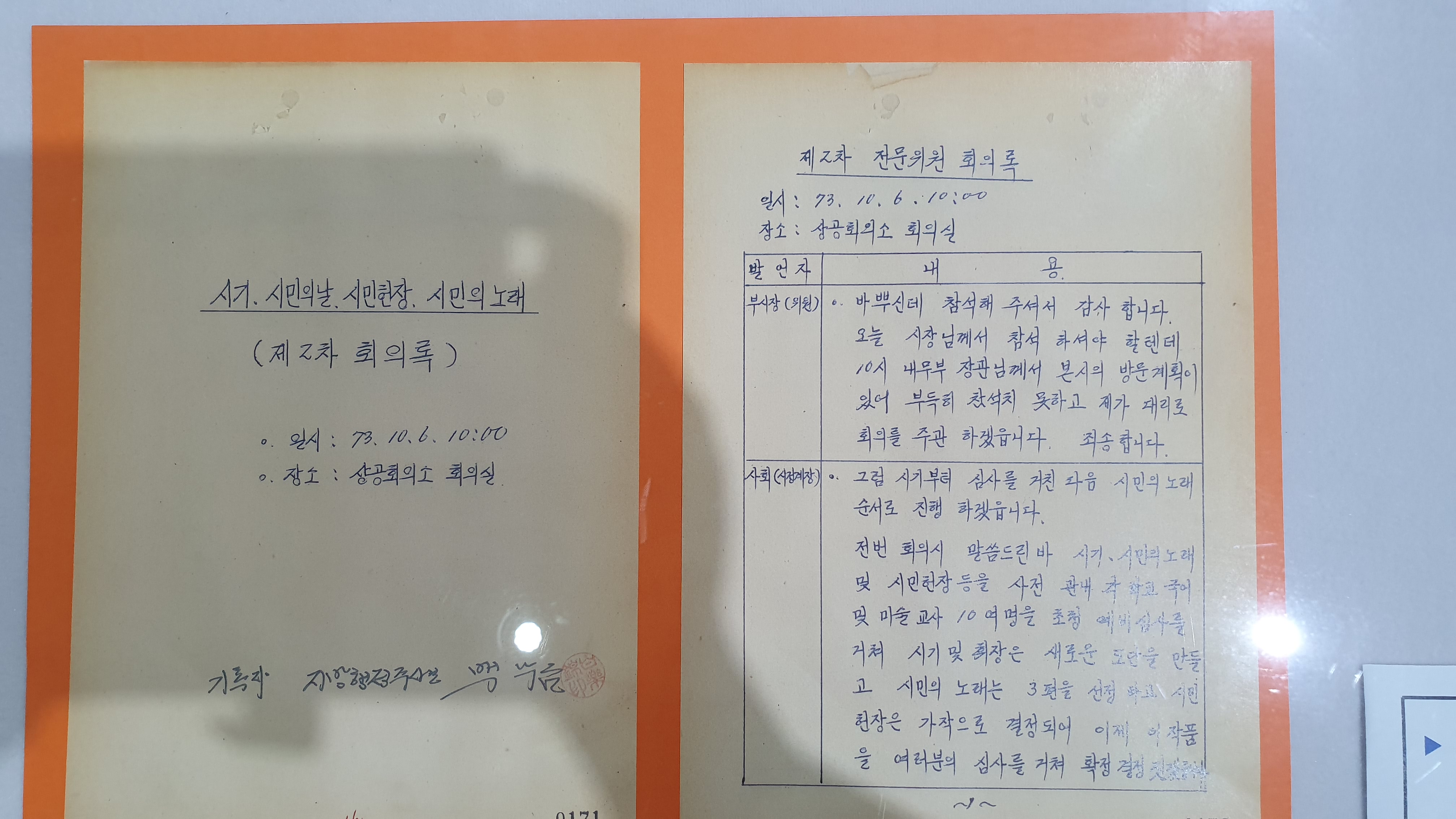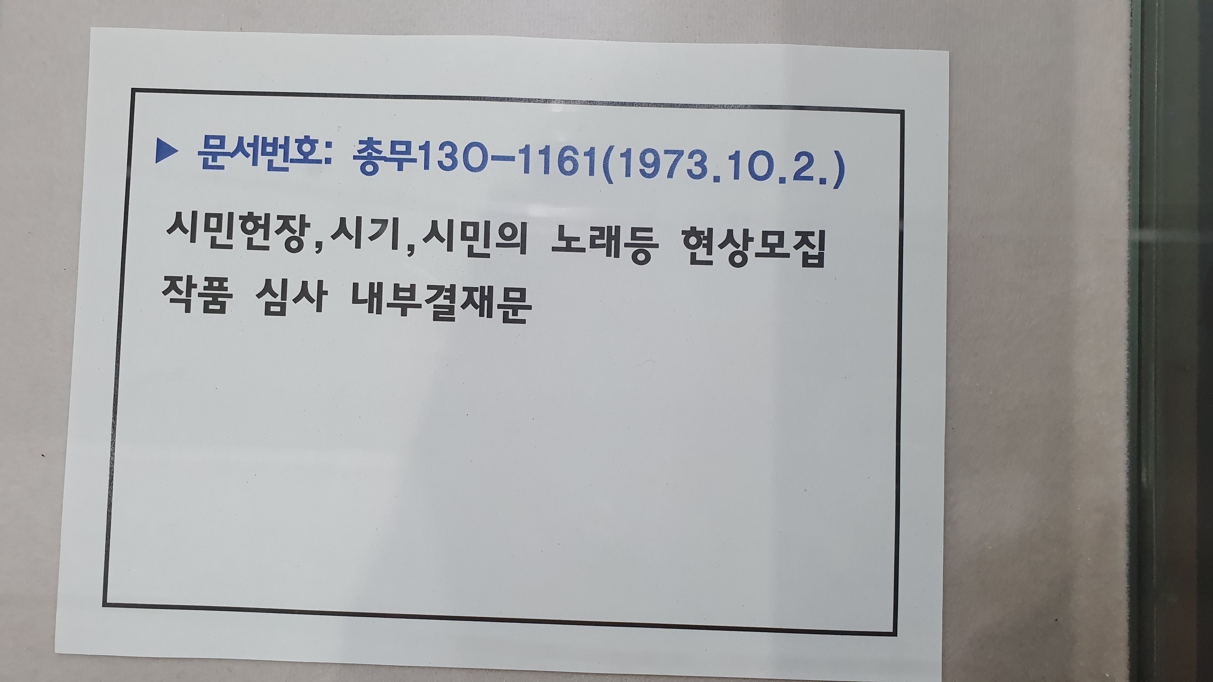 시민의 노래와 시민헌장 그리고 시기와 시휘장 제정에 따른 시민공모, 전문위원 위촉 현황, 모집결과, 당선작 시상, 두 차례에 걸친 회의록, 총평회 및 시민의견 청취 등의 문서도 전시됐다.