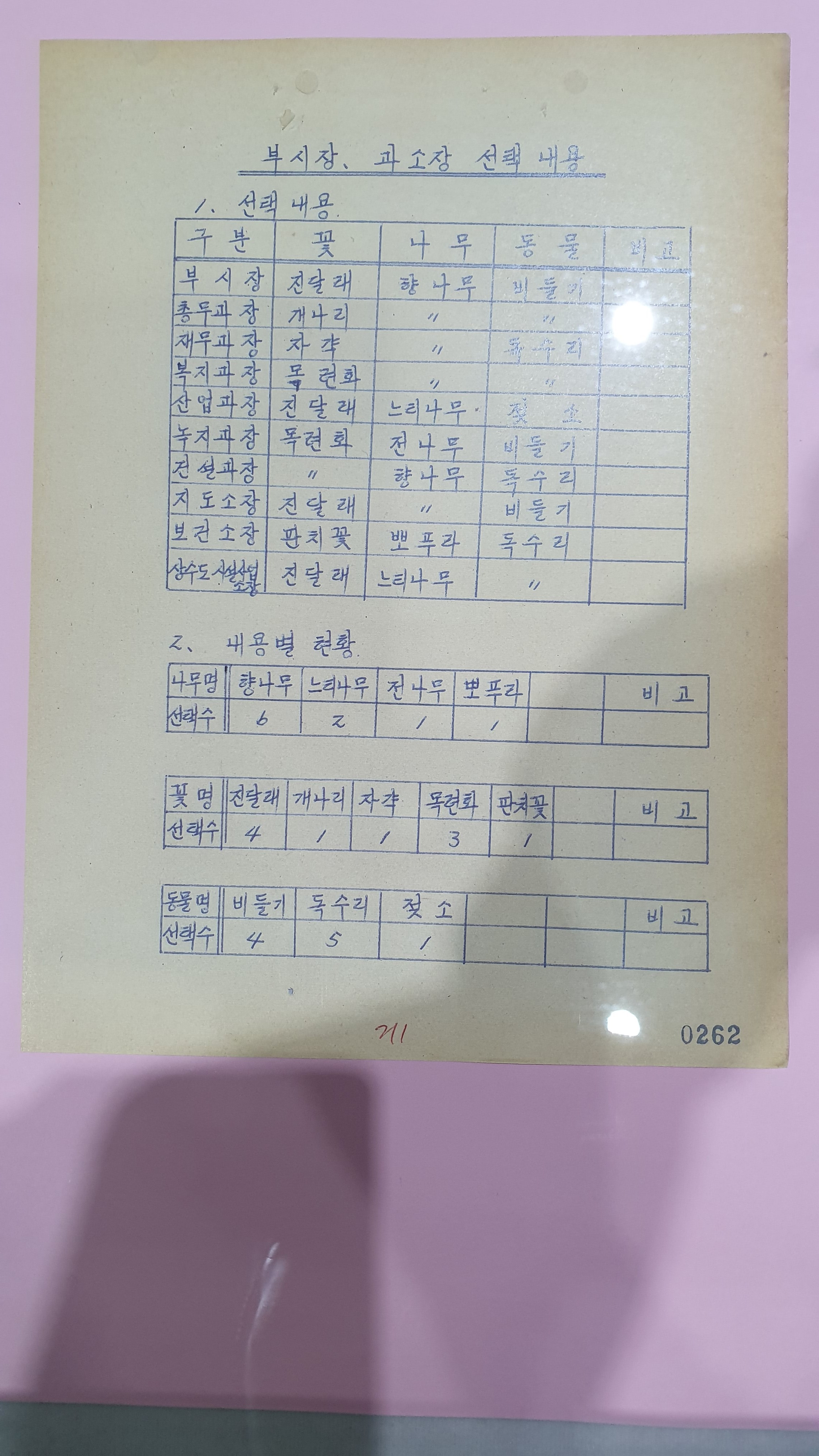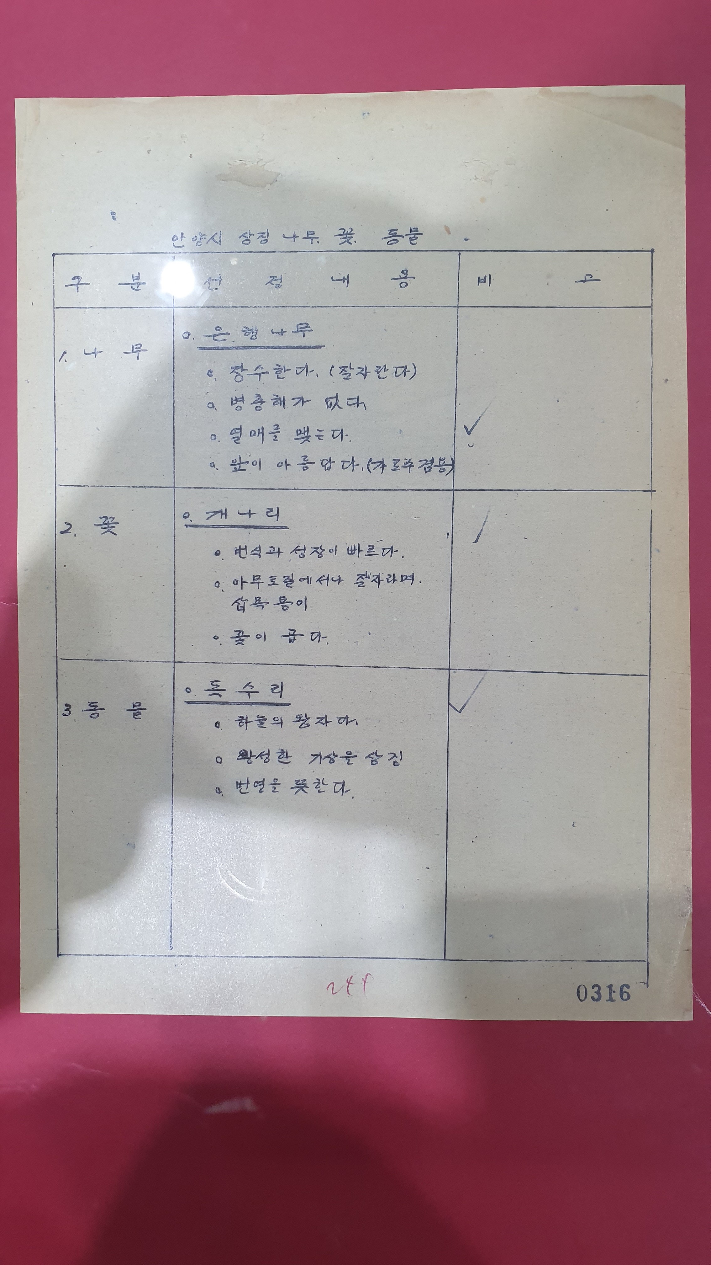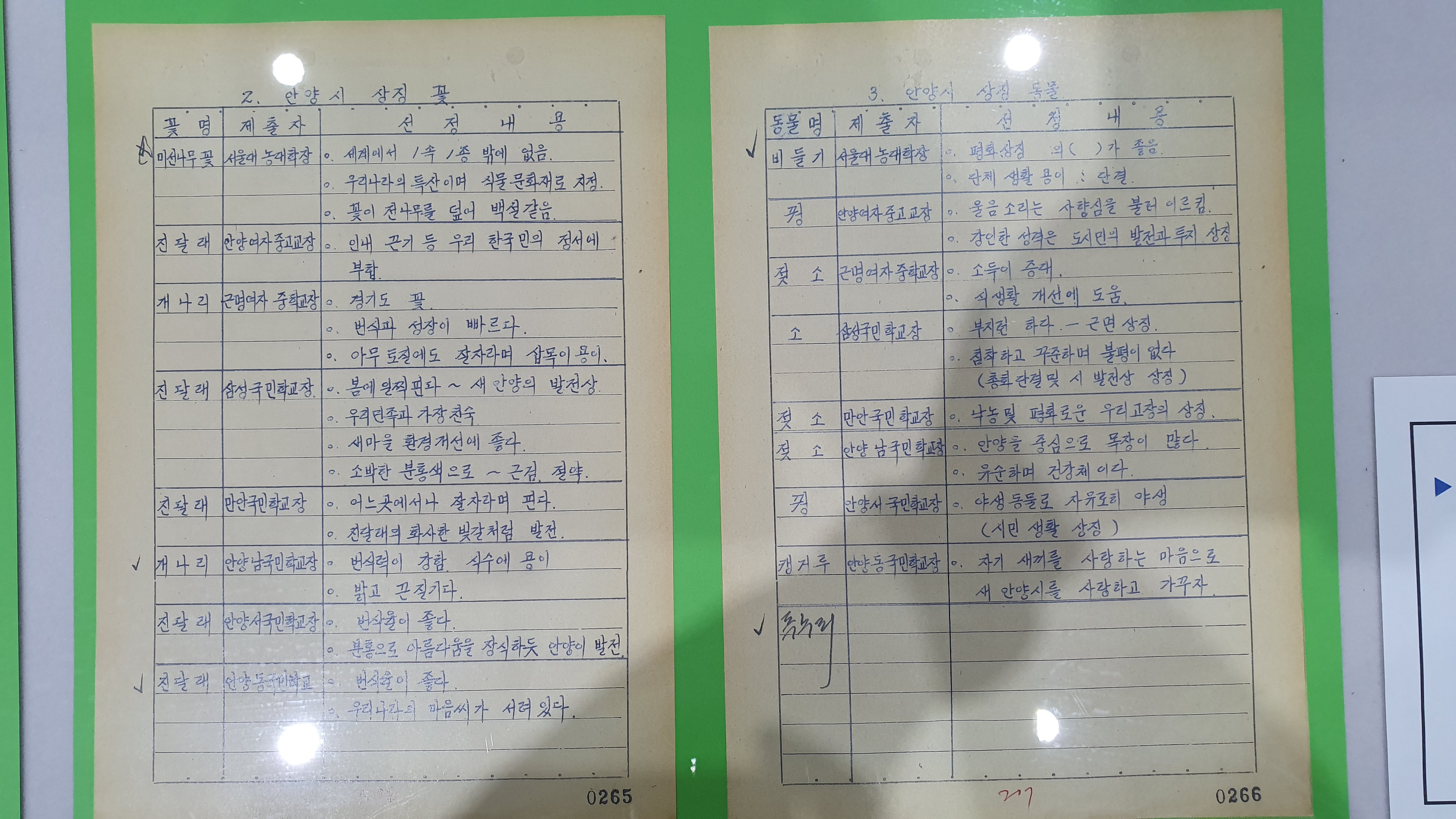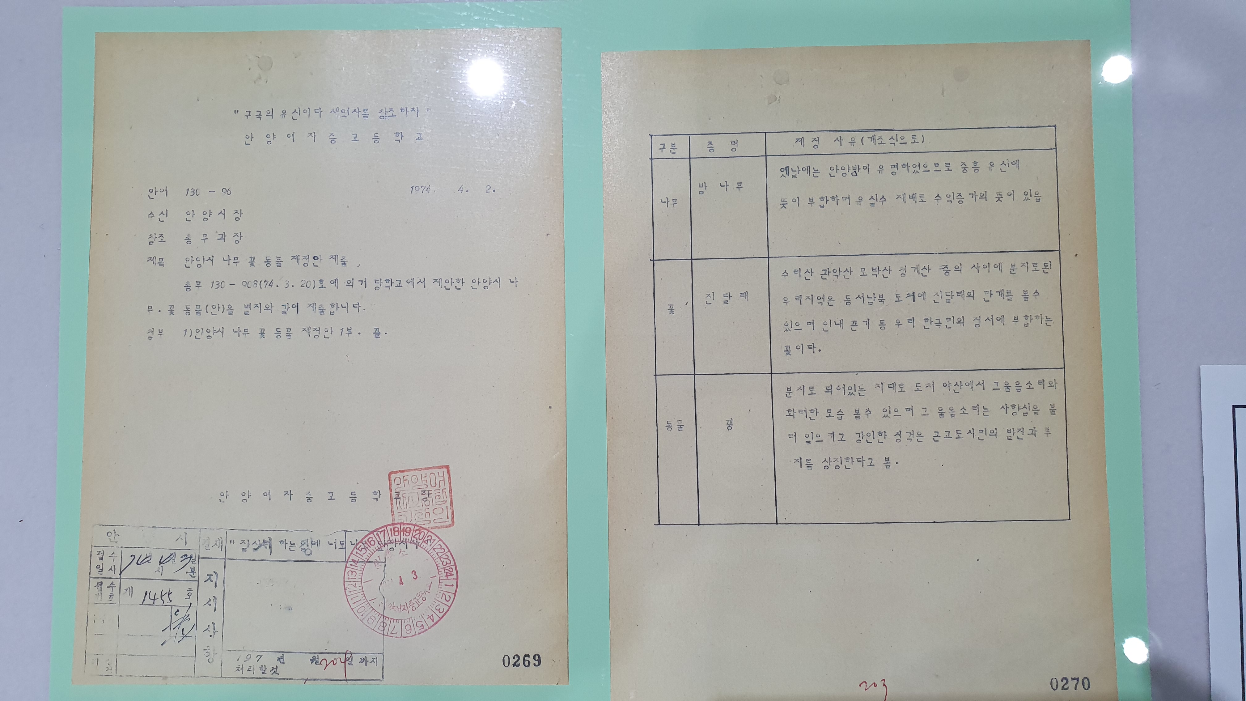 안양을 상징할 나무(향나무), 꽃(진달래), 동물(독수리) 등을 정하기까지 유관기관과 각 학교에 의뢰했던 결재문서도 있다. 특히 이채로운 것은 시 상징 동물선정 집계현황에는 독수리 말고도 캥거루, 꿩, 젖소 등도 있었다는 것이다.