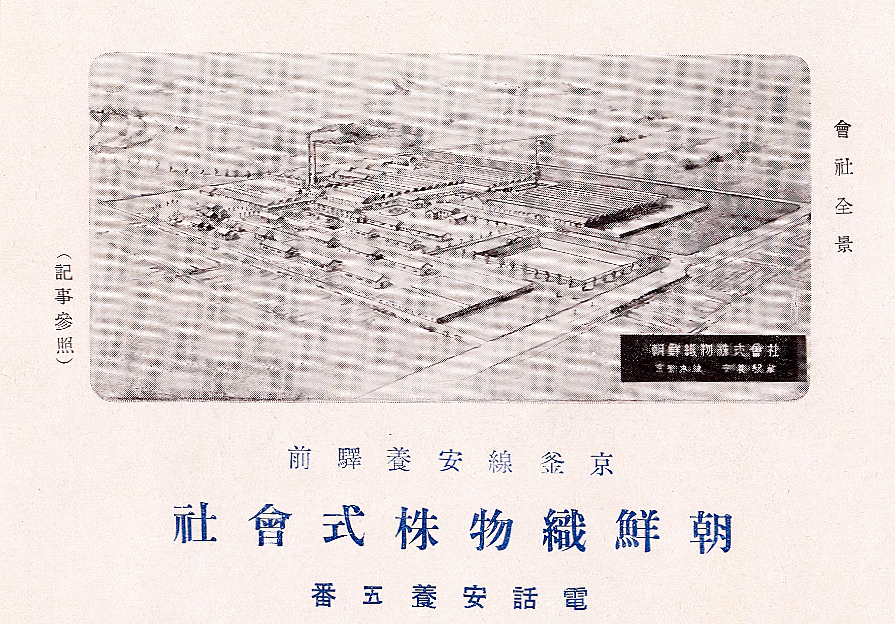 조선직물주식회사(朝鮮織物株式會社) 광고에 포함된 경성부 안양역 앞 공장 조감도(鳥瞰圖)로 공장앞 아래쪽 도로는 현재의 중앙로길이다. 북쪽(위)은 안양3동과 박달리이며, 서쪽(위왼쪽)은 안양3동 양짓말이다. 사진 아래 경부선 안양역전이라 기록한 위치 표시와 전화번호 5번 표기가 아주 이색적이다.