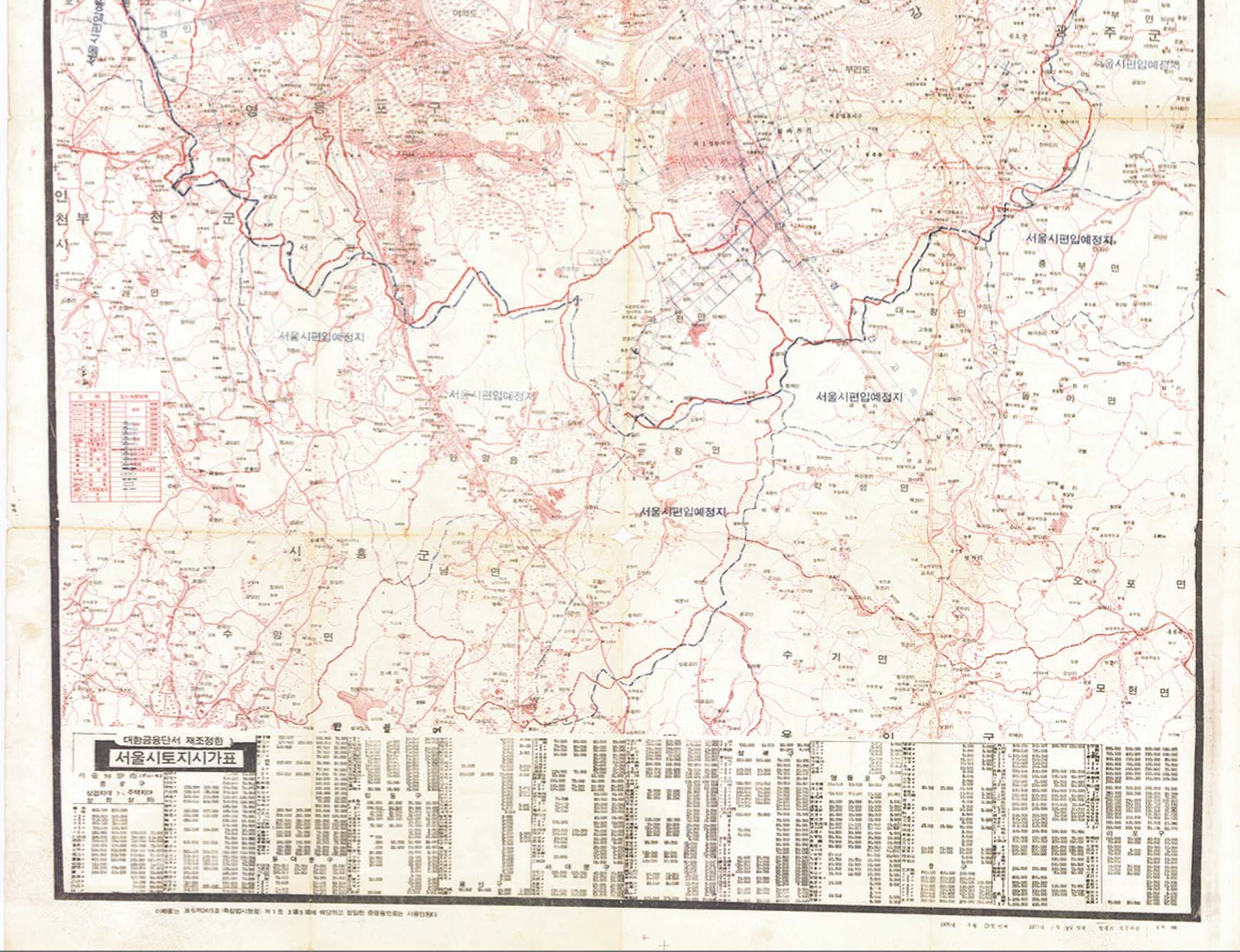 이 지도는 1971년 당시 시흥군 안양읍 등 서울 인근 경기도 일부 지역을 서울시로 편입시켜 더 튼 서울시르 만들려고 했던 당시 편입 예정지를 나타낸 기록이다. 또 한강의기적이라 불리우던 서울 여의도와강변개발+고가도로계획도+어린이왕국배치도+토지시가조사표(등)도 보여주는 자료라 할수 있다.