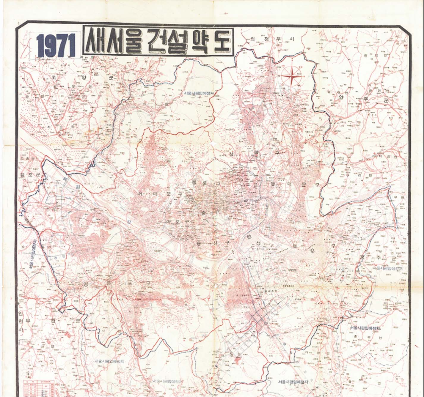 이 지도는 1971년 당시 시흥군 안양읍 등 서울 인근 경기도 일부 지역을 서울시로 편입시켜 더 튼 서울시르 만들려고 했던 당시 편입 예정지를 나타낸 기록이다. 또 한강의기적이라 불리우던 서울 여의도와강변개발+고가도로계획도+어린이왕국배치도+토지시가조사표(등)도 보여주는 자료라 할수 있다.