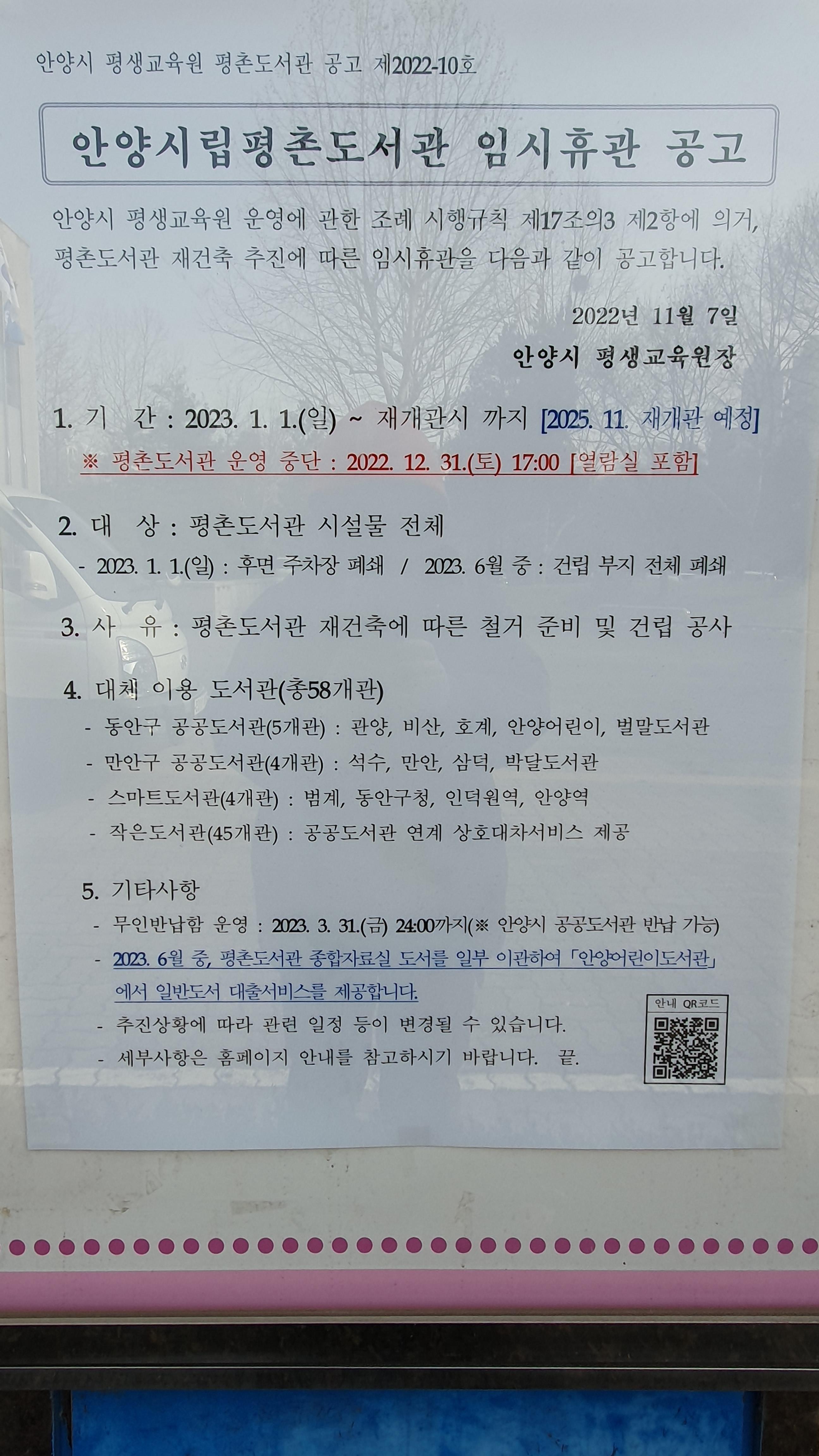 2023.02.03/ #도시기록 #평촌시립도서관/ 재건축을 위해 철거 준비중인 평촌시립도서관의 마지막 모습. 평촌도서관은 안양시 동안구 부림동(경기도 안양시 동안구 관평로 213)에 위치한 안양시에서 2번째로 지어진 공공도서관으로 1994년 개관하였다. 석수도서관이 만안구의 대표도서관이라면 평촌도서관은 동안구의 대표도서관으로 지어진지 30년이 되다보니 노후화로 재건축을 통해 2025년 11월에 재개관 예정으로 철거를 앞두고 있다.
