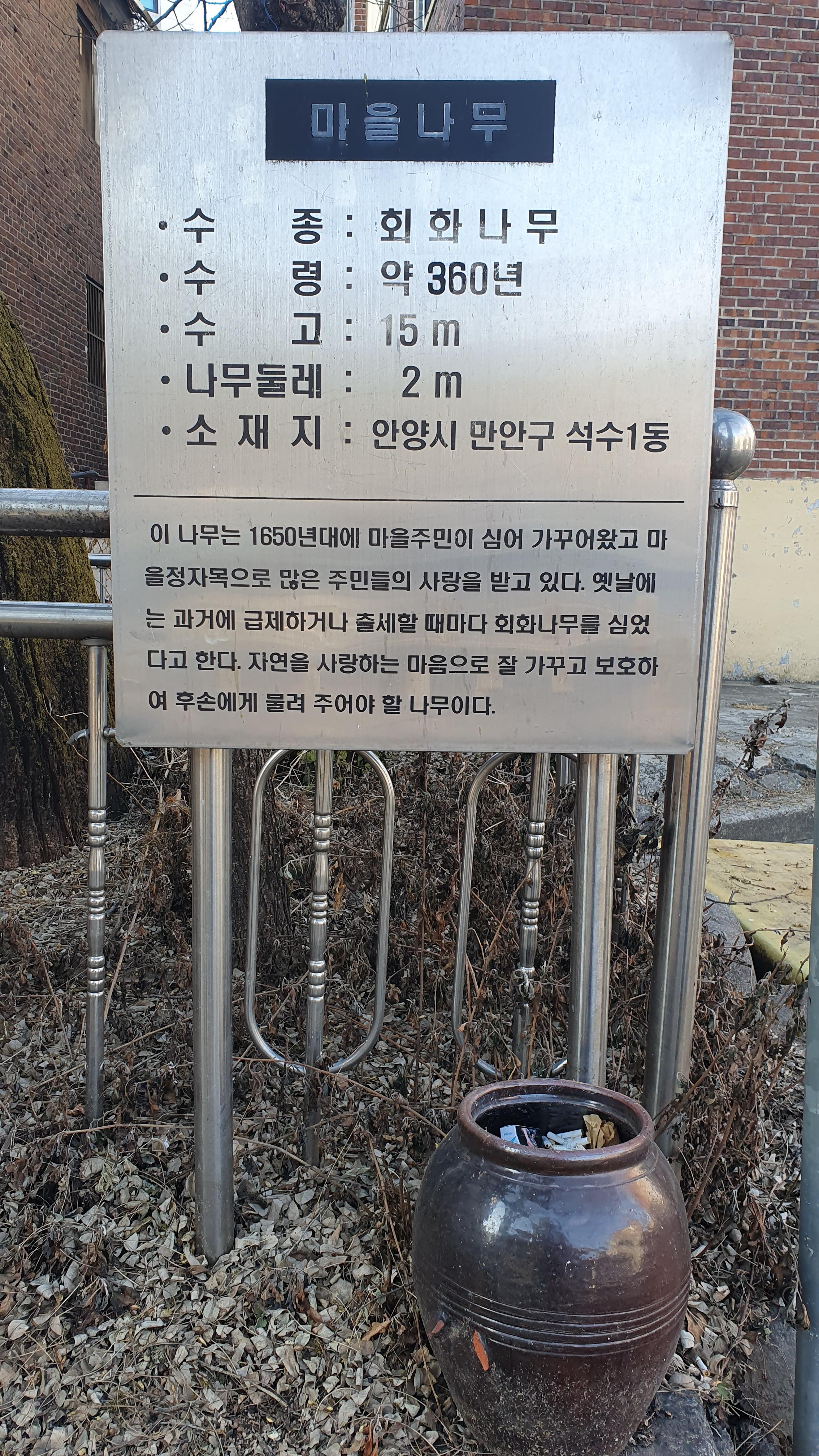 동네 주민들은 오래전부터 안양시가 보호수로 지정해 보호 및 관리대책을 마련했으면 싶다고 하나 아직은 그냥 노거수다.