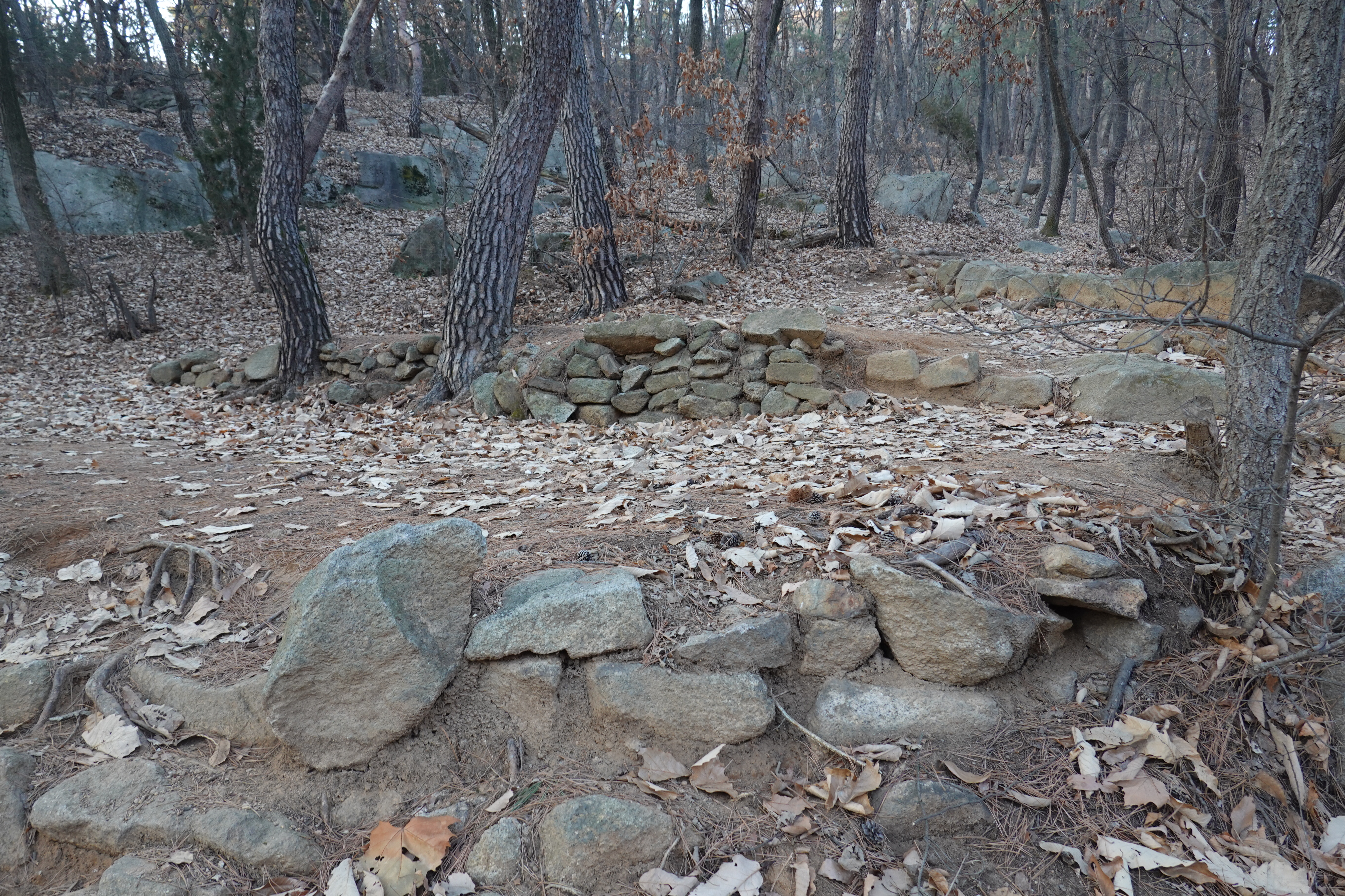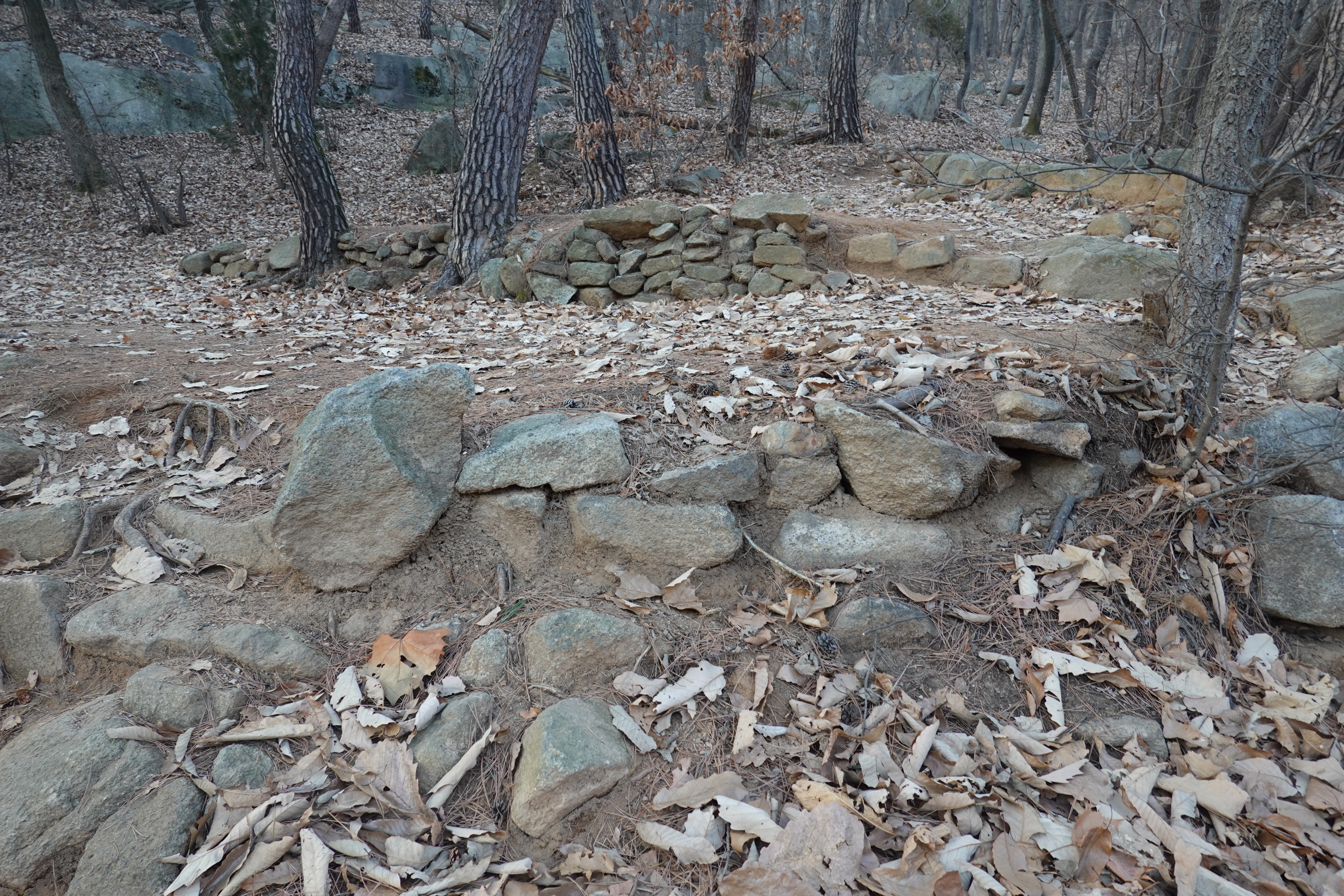 2023.02.08/ #도시기록 #안양예술공원 #집터 #흔적/ 안양사 가는길 초입 좌측 도로변 야산에서 만난 집터 또는 암자 흔적들. 겨울이 되니 봄부터 가을까지 계절에 녹음과 수풀에 가려져 보이지 않던 것들이 보인다,