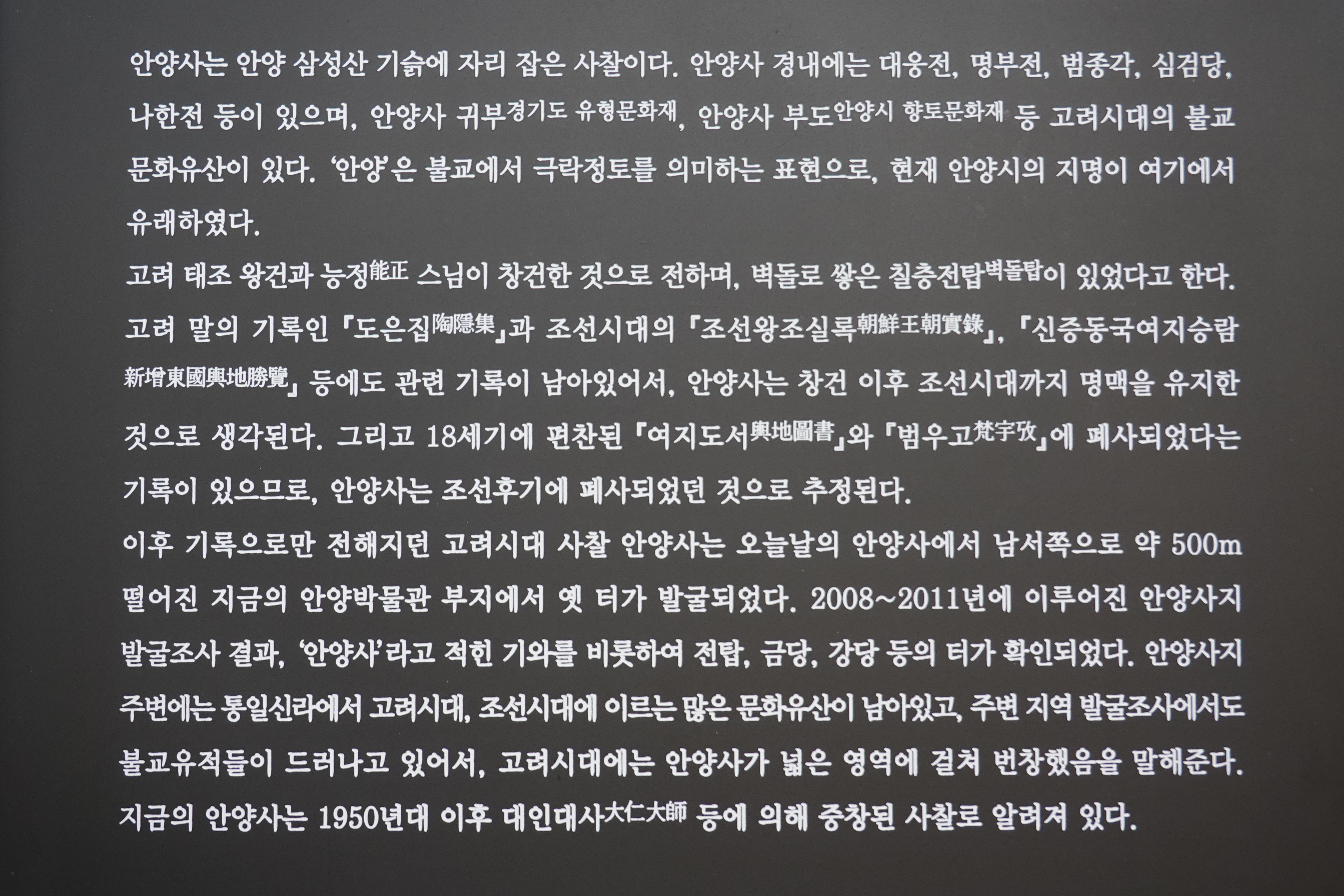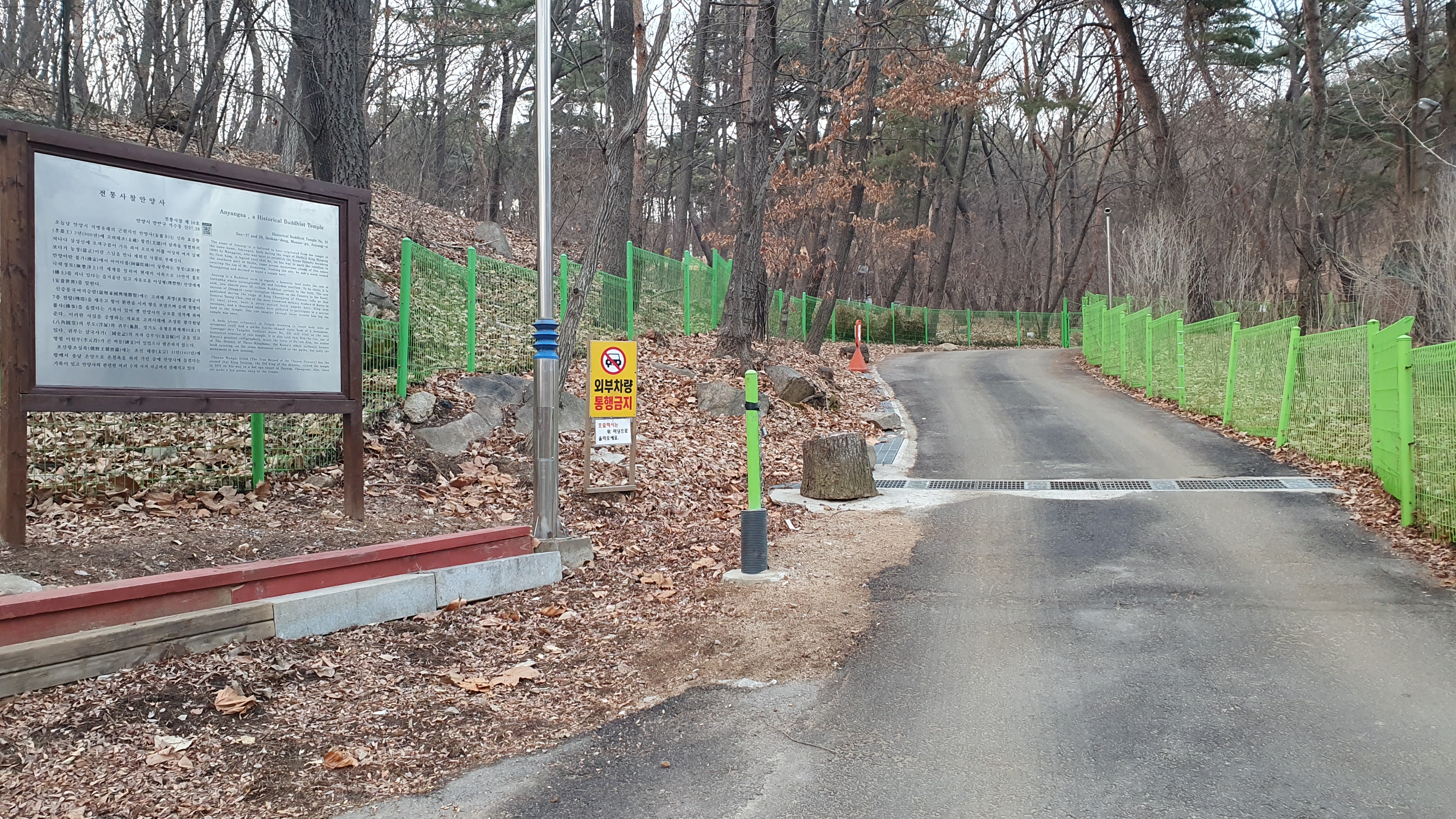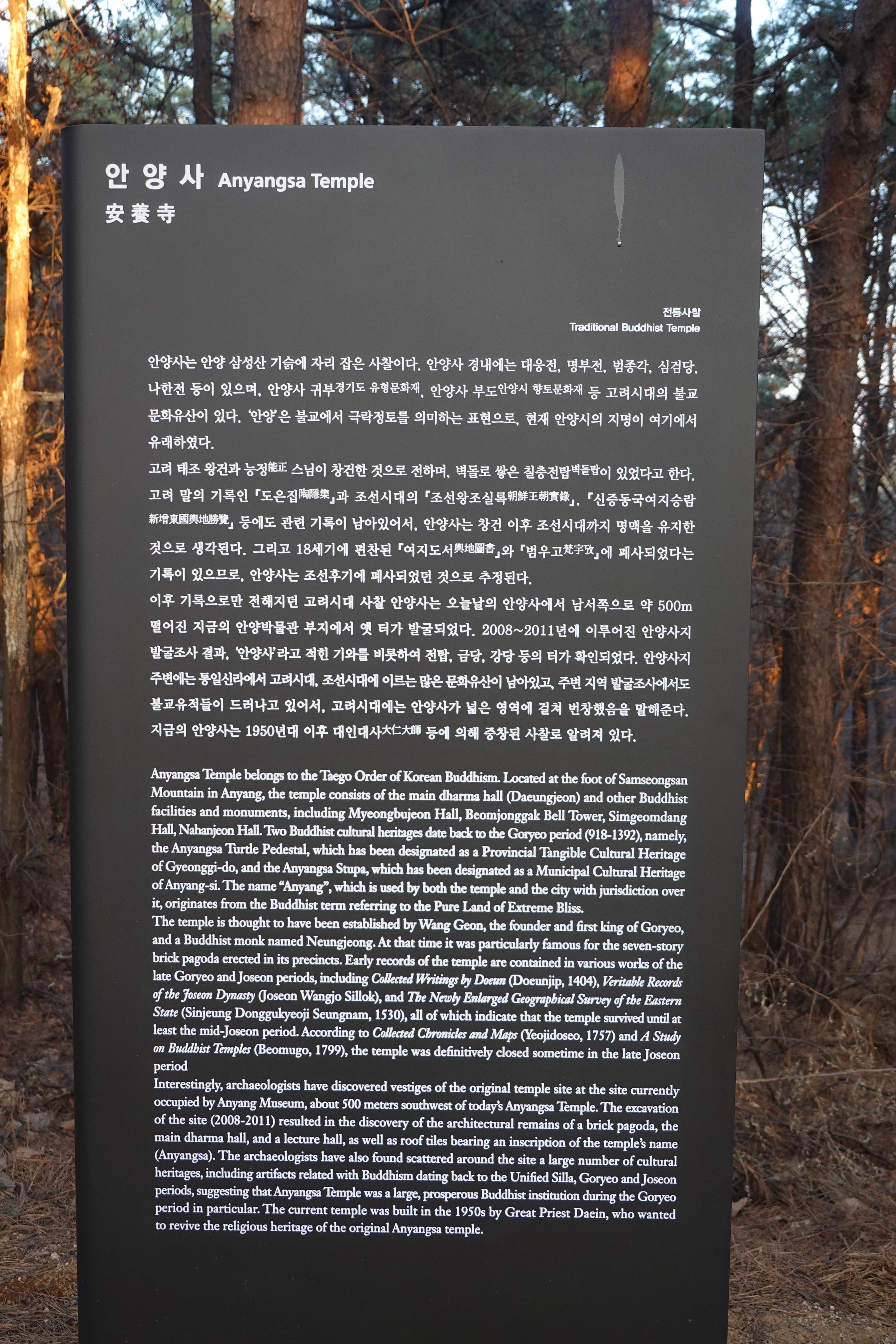 2023.02.08/ #도시기록 #안양 #사찰 #안양사 #안양예술공원 #만문누리/ 고려 태조때 창건했다가 조선시대 폐사된 절 안양사(현 안양박물관 자리)와 1950년대 새로 지어진 현존하는 절 안양사가 다른 절임에도 명칭이 같다보니 혼란(한국관광공사 홍보게시글 등에 있어 잘못 기재됨)을 일으키고 현재의 안양사 절 입구 표지판 글도 마치 고려시대부터 존재했던 쳔년고찰 안양사로 소개하는 오류들을 범하고 있다고 누차 지적을 해왔는데 드디어 절 입구 표지판이 교체됏다, 절 초입 안내판에는 고려시대 안양사에 대해 설명하고 새롭게교체된 절 입구 표지판에는 현존하는 안양사가 고려시대 사찰이 아니라 1950년대 이후 중창된 사찰임을 표기하고 있다. 그런데 과거 기록들과 현재의 안양사에 현존하는 귀부 등을 보면 옛 안양사의 규모가 현존하는 안양사까지 포함하는 절터가 아니었을까 추정해본다.