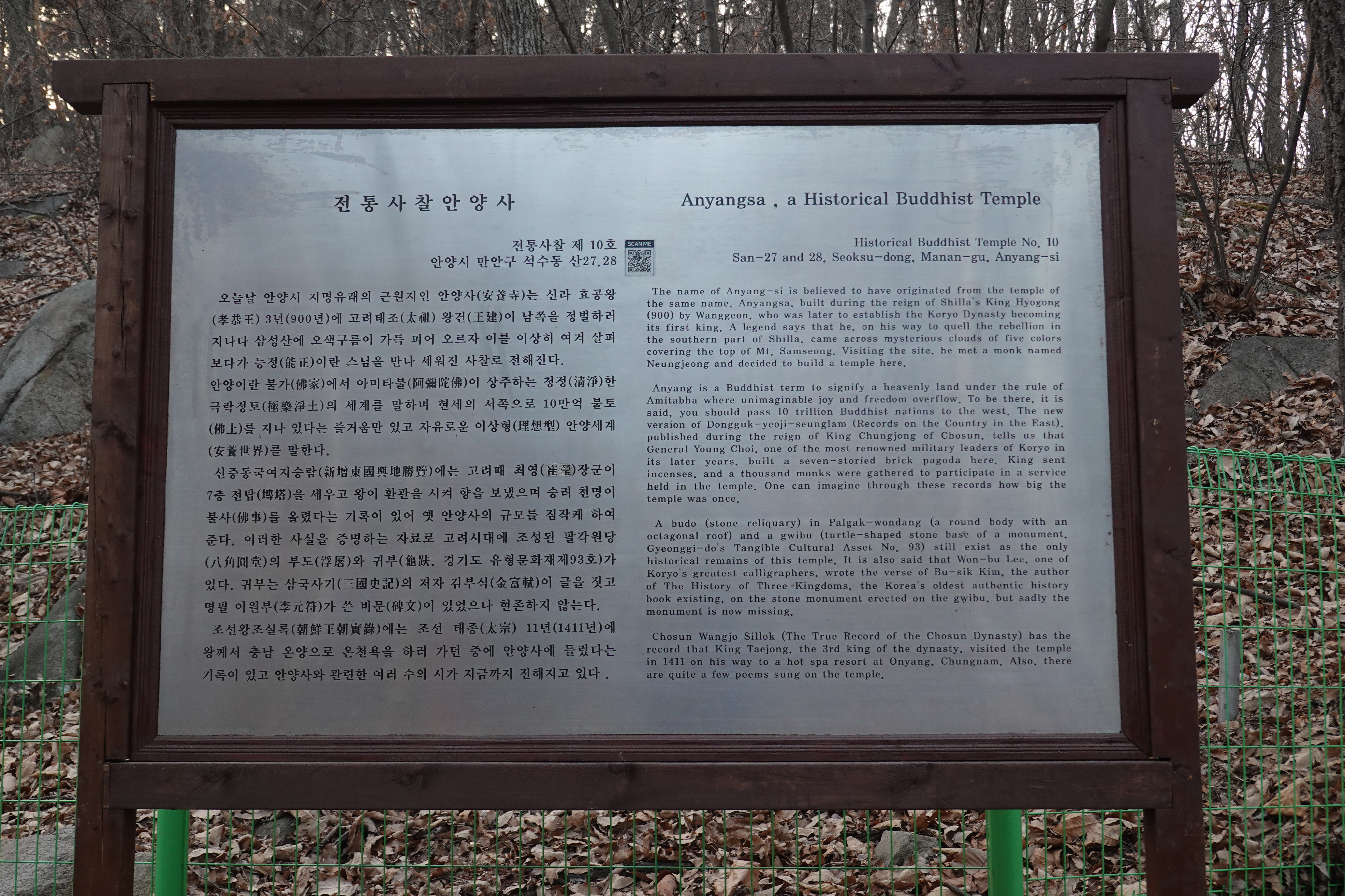 2023.02.08/ #도시기록 #안양 #사찰 #안양사 #안양예술공원 #만문누리/ 고려 태조때 창건했다가 조선시대 폐사된 절 안양사(현 안양박물관 자리)와 1950년대 새로 지어진 현존하는 절 안양사가 다른 절임에도 명칭이 같다보니 혼란(한국관광공사 홍보게시글 등에 있어 잘못 기재됨)을 일으키고 현재의 안양사 절 입구 표지판 글도 마치 고려시대부터 존재했던 쳔년고찰 안양사로 소개하는 오류들을 범하고 있다고 누차 지적을 해왔는데 드디어 절 입구 표지판이 교체됏다, 절 초입 안내판에는 고려시대 안양사에 대해 설명하고 새롭게교체된 절 입구 표지판에는 현존하는 안양사가 고려시대 사찰이 아니라 1950년대 이후 중창된 사찰임을 표기하고 있다. 그런데 과거 기록들과 현재의 안양사에 현존하는 귀부 등을 보면 옛 안양사의 규모가 현존하는 안양사까지 포함하는 절터가 아니었을까 추정해본다.