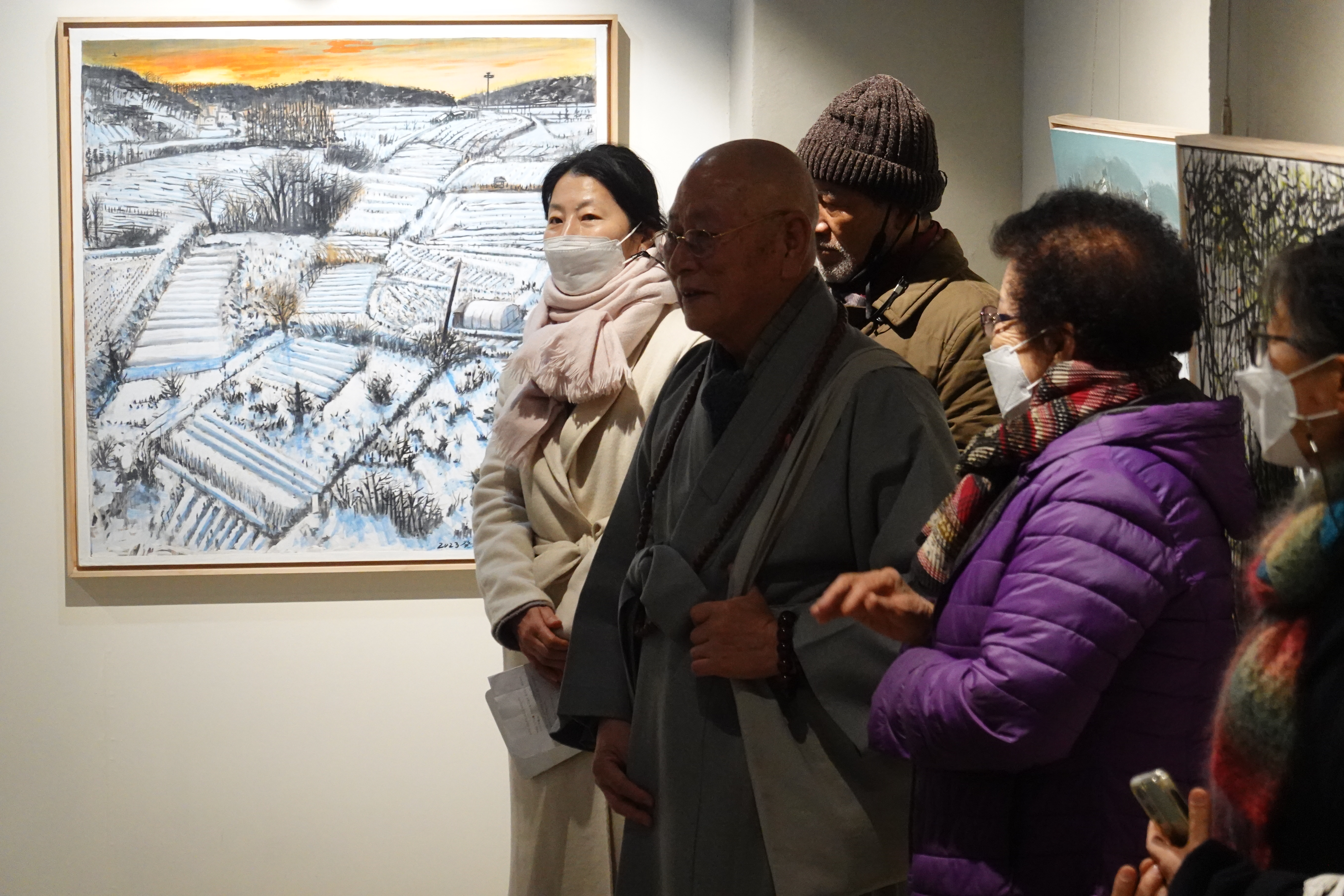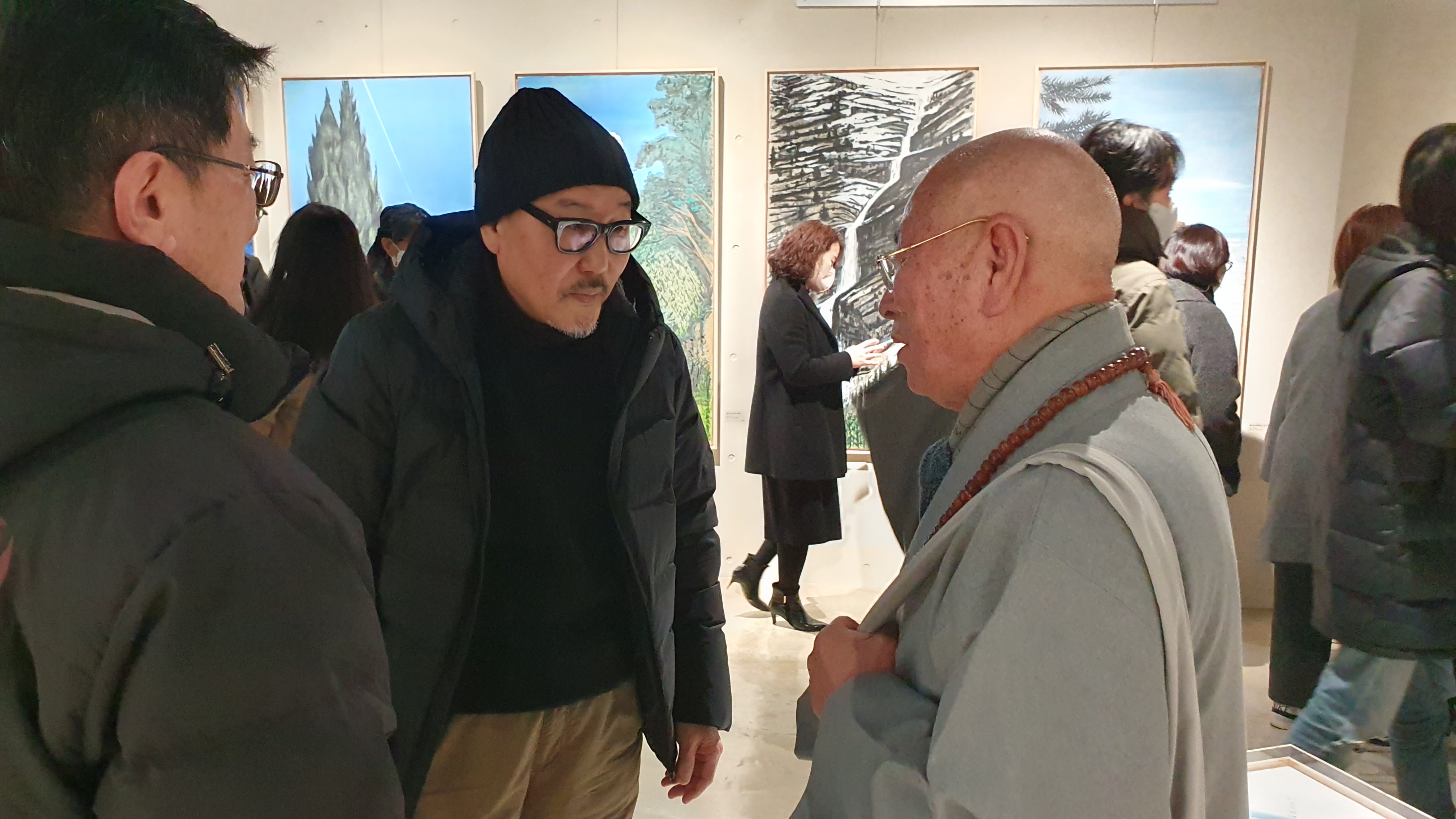 지난 8일 안양예술공원 안양사 가는길 초입에 새로문을 연 전시공간 ‘두나무아트큐브’에는 박찬응 작가의 첫 전시회를 축하해 주기 위해 멀리는 프랑스 노르망디에서 온 박친응의 벗이된어느 가족을 비롯 가족, 친구, 지인, 독자 등 80여명이 모여 흡사 잔칫날 같은 분위기속에서 축하물결이 이어졌다. 개인적으로 80년대 근로자회관총무로 활동할 때 만났던 우리그림 회원이었던 홍대봉스님, 권윤덕 작가, 이억배 작가도 근 20여년만에 만나고 코로나르 수년동안 보지 못했던 이들도 볼 수 있었다,.만남을 이어준 박찬응 아우님 고마우이. 첫 작품 전시회 큰맘으로 축하하면서.