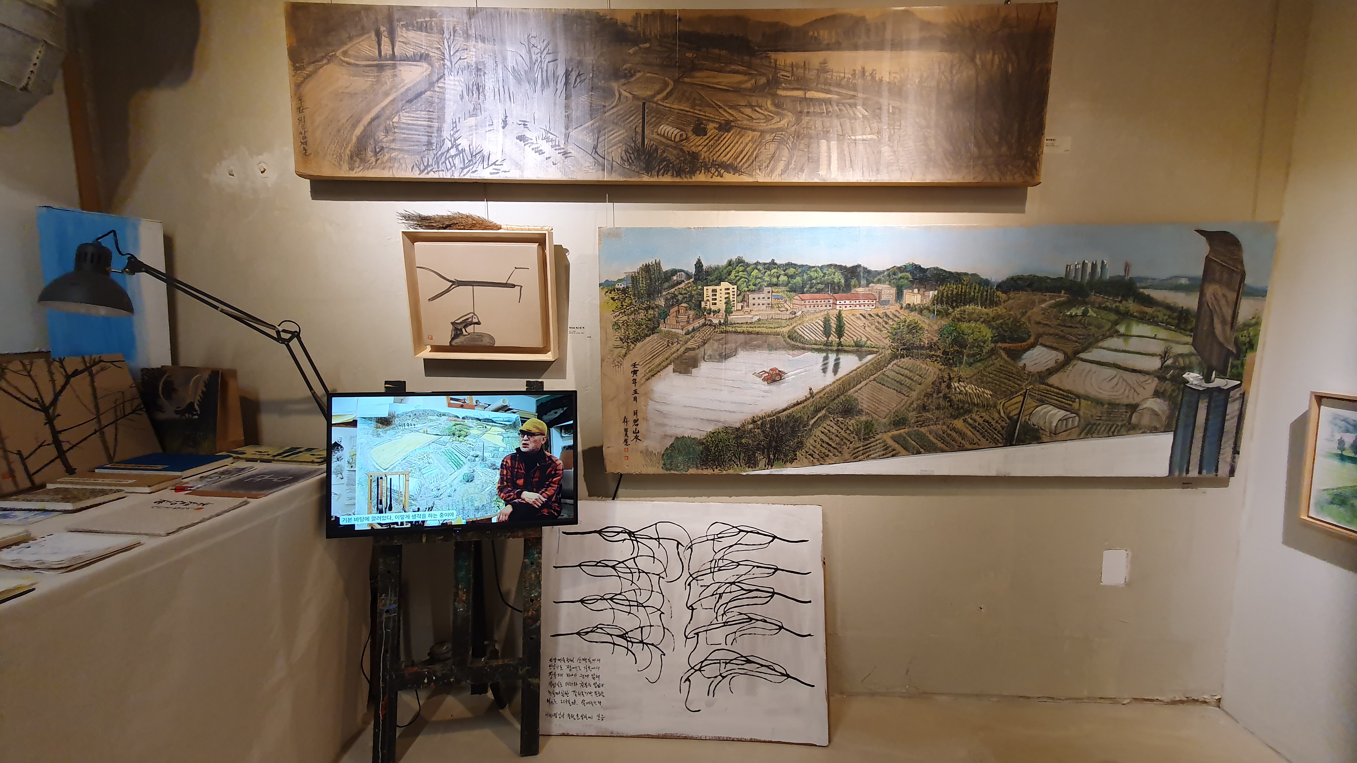 2020년 무렵 아들이 사는 프랑스 노르망디 해안가와 절벽에서 오랫동안 붓을 놓았던 그림을 그,리더니 왕송후수와 물덤방이 있는 본인이 사는 의왕 왕송호수 주변의 산과 들을 그리고 안양군포의왕 중심은 어디일까 관악산과삼성산.수리산과모락산으로 둘러싸이고 안양천을 비롯 학의천,수암천, 삼성천,삼막천,산본천 등 지천들이 흐르는 안양군포의왕 산수지도를 그리는 등 창작의 세계로 빠져들더니 한국과 프랑스를 오가며 그린 그림으로 그의 셍애 첫 작품전시회 ‘표류이야기’를 개최했다. 마을과 도시를 캔버스 삼아 작업하던 그가 이제는 자신만의 화폭에서 표류를 시작한 것이다.