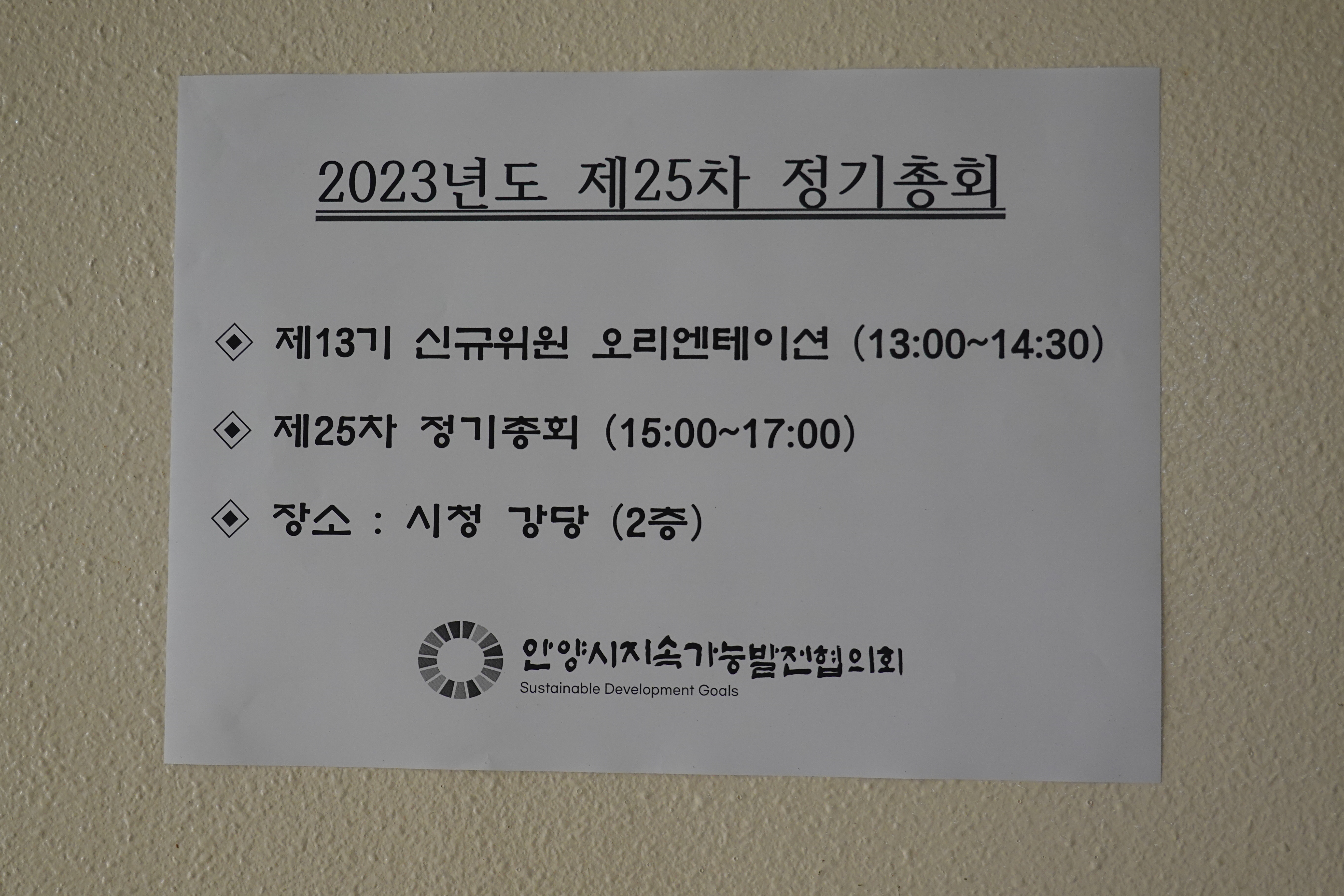 특히 2015년 9월 미국 뉴욕에서 개최된 제70차 UN 정기총회_ ‘유엔지속가능발전정상회의 2015에서 2016년부터 2030년까지 추진할 <우리가 사는 세상의 전환 : 2030년까지의 지속가능한 발전 의제>를 의결하고 <유엔 지속가능발전목표(SDGs : Sustainable Development Goals)> 17개 주요목표와 169개 세부목표를 채택함에 따라 보다 더 나은 세상을 위한 국제사회, 중앙·지방정부, 시민, 기업 등 각계의 참여와 협력을 통한 전세계의 노력이 필요하기에 안양지속협 활동 또한 사회 전반적으로 확대되면서 안양시 관련 주무 담당 주무부서도 2023년 새해 들어 바뀌었다. 그동안은 도로교통환경국 환경정책과 담당이었으나 기획경제실 정책기획과로 바뀜에 따라 사무실도 6층에서 2층으로 이전했다. 13기 위원들의 2023년 활약이 기대된다.