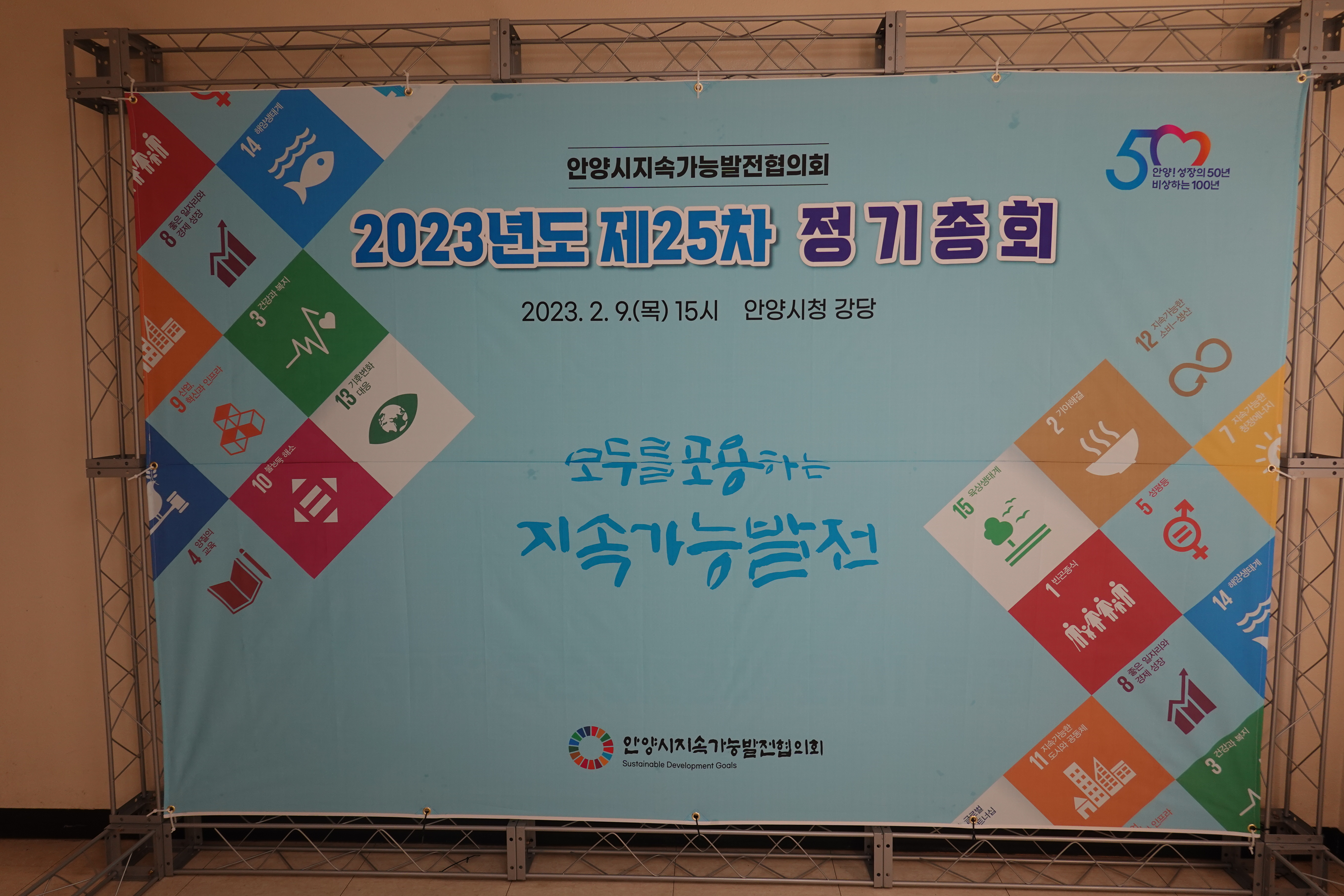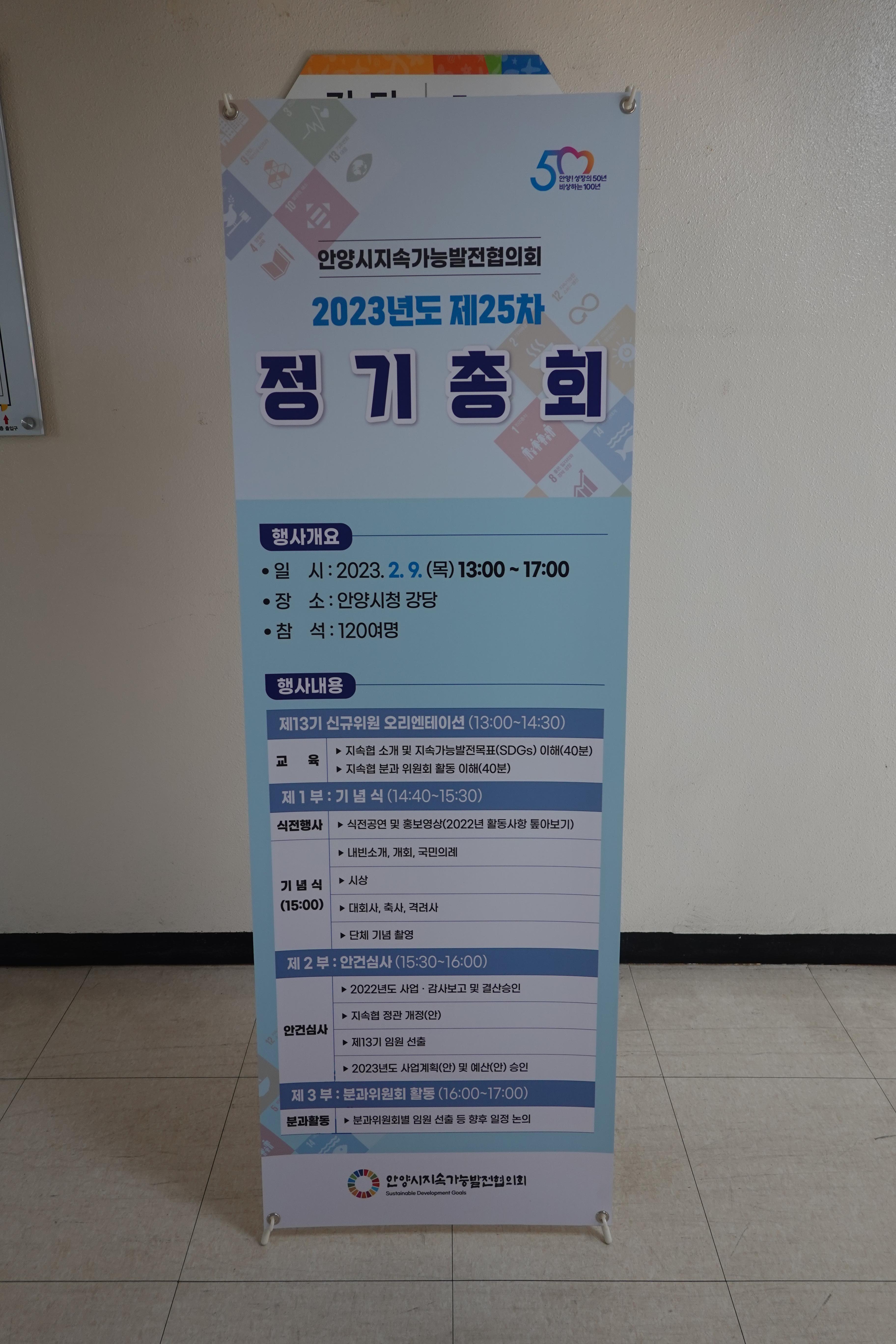 특히 2015년 9월 미국 뉴욕에서 개최된 제70차 UN 정기총회_ ‘유엔지속가능발전정상회의 2015에서 2016년부터 2030년까지 추진할 <우리가 사는 세상의 전환 : 2030년까지의 지속가능한 발전 의제>를 의결하고 <유엔 지속가능발전목표(SDGs : Sustainable Development Goals)> 17개 주요목표와 169개 세부목표를 채택함에 따라 보다 더 나은 세상을 위한 국제사회, 중앙·지방정부, 시민, 기업 등 각계의 참여와 협력을 통한 전세계의 노력이 필요하기에 안양지속협 활동 또한 사회 전반적으로 확대되면서 안양시 관련 주무 담당 주무부서도 2023년 새해 들어 바뀌었다. 그동안은 도로교통환경국 환경정책과 담당이었으나 기획경제실 정책기획과로 바뀜에 따라 사무실도 6층에서 2층으로 이전했다. 13기 위원들의 2023년 활약이 기대된다.