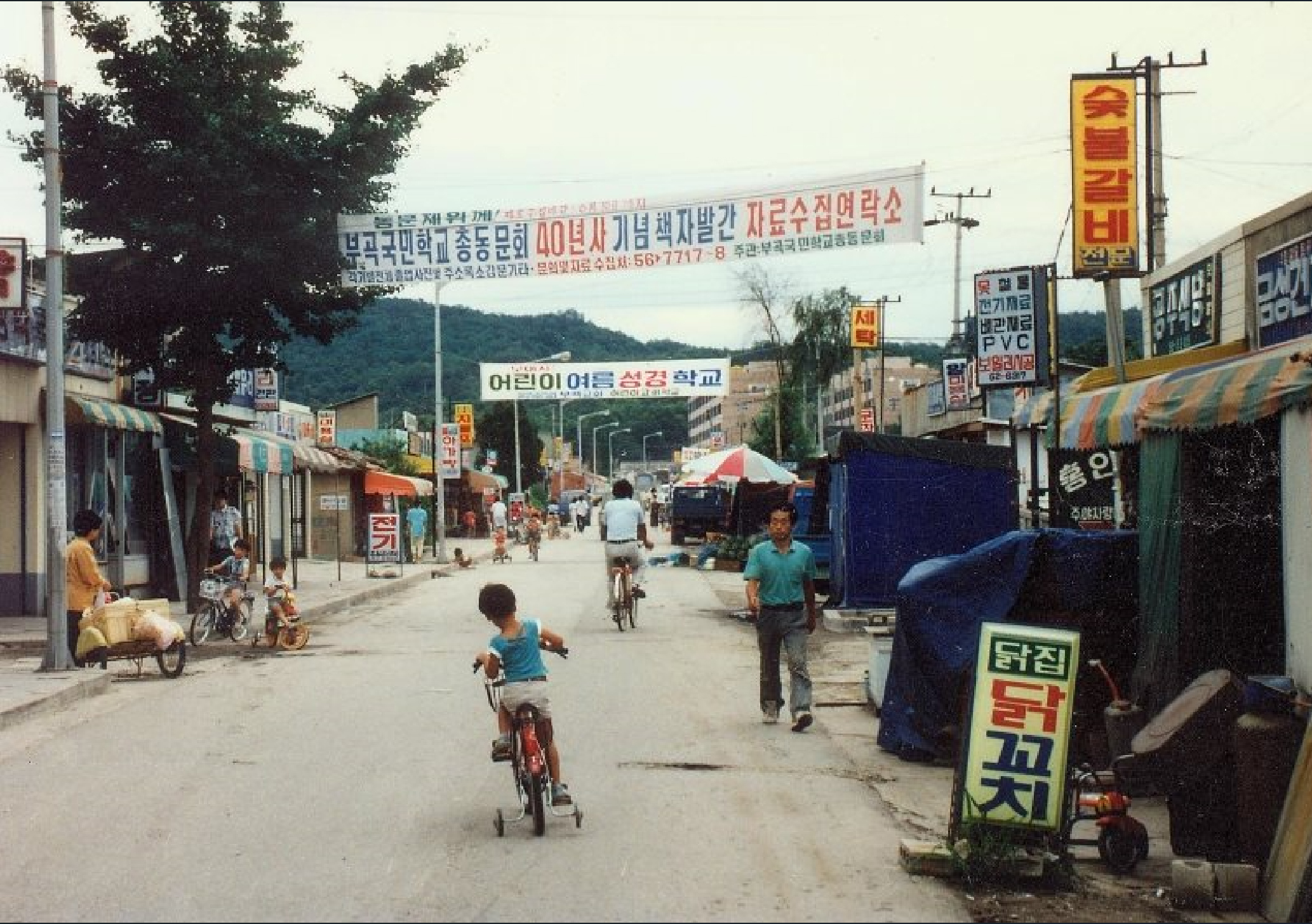 2023.02.13/ #아카이브 #옛사진 #도시기록 #의왕 #1986년/ 1986년 의왕 부곡동의 풍경이다. 의왕역에서 덕성초등학교 가는 길(현 부곡 중앙로) 주변 모습으로 사진속 멀리 우측에 보이는 5층 높이의 건물이 부곡 우성4차아파트이다. 공주식당, 금성건재, 양미용실 등 가게 상호가 적힌 간판과 더불어 숯불갈비, 닭꼬치, 세탁소, 지물포, 아가방, 약 간판도 보인다. 도로 위에는 풀랜카드가 내걸렸는데 부곡국민학교 총동문회 40년사 기념책자발간 자료수집연락소라 적혀있다.