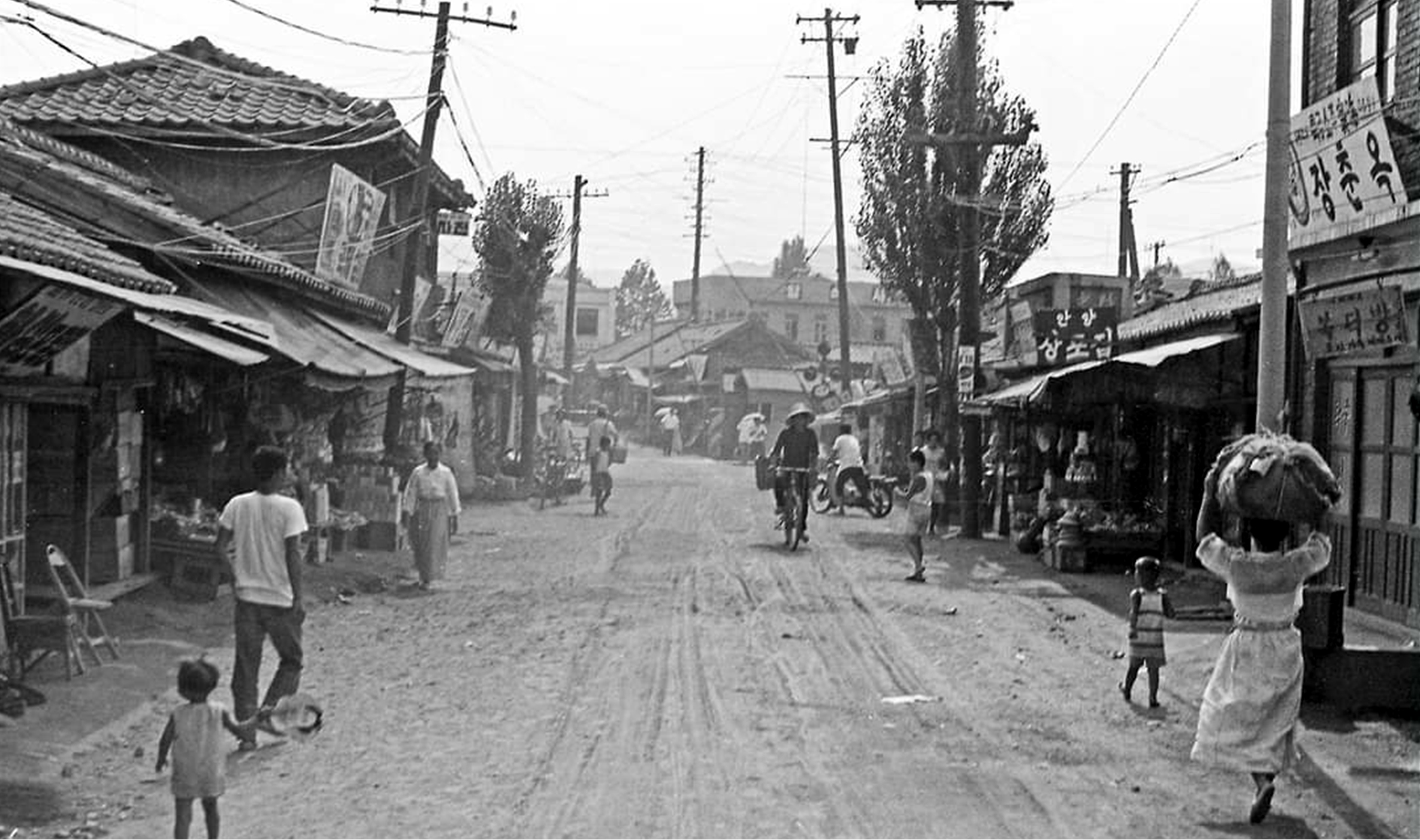 사진은 1920~1960년대 말까지 시흥군에서 상권이 가징 컸던 안양읍 시대동(市垈洞.)으로 구시장이라 불리우던 현 안양1동의 1968년도 풍경으로 석수동 미군부대(83보급대대)에서 전령으로 근무했던 닐 미샬로프가 찍은 기록으로 수푸루지와 인덕원 그리고 과천가는 안양읍내 옛길 주변의 모습이다.
