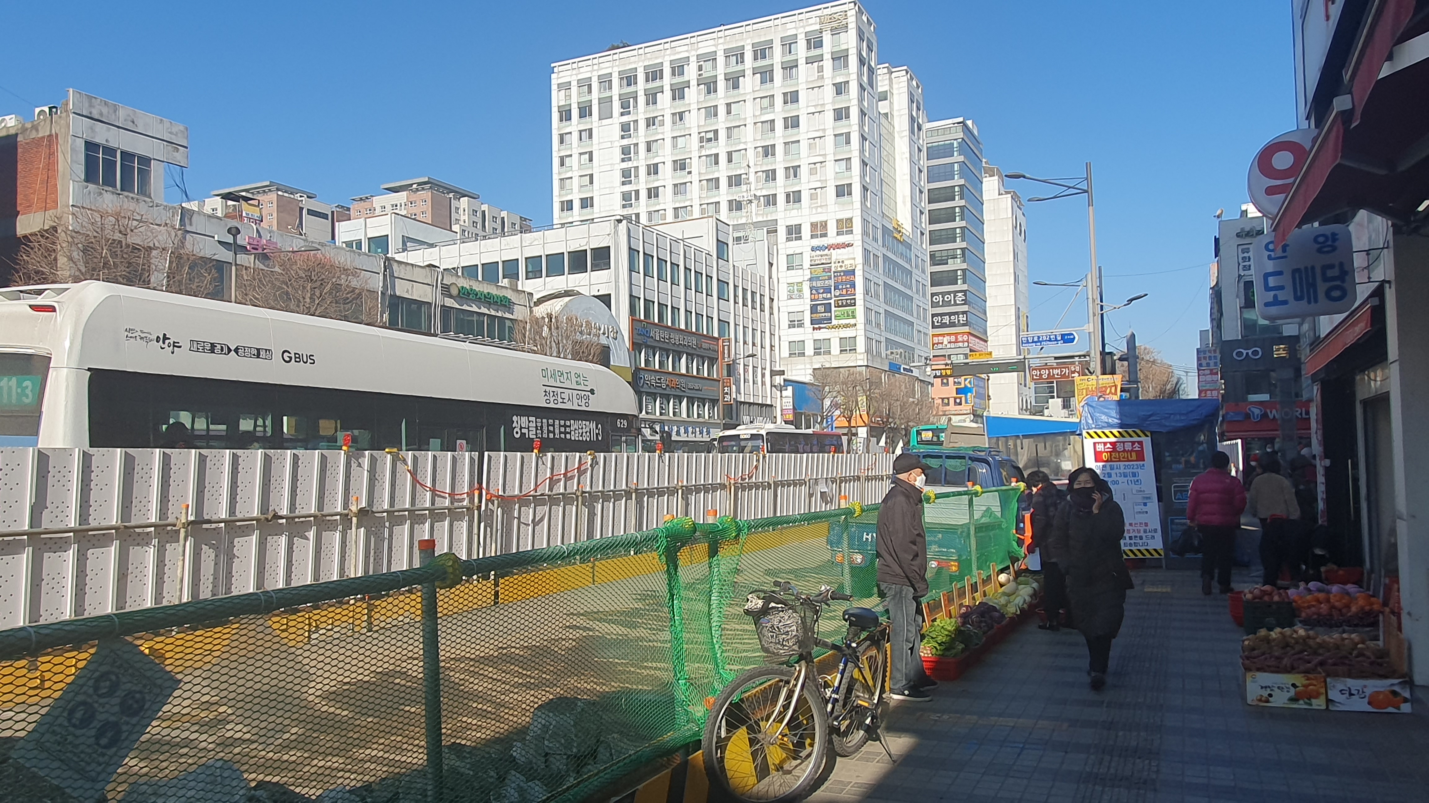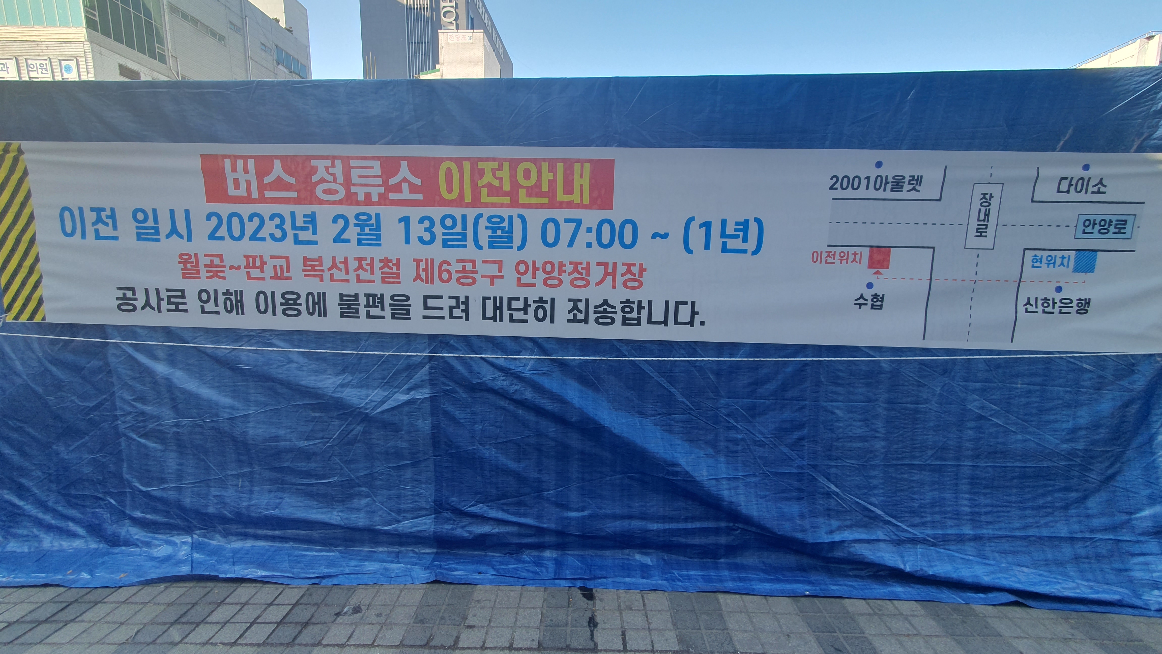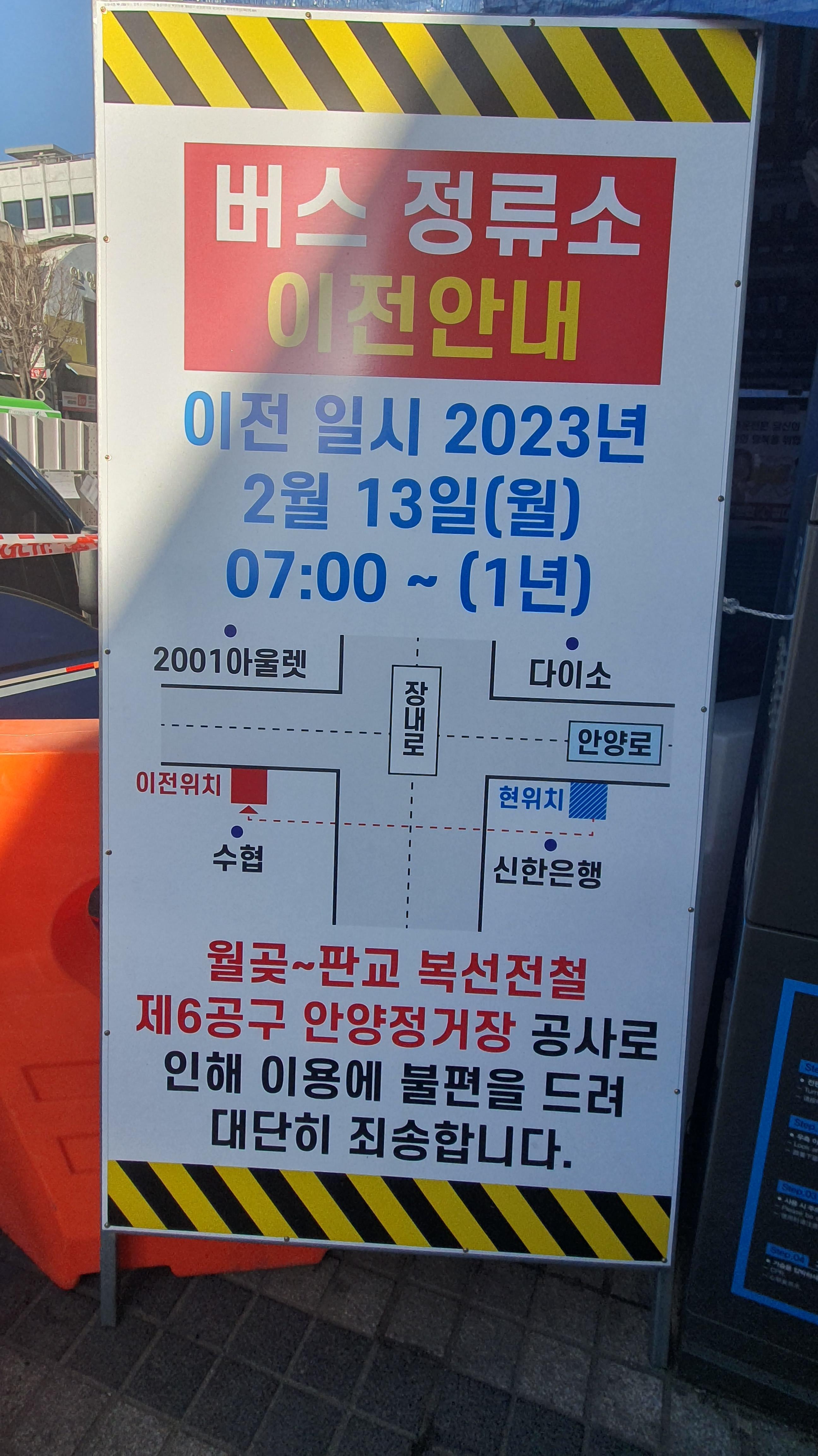 2023.02.21/ #도시기록 #안양 #만안구 #안양일번가 #지하철/ 월곶-판교 복선전철 공사가 본격화되면서 버스정류장이 이전되고 공사장 주변에 심어진 가로수를 이식하기 위한 공사가 실시되는 등 안양 만안구 원도심이 어수선하다. 안양일번가 입구에서 월곶-판교 복선전철 6공구 공사가 시작되면서 신한은행앞에 있던 서울시내 버스및 창박골행 안양버스 숭하차 버스정류장을 2001아울렛 맞은편 수협 안양지점 앞으로 이전하고 도로변 가로수인 은행나무를 이식하기 위한 작업도 한창이다.