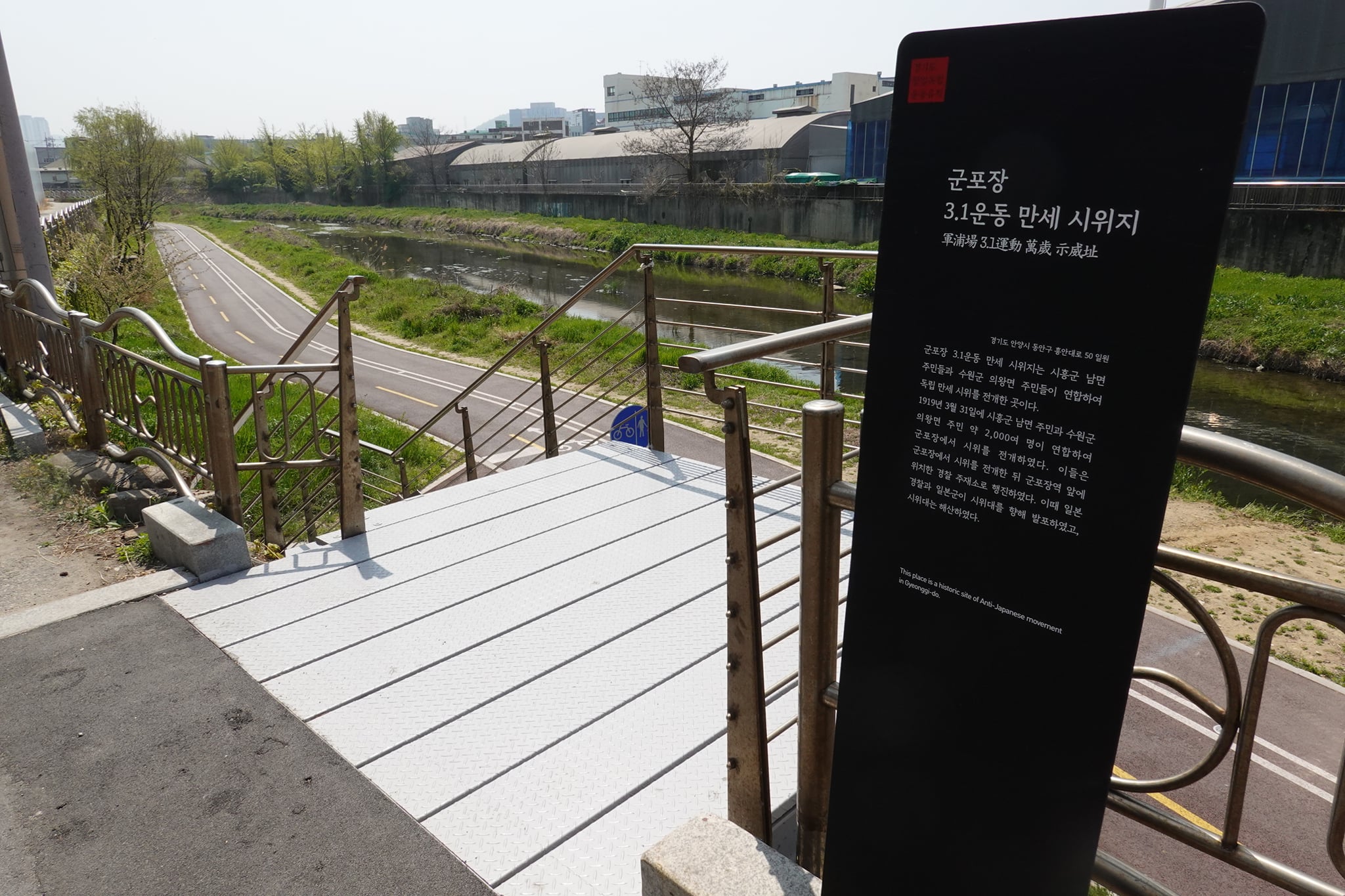 2022.04.20/ #안양 #동네 #골목 #기록 #호계구사거리/ 구군포교 다리앞에 경기도(경기문화재단)에서 세운 군포장 만세시위지 표지판. 조선시대부터 일제강점기인 1920년대까지 군포장(사일장)이 열렸던 구군포사거리(안양 호계동) 지역은 삼남길과 시흥대로가 만나는 곳으로 대한제국 시절에는 안양.군포.의왕의 중심지였으며 1930년대 이전 전국에서 장돌뱅이들이 모였던 군포장(구군포교와 군포교 사이 지역)이 열리던 곳이다.