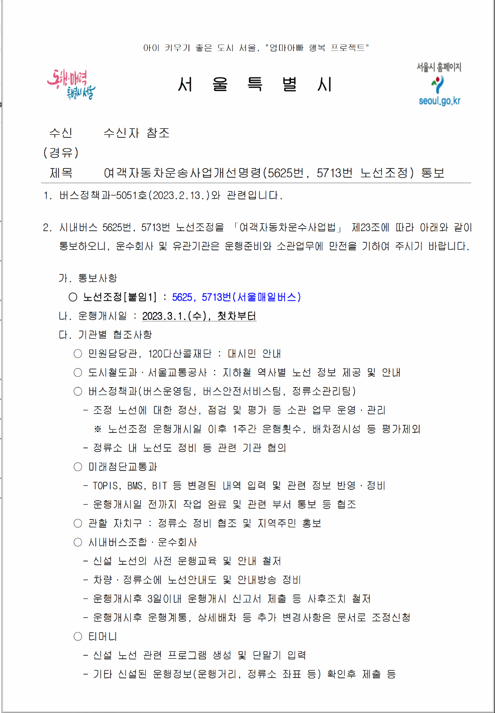 안양을 출발하여 서울 영등포와 신촌을 오가는 서울시 시내버스(5625.3626.5713번)중 2개 노선(5625.5713번)이 안양시 구간 직선화 및 중복노선 조정 관련으로 3월 1일부터 기존 안양 일번가 구간(비산동-이마트-우체국사거리-안양대교)을 통과하지 않고 경수산업도로 구간(비산돟-이마트-대림대학-양명고-안양유원지사거리)으로 직통한다는 계획이다.