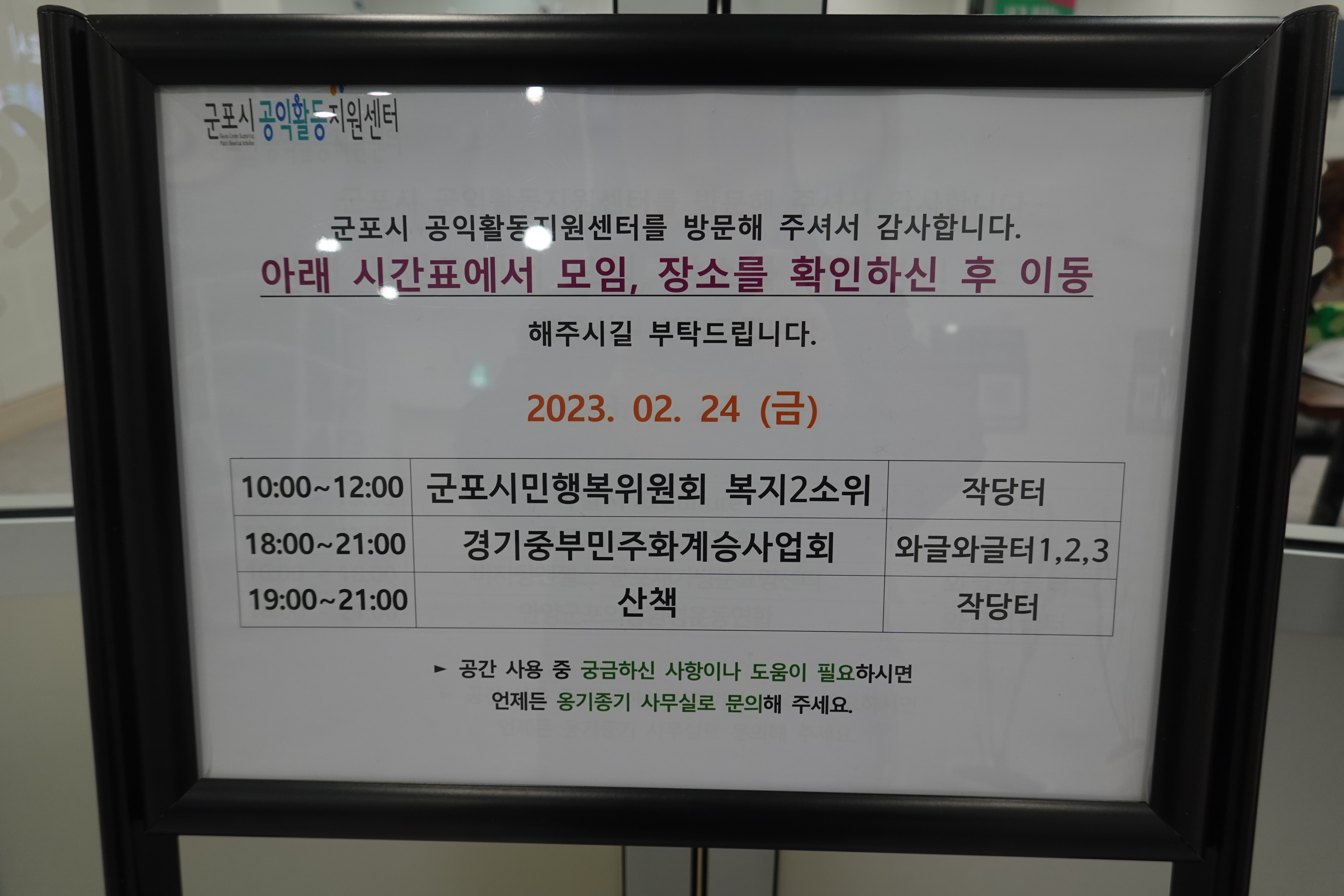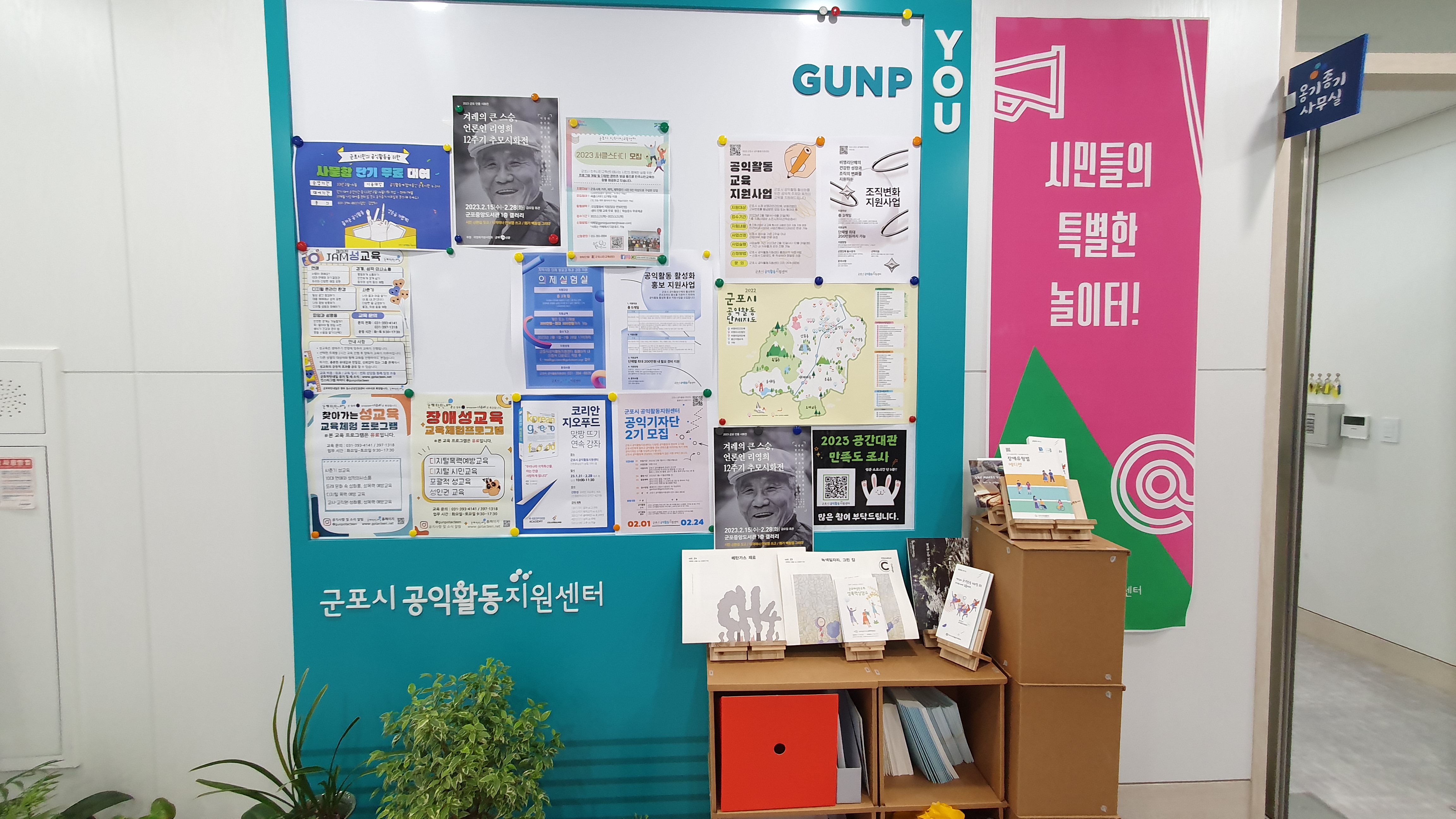 군포시공익활동지원센센터는 공익활동의 정보와 경험을 연결하는 플랫폼입니다. 공익활동을 하고자 하는 시민·모임·단체 등을 위해 체계적으로 지원합니다.