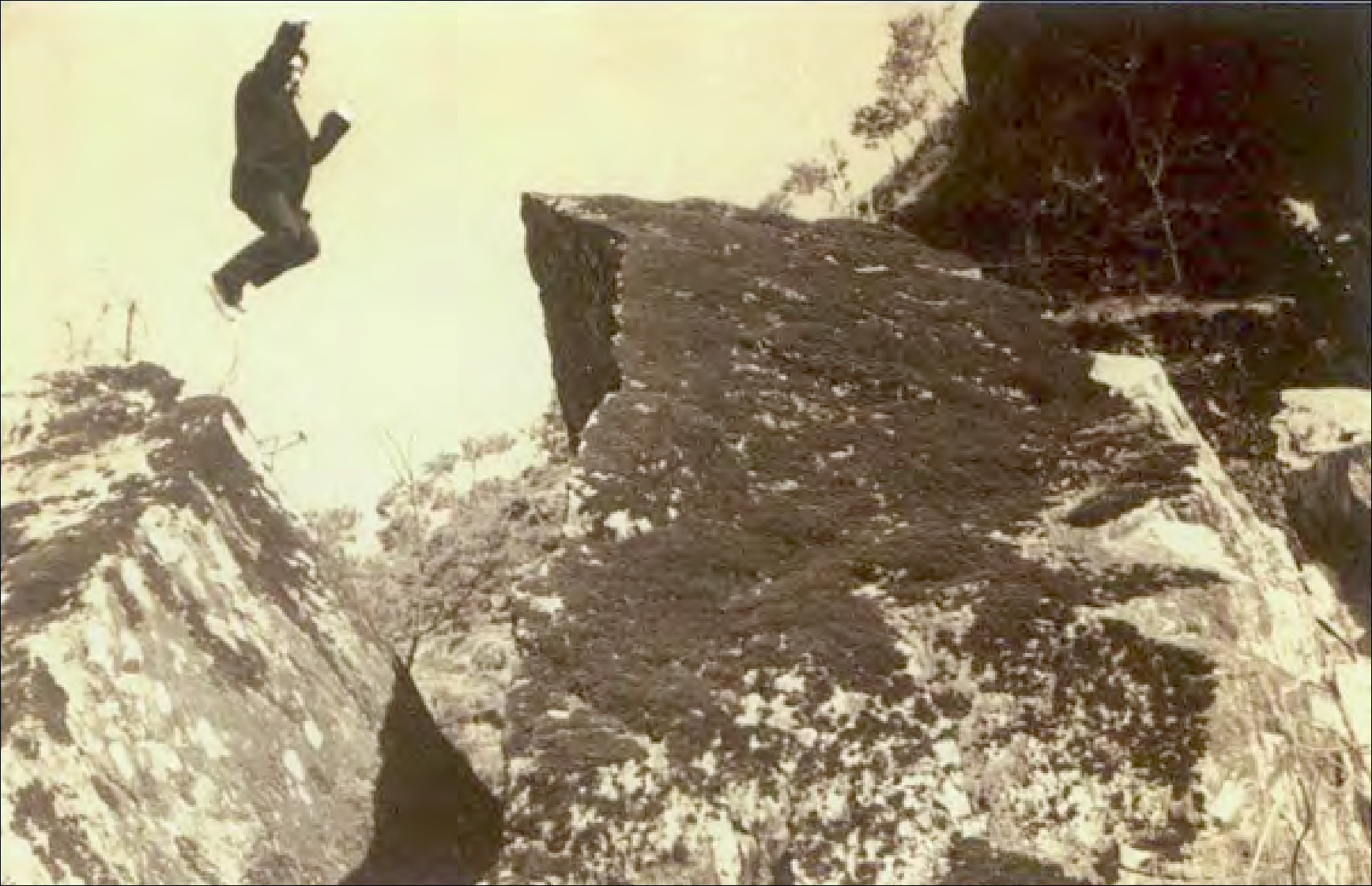 이 사진은 1968년 군포 밤바위에서 청소년들이 바위를 뛰어넘으며 담력 놀이를 찍은 사진이다.