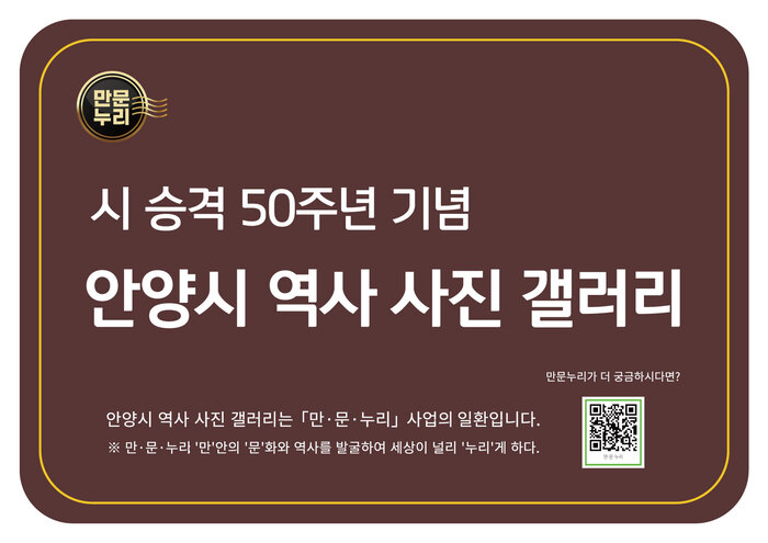 안양시 승격 역사 사진 갤러리 설치 사업은 만안구가 지난해부터 추진하고 있는 ‘만문누리’ 사업의 일환으로 진행됐다. ‘만문누리’란 만안의 문화와 역사를 발굴 및 홍보하여 세상이 널리 누리게 한다는 의미로, 구는 급격한 도시화의 진행에 따른 고유문화의 소실에 대응하고자 해당 사업을 추진하고 있다.