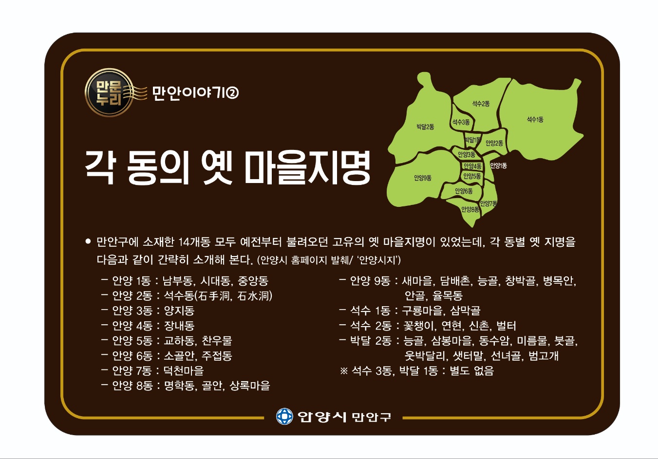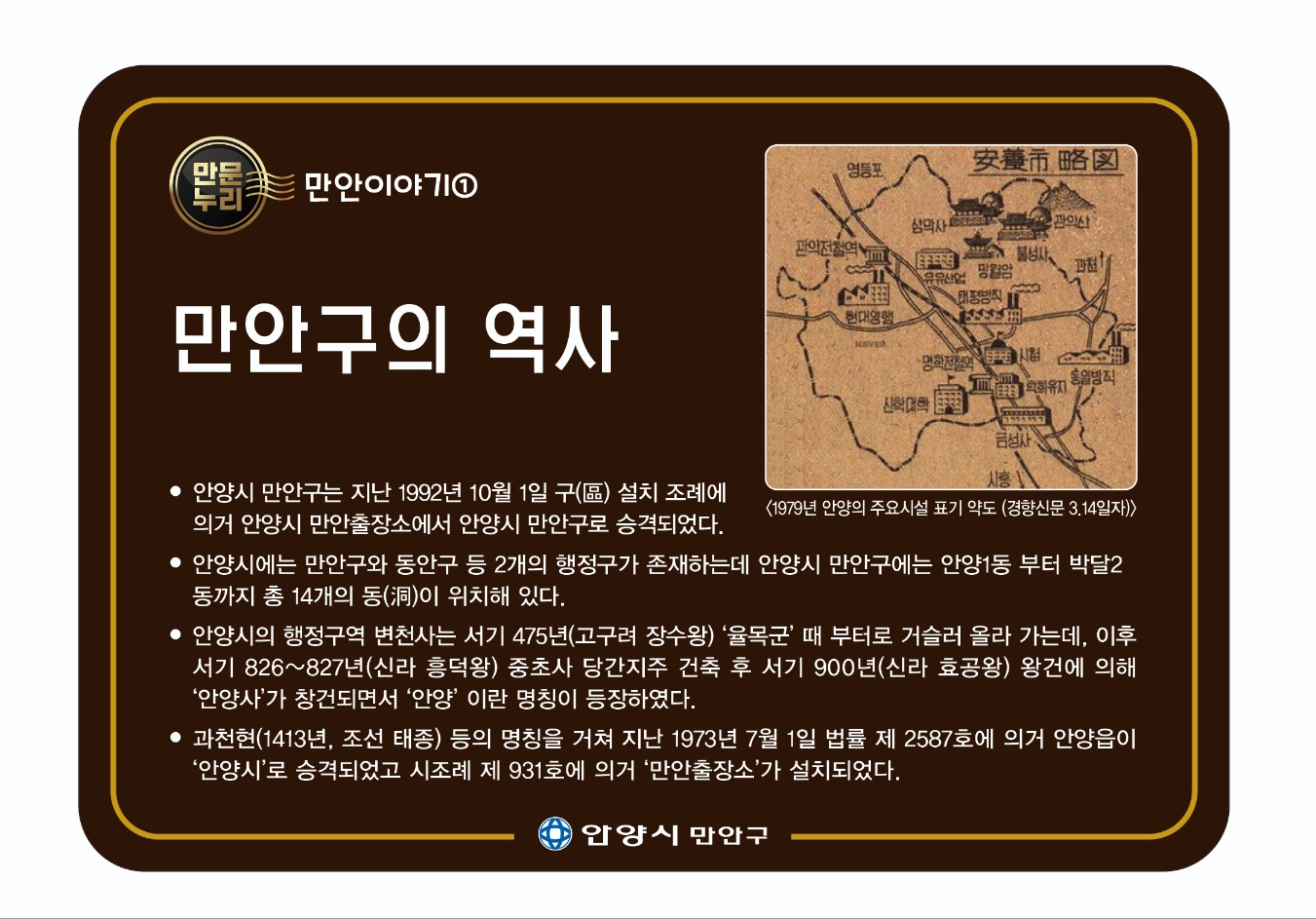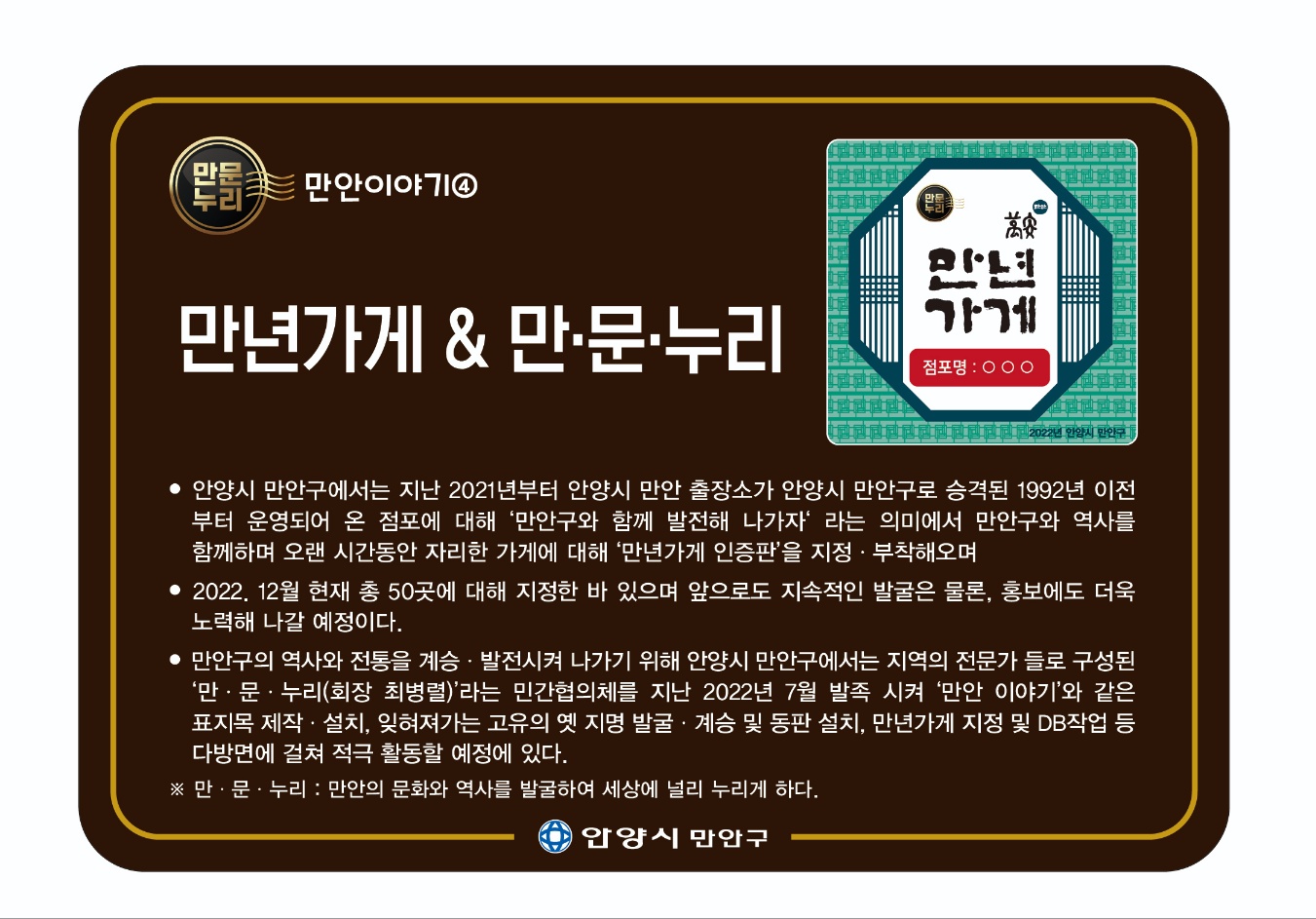 한편 만안구는 지난해 만문누리를 통해 민간협의체 구성, 만안이야기 표지판 설치, 오래된 만년가게 선정 등의 사업을 추진했으며, 올해에도 만안 문화유산 관광지도 편찬, 옛 지명 유래 및 마을 고유 이야기 동판 설치 등의 사업을 전개할 계획이다.