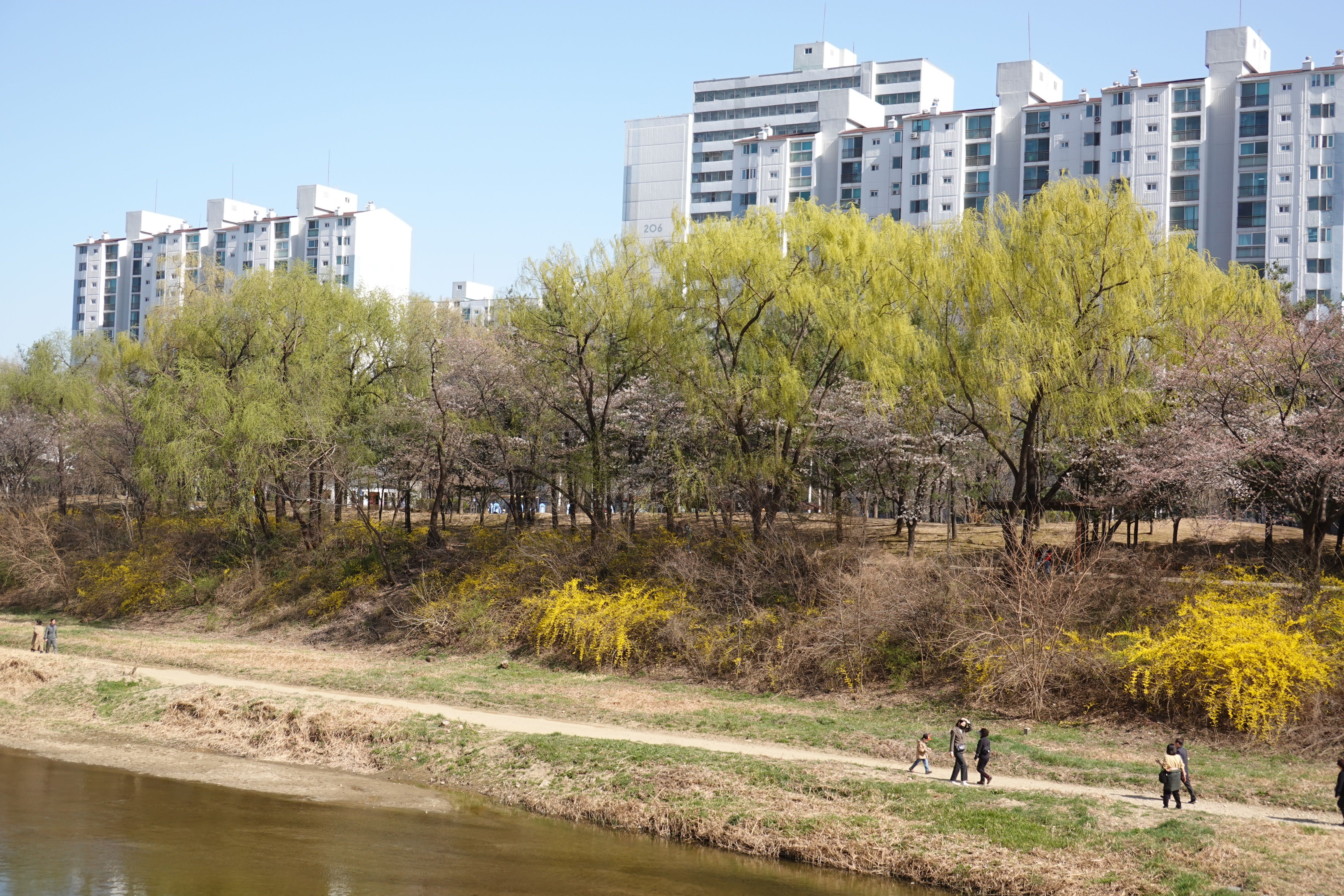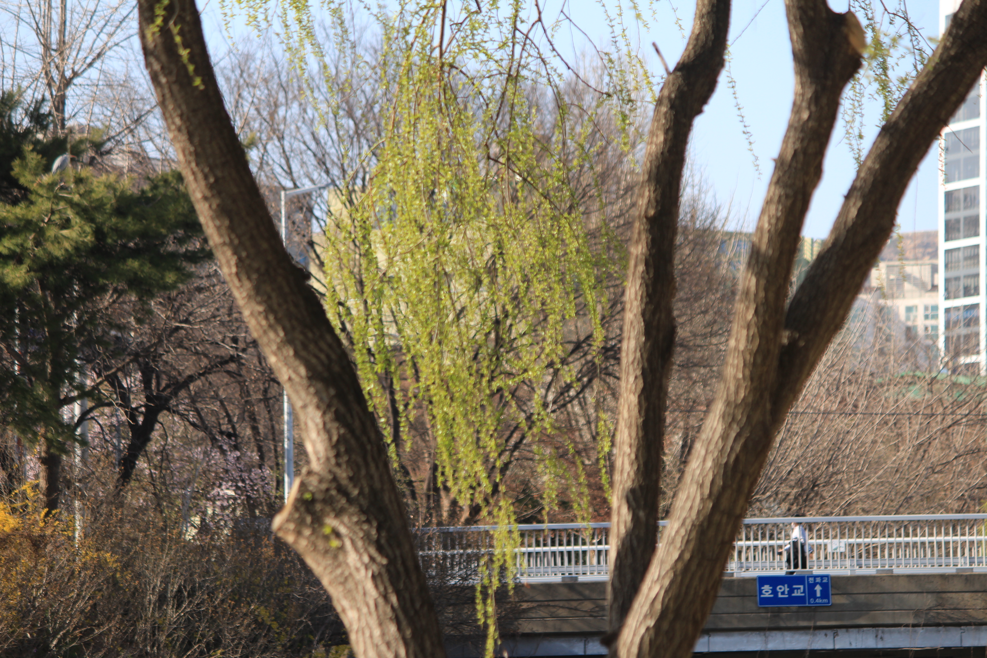 2023.03.26/ #도시기록 #연두빛 #봄봄봄 #학운공원 #안양천/ 봄의 빛깔중 가장 아름다운 연두빛 물결. 여름철 비가 많이 올 경우 부유물이 걸린다는 이유(치수대책)와 건설교통부 하천관리기준을 근거로 수년전부터 안양천과 학의천의 버드나무, 뽕나무 등 오랜기간 잘 자라온 나무들은 물론 천변의 잡초까지 대부분 베어 버려 동식물은 커녕 곤충도 보기 어려운 그야말로 황폐해진 하천이 되고 말았다. 이젠 천변에서 연두빛 나무의 아름다움도 찾아보기 어려운 봄이 되고 말았다.