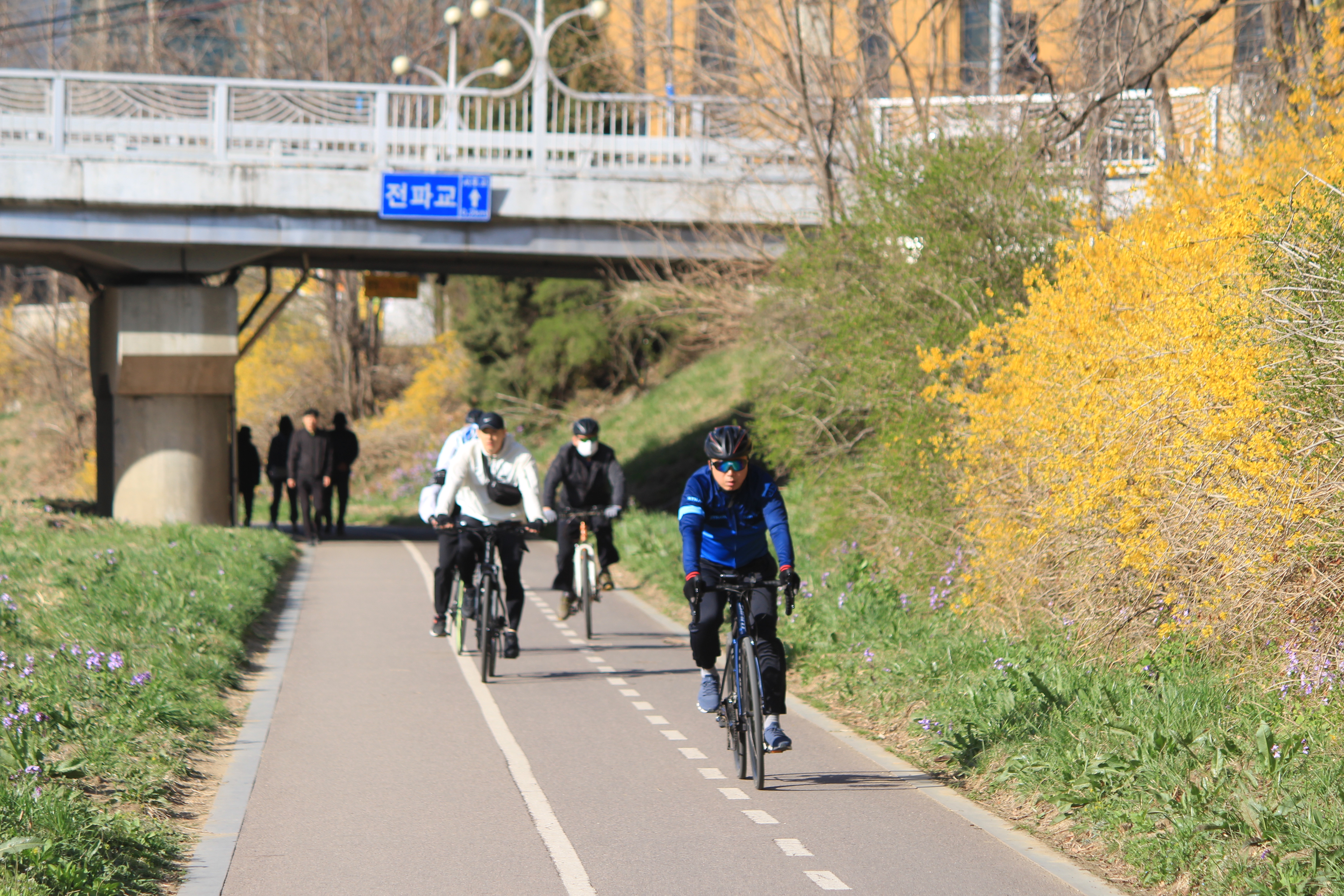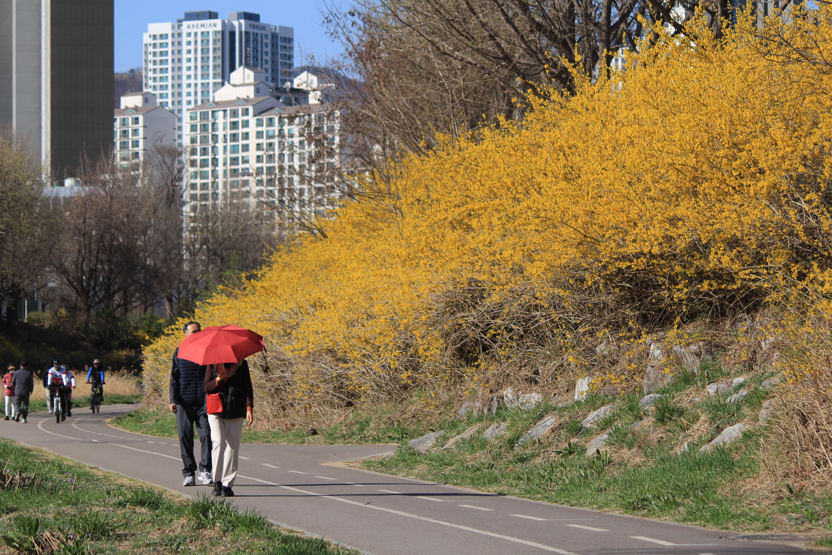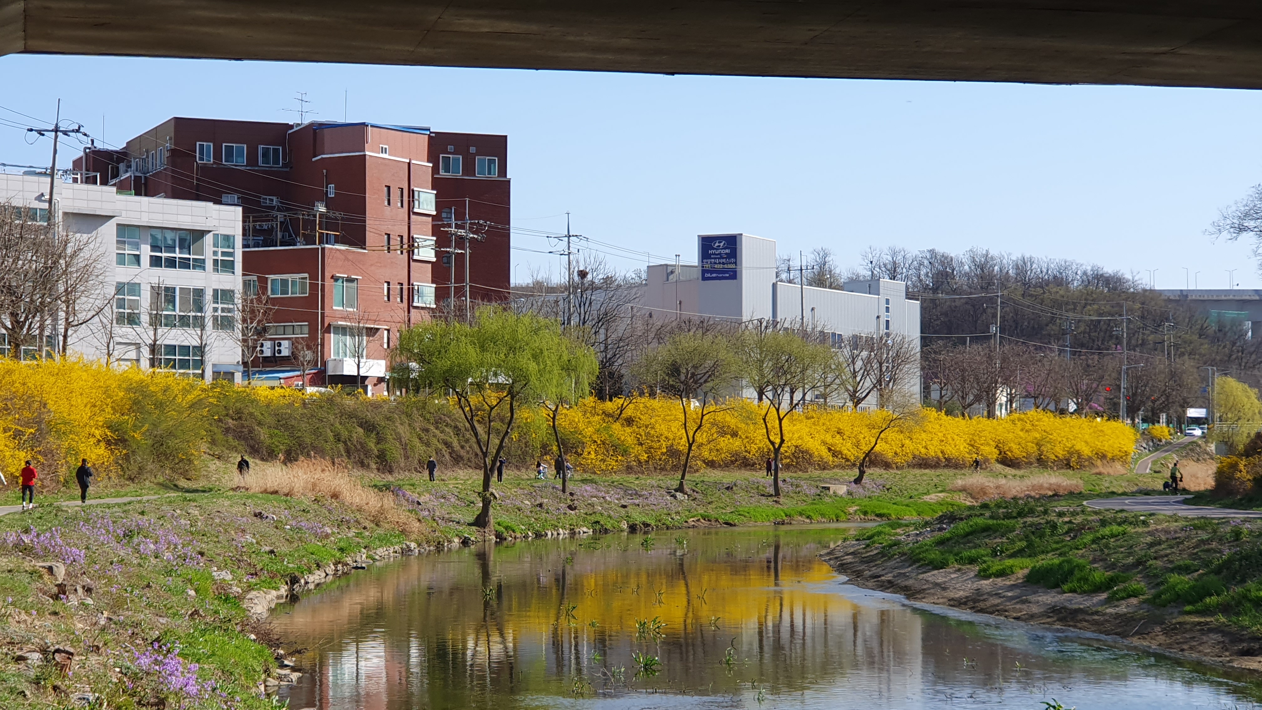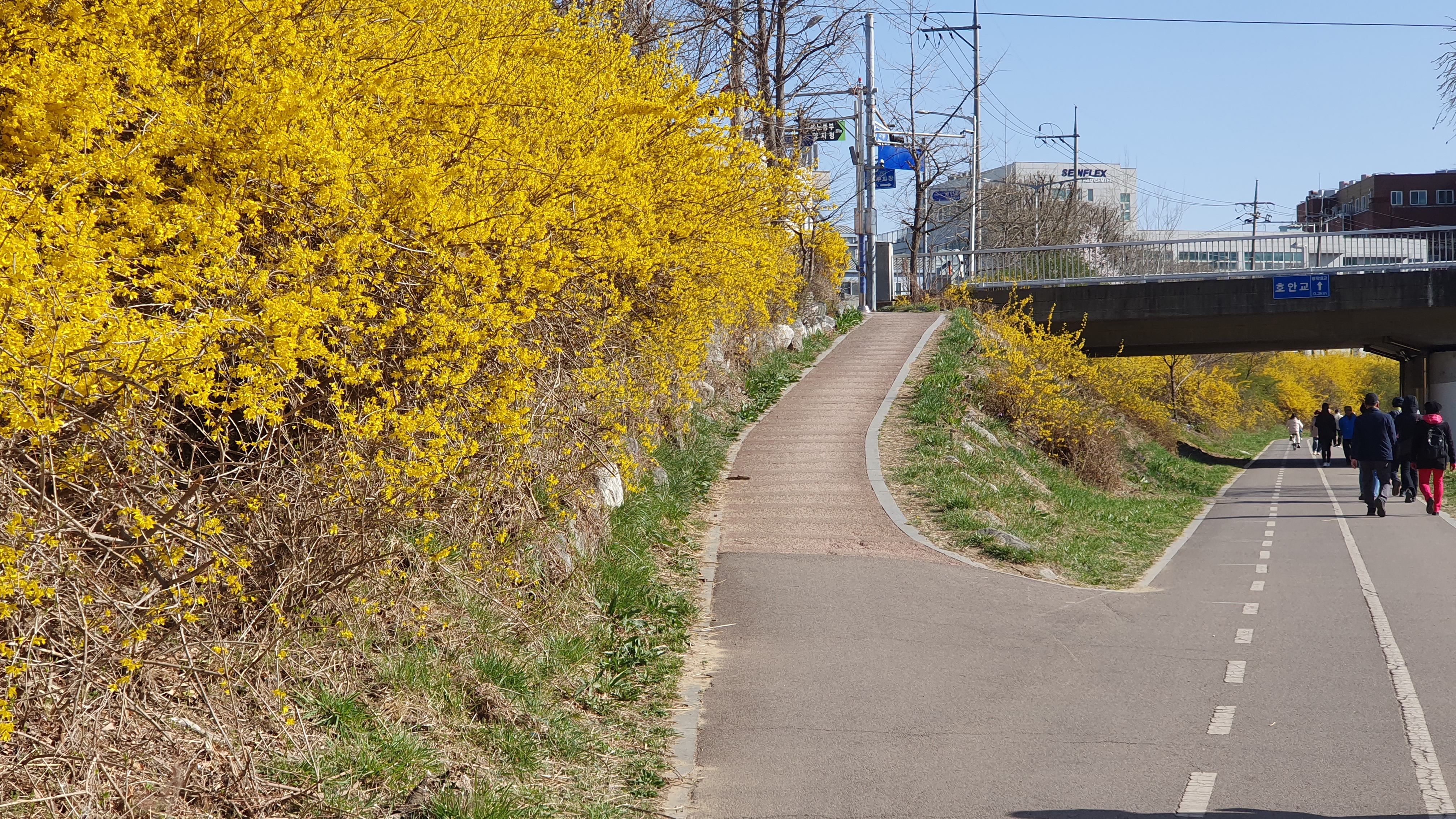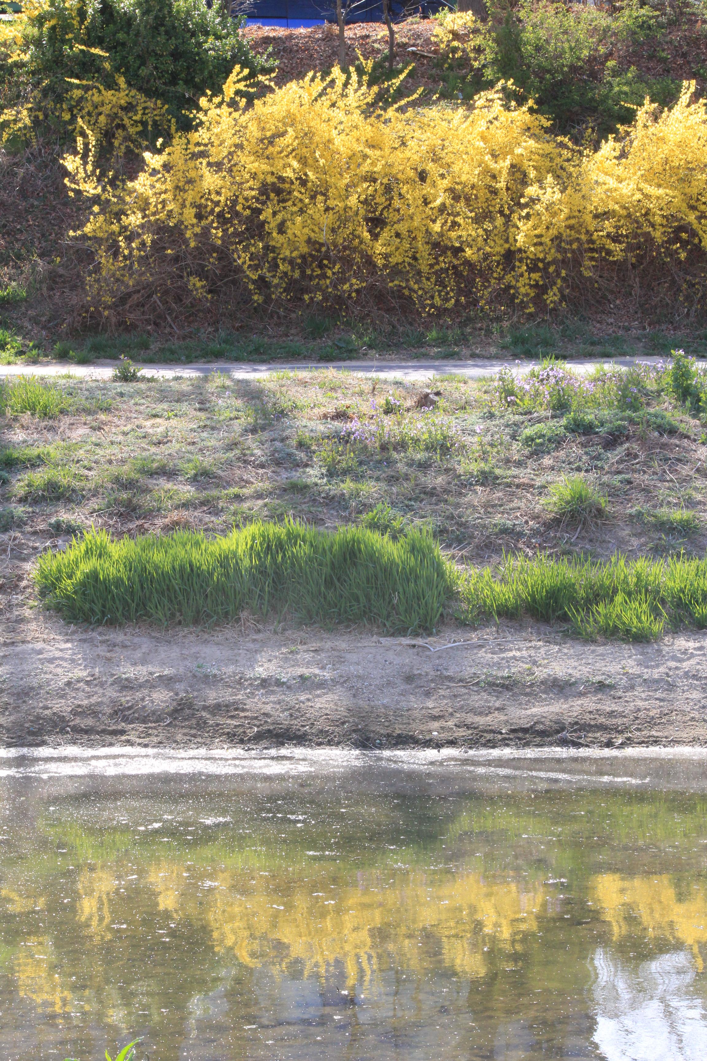 안양천에 노란 개나리꽃 만발. 물에 비친 노란 개나리 물결은 마치 노란 물감을 풀어놓은듯 하다, 개나리꽃이 만발한 지역은 안양천 쌍개울-명학대교 구간이 가장 멋지다. 개나리는 안양시 상징꽃(시화)으로 쌍개을 개나리 축제를 개최해 이를 알리자. 이를 위해 쌍개울을 중심으로 안양천과 학의천변 둔치를 따라 개나리 십리길 민들기 사업을 해보면 어떨까 정책 제안해본다. 천변 둔치 중간중간 빈꼿에 해당 동에서 개나리 식재하기. 시에서는 사진촬영 포토존과 쉼터 마련 등.
