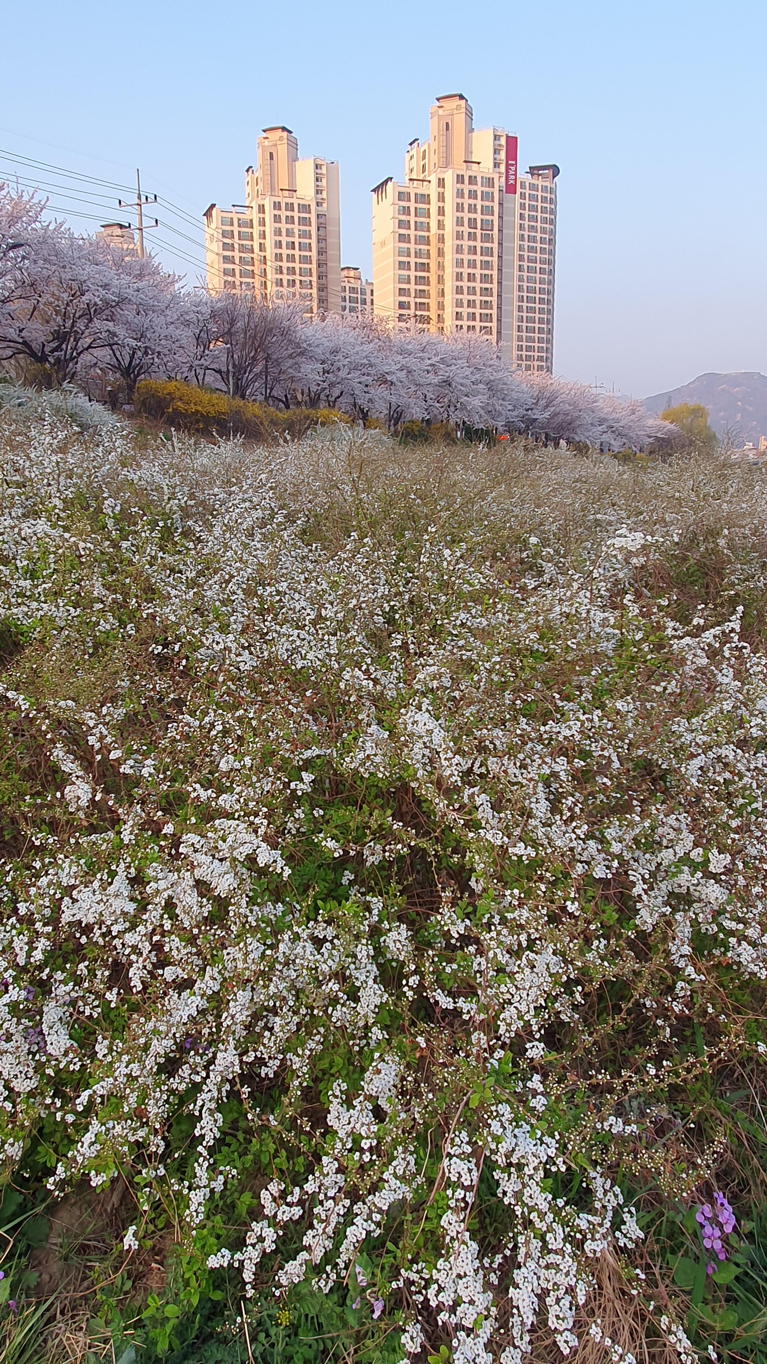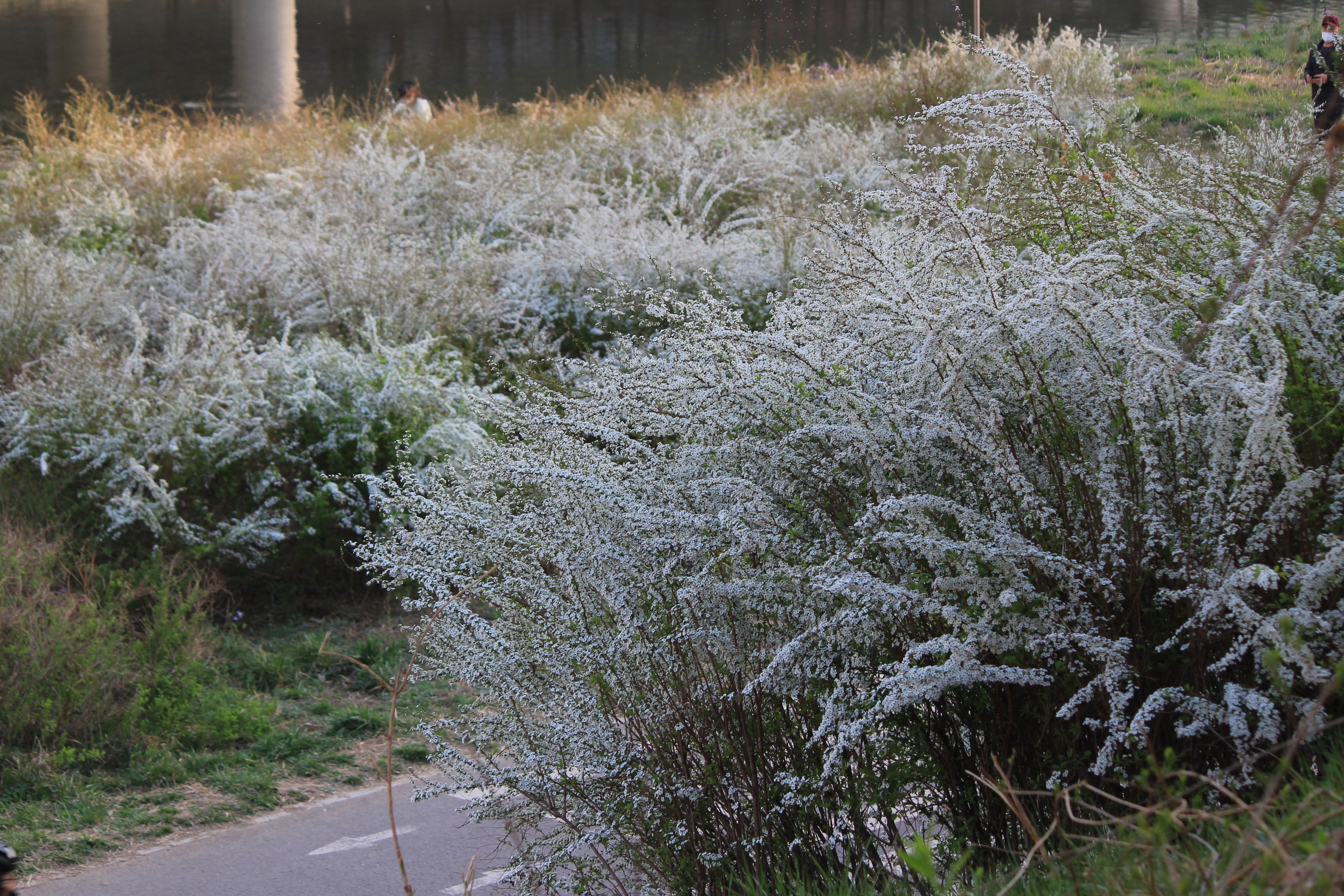 2023.03.31/ #도시기록 #꽃 #안양천 #조팝나무. 안양천 충훈벚꽃길. 뚝방위 길에는 하얀 벚꽃. 뚝방 언덕과 둔치에는 흰색의 조팝나무로 온통 하얀 세상이다.