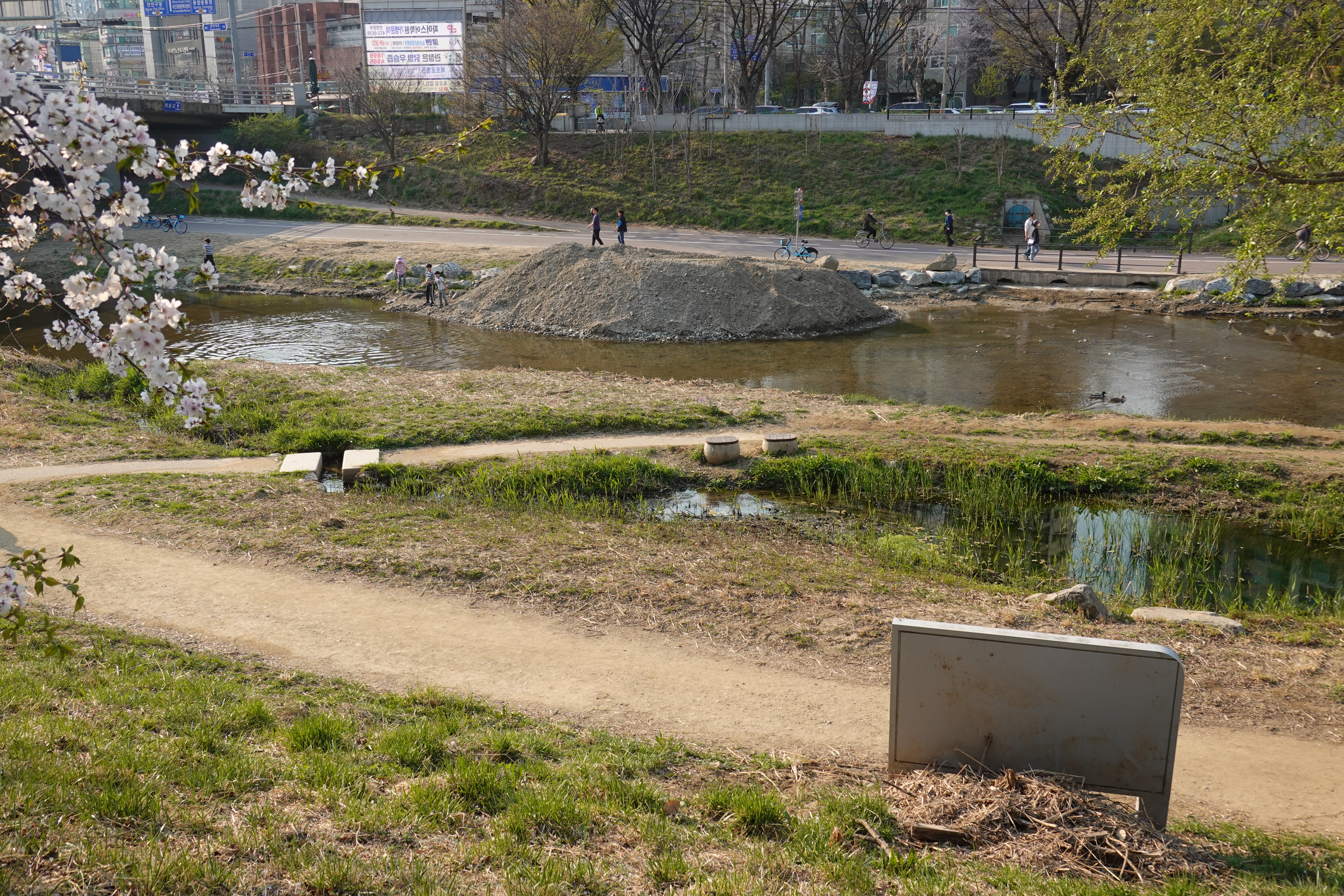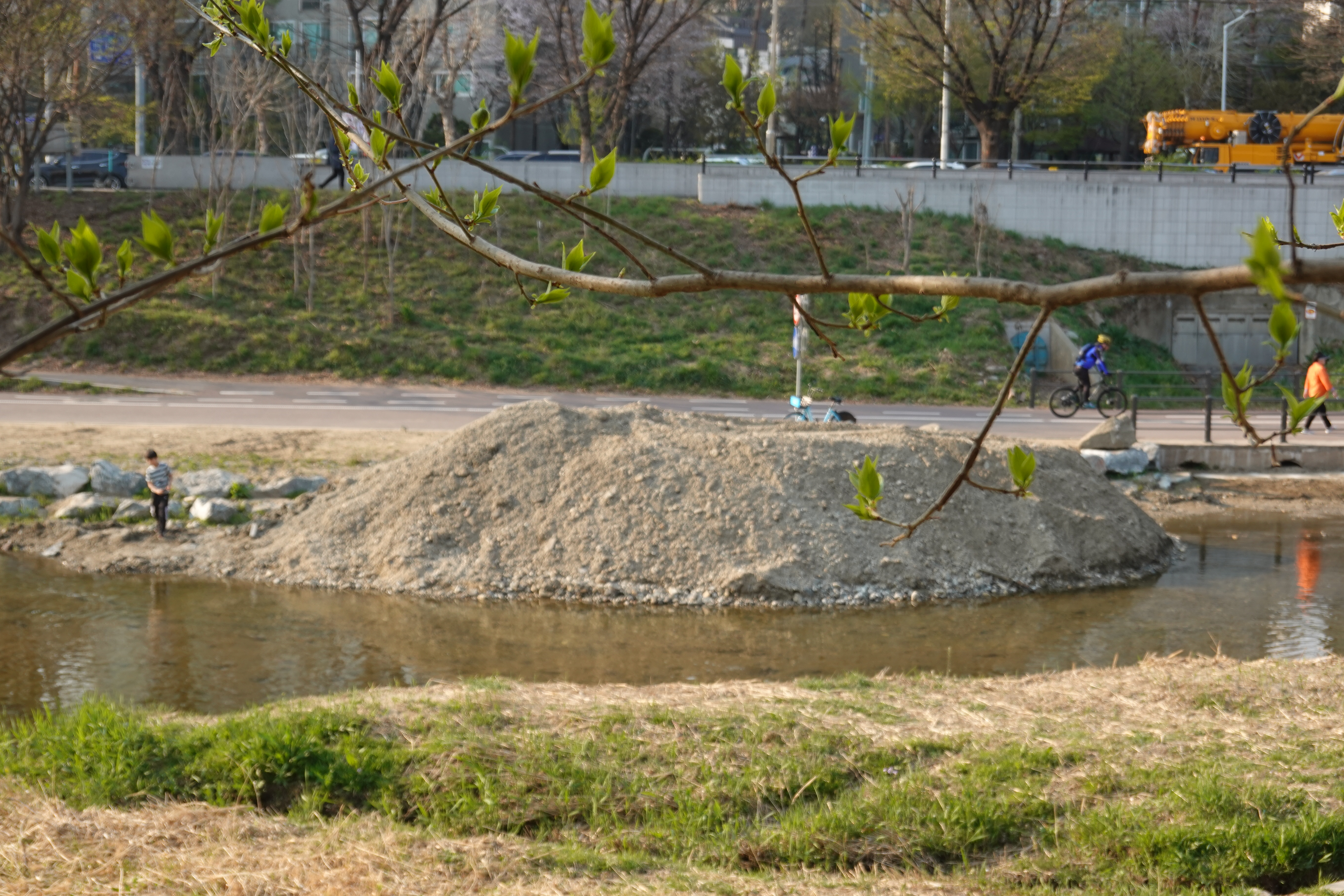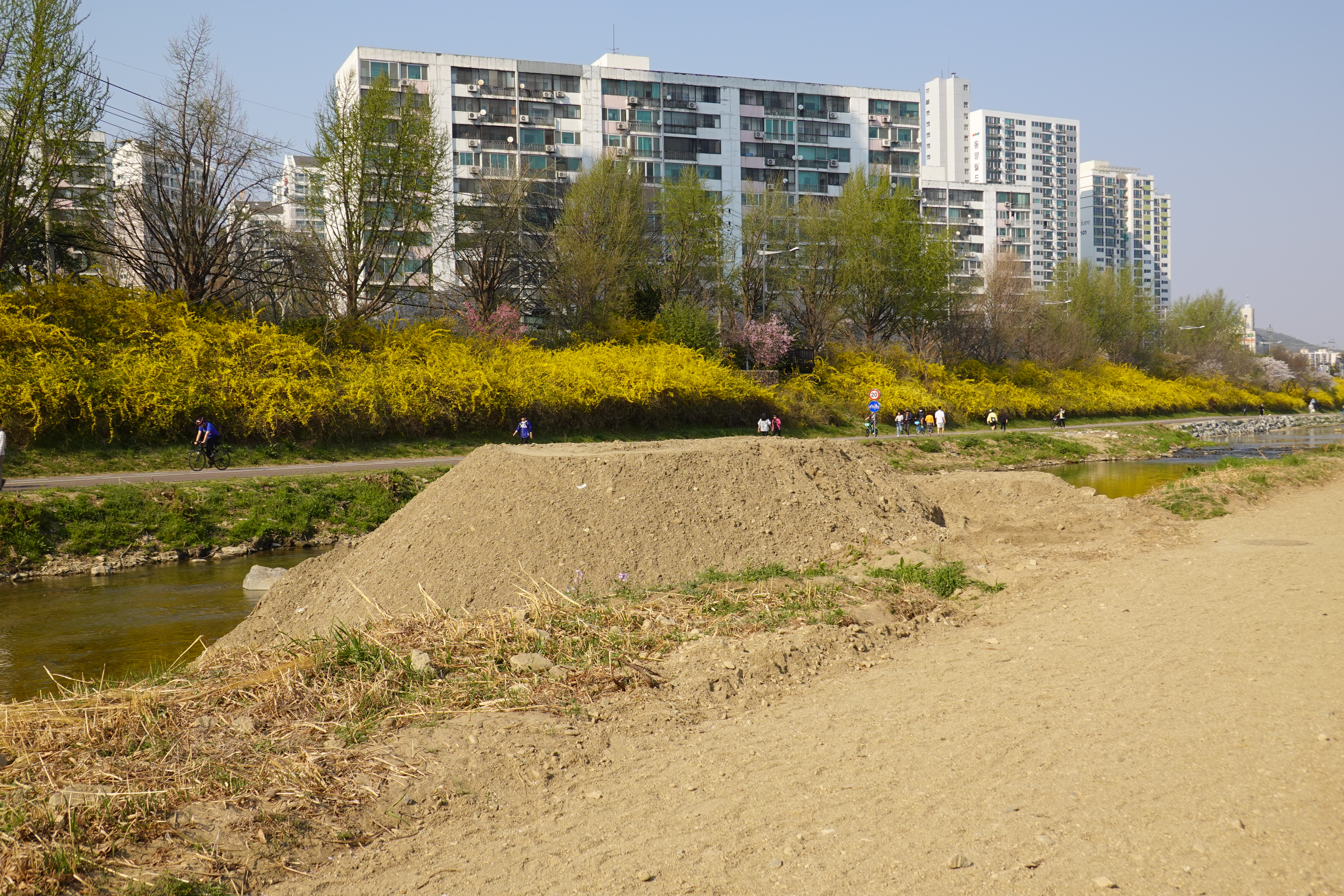2023.04.02/ #도시기록 #학의천 #안양 #공사/ 학의천 학운공원앞 두 곳에 흙이 잔뜩 쌓여있다. 어떤 것을 만들려는걸까. 공사 예고라도 있으면 알수 있으련만 어떤 안내판도 없다. 지난해 여름 수해 이후 삭막해진 하천이 점차 인공하천으로 바뀌어가는 듯한 양상이다.