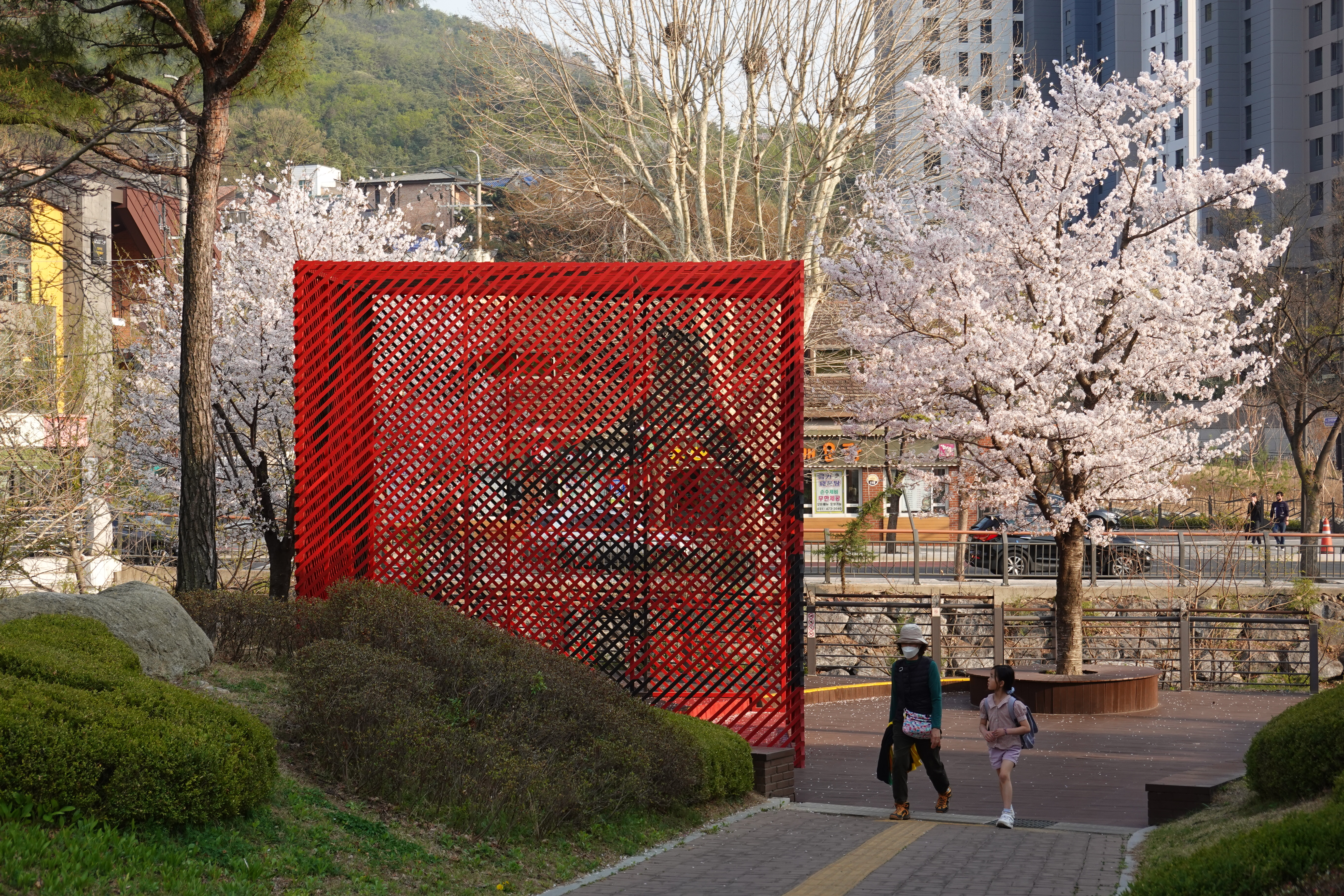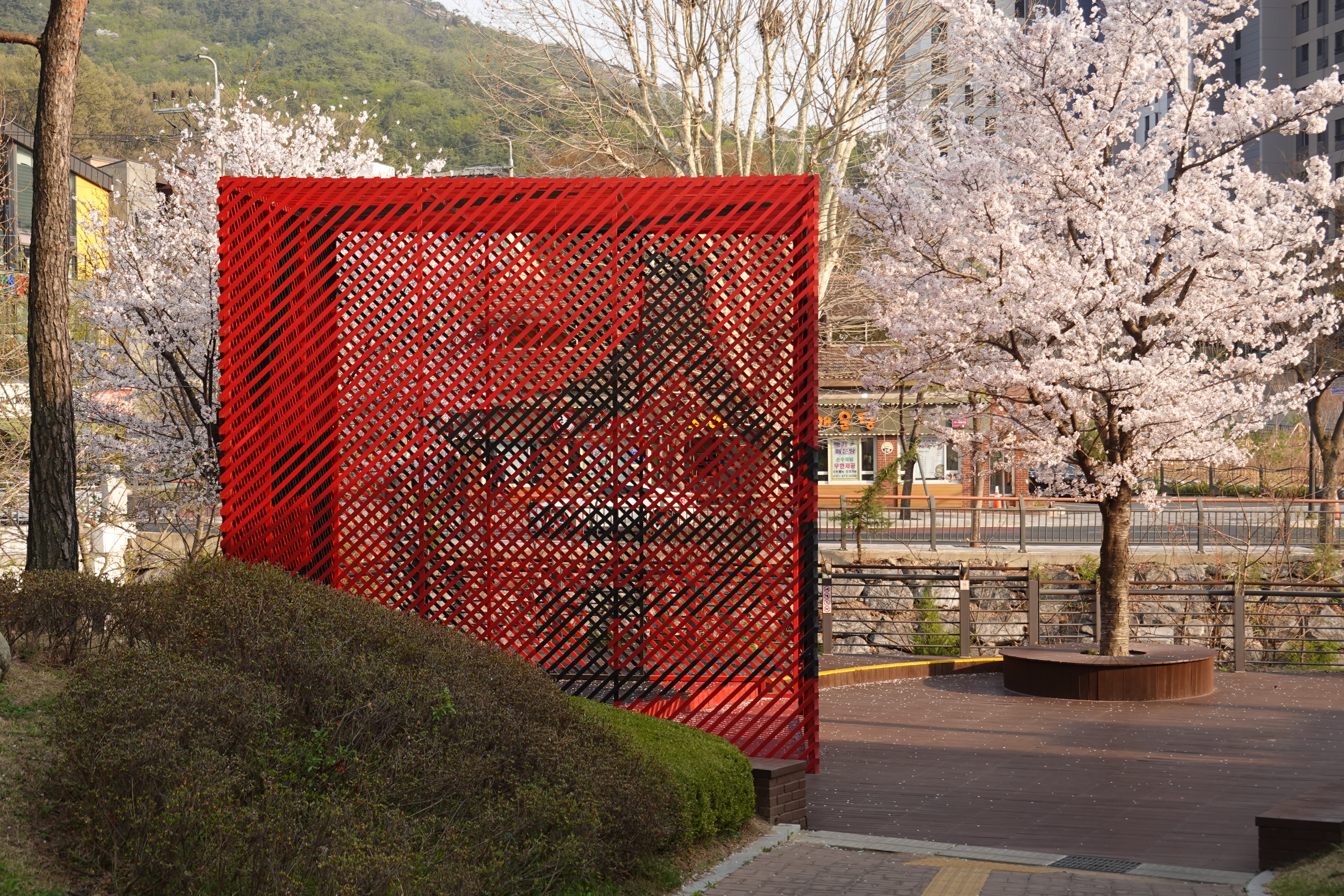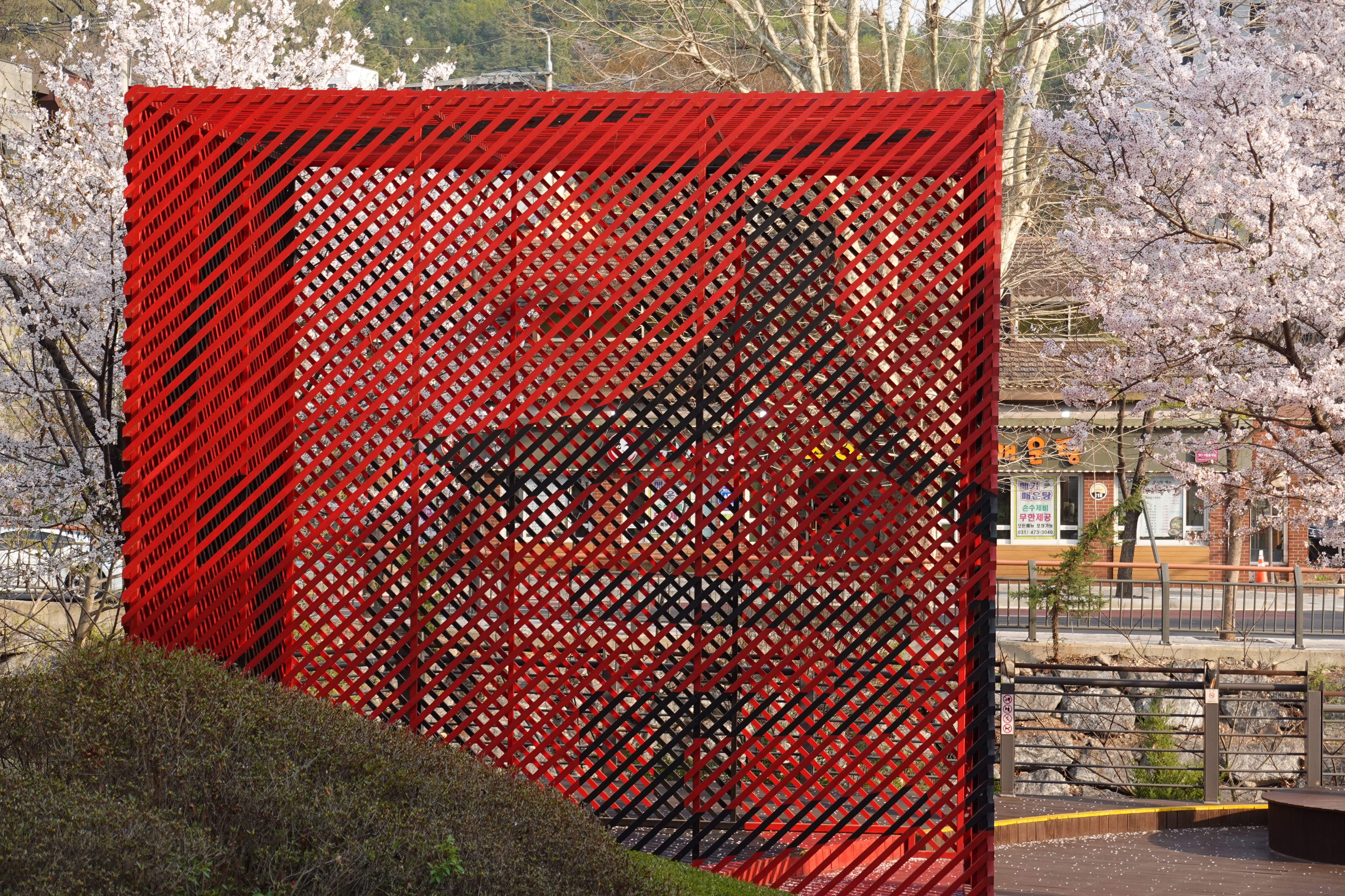 2023.04.03/ #도시기록 #안양에술공원 #중초사지 #안양사지/ 안양박물관 건물앞 벚나무와 강렬한 색상의 apap작품