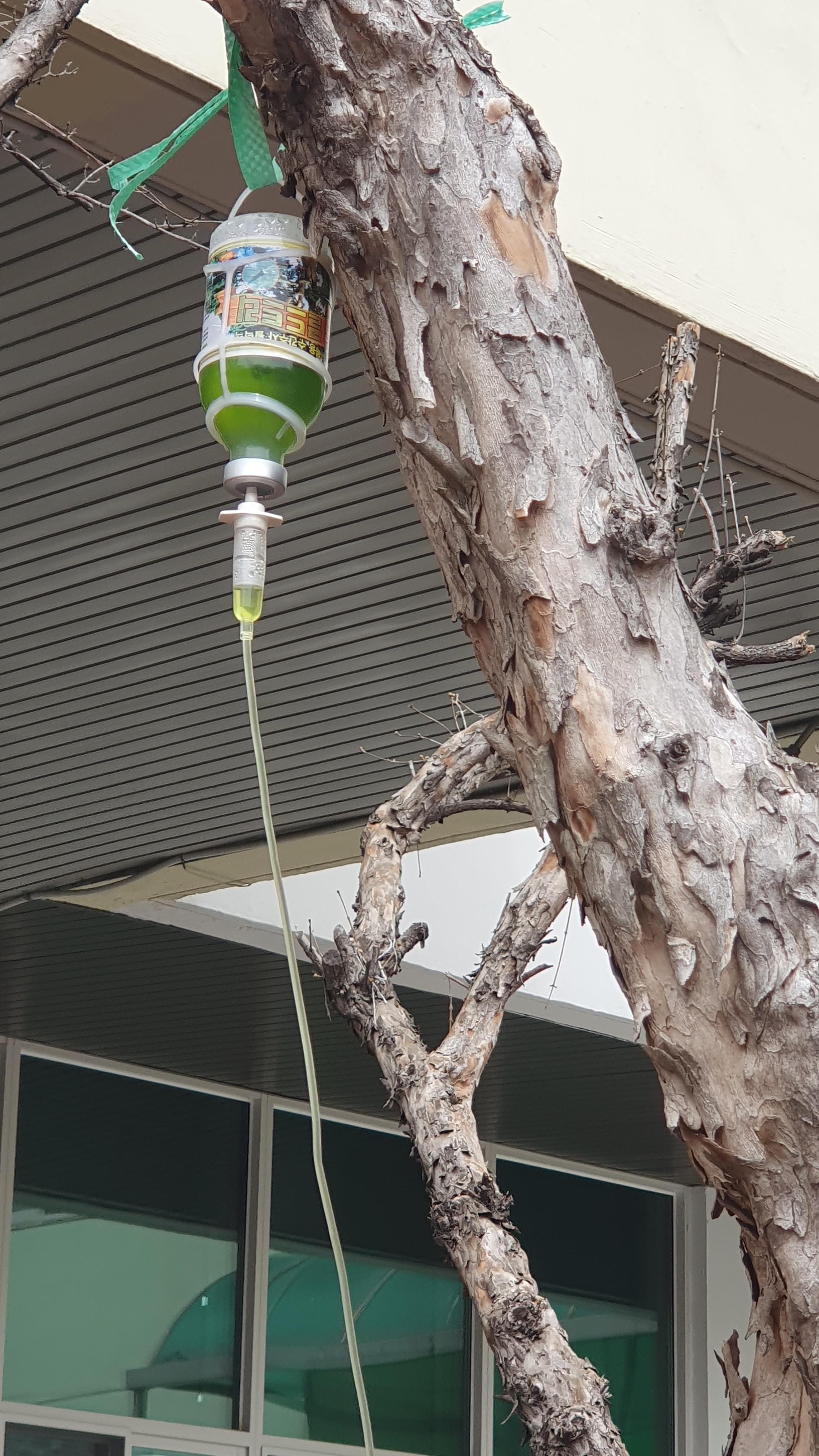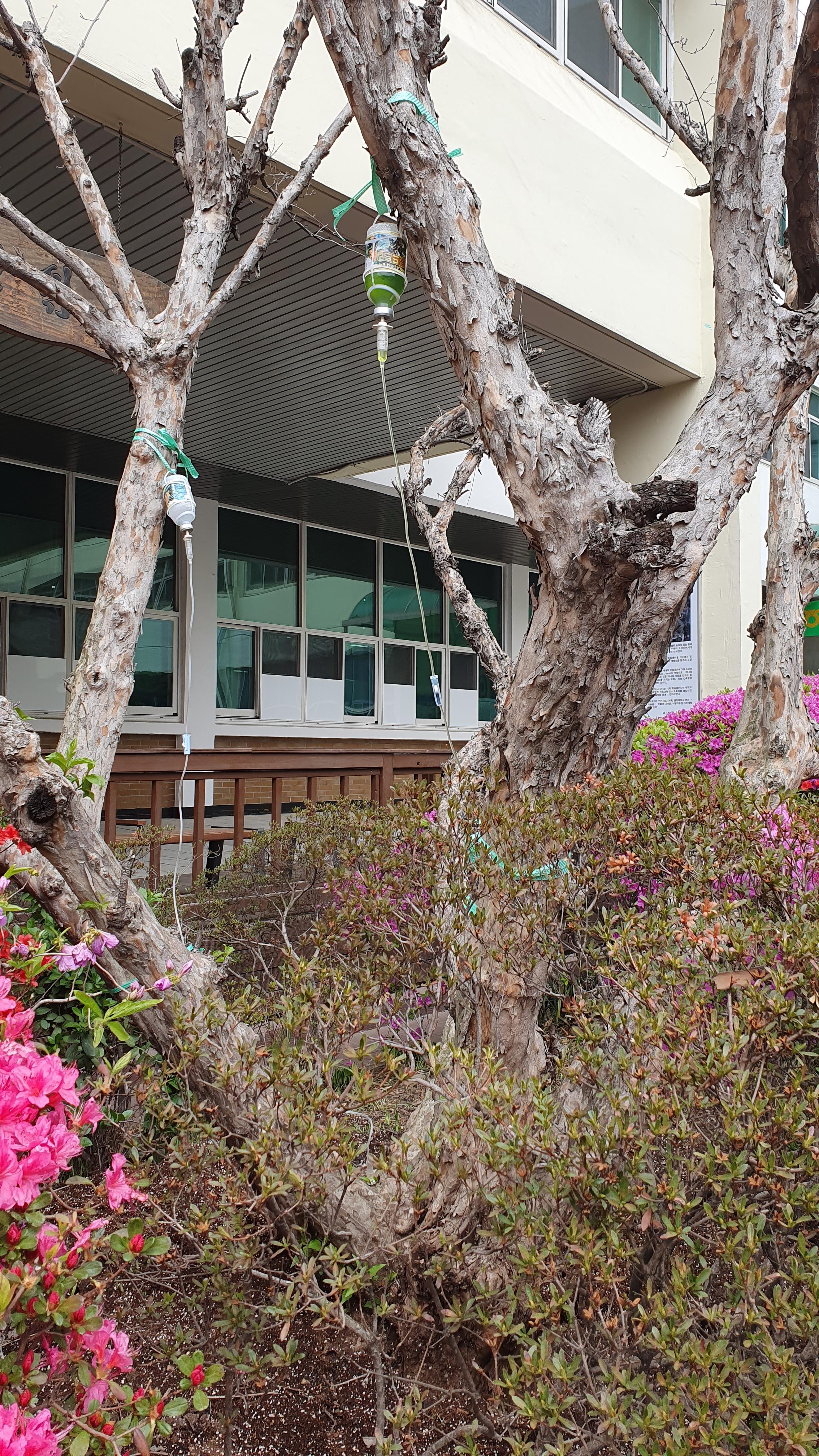 2023.04.13/ #도시기록 #산수유 #안타까움 #아프다 #병듦/ 봄이 오면 안양 만안구청 청사앞을 노랗게 치장했던 산수유가 병들어 금년에는 꽃도 피우지 못했다..구청 현관 오른쪽 쉼터 앞에자리한 산수유 나무는 현재 아파서 주사약을 맞고있다.