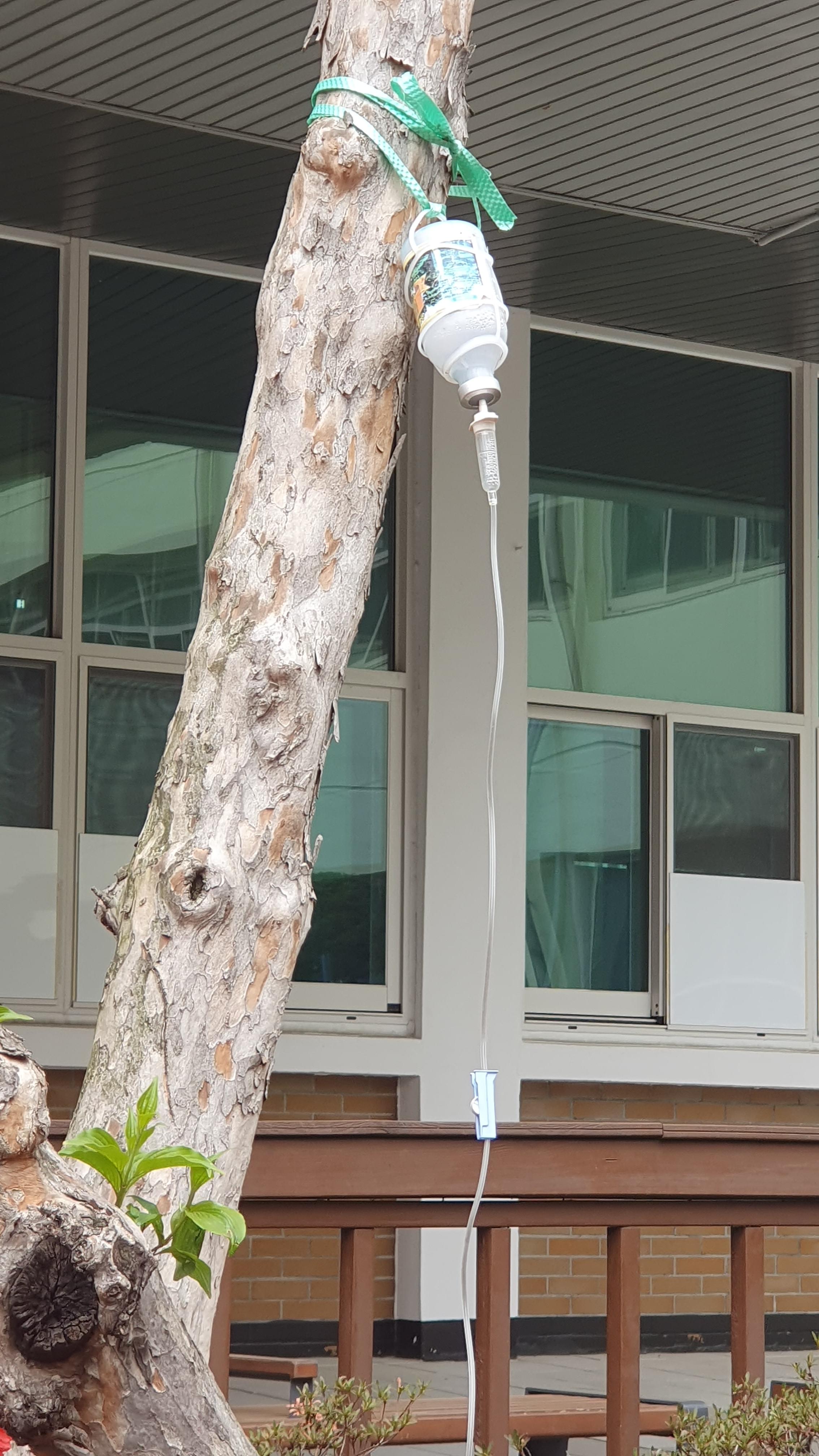 2023.04.13/ #도시기록 #산수유 #안타까움 #아프다 #병듦/ 봄이 오면 안양 만안구청 청사앞을 노랗게 치장했던 산수유가 병들어 금년에는 꽃도 피우지 못했다..구청 현관 오른쪽 쉼터 앞에자리한 산수유 나무는 현재 아파서 주사약을 맞고있다.