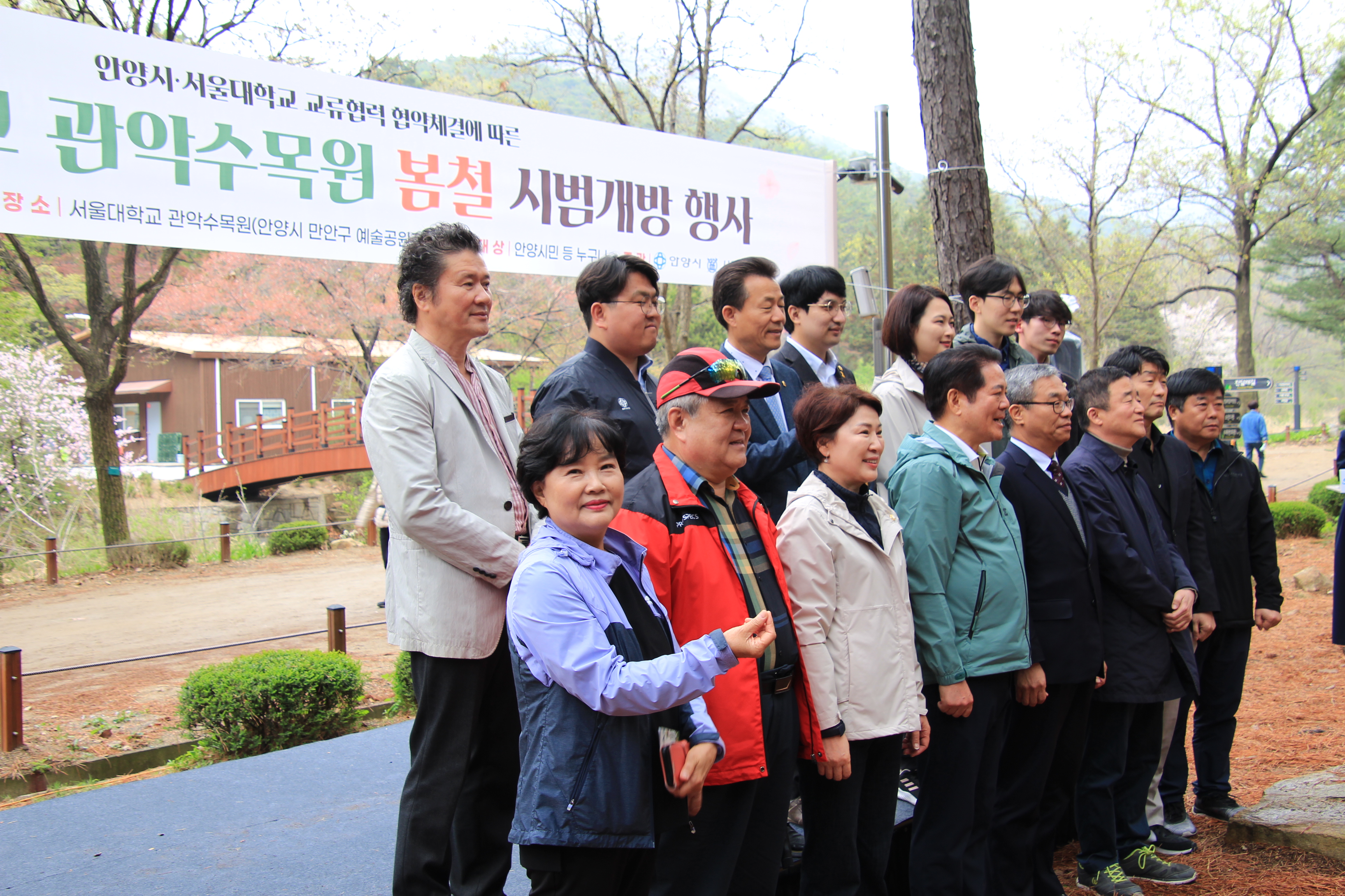 2023년 4월 15일 개방행사 첫날에는 오후 2시 수목원 정문 안 어울림마당(임간교)에서 ‘서울대학교 관악수목원 봄철 시범개방 행사’를 개최했다. 이 기념식에는 서울대 장판식 농업생명과학대학장과 최대호 안양시장을 비롯 강득구 국회의원, 최병일 안양시의장, 경기도의원(김성수, 김철현, 장민수), 안양시의원(곽동윤, 김정중, 윤경숙, 장명희, 채진기) 안양예총 이재옥 회장, 안양시걷기협회 황인경회장등이 참석해 수목원의 개방을 축하하고 수목원 산책로를 한바퀴 돌아보았다.