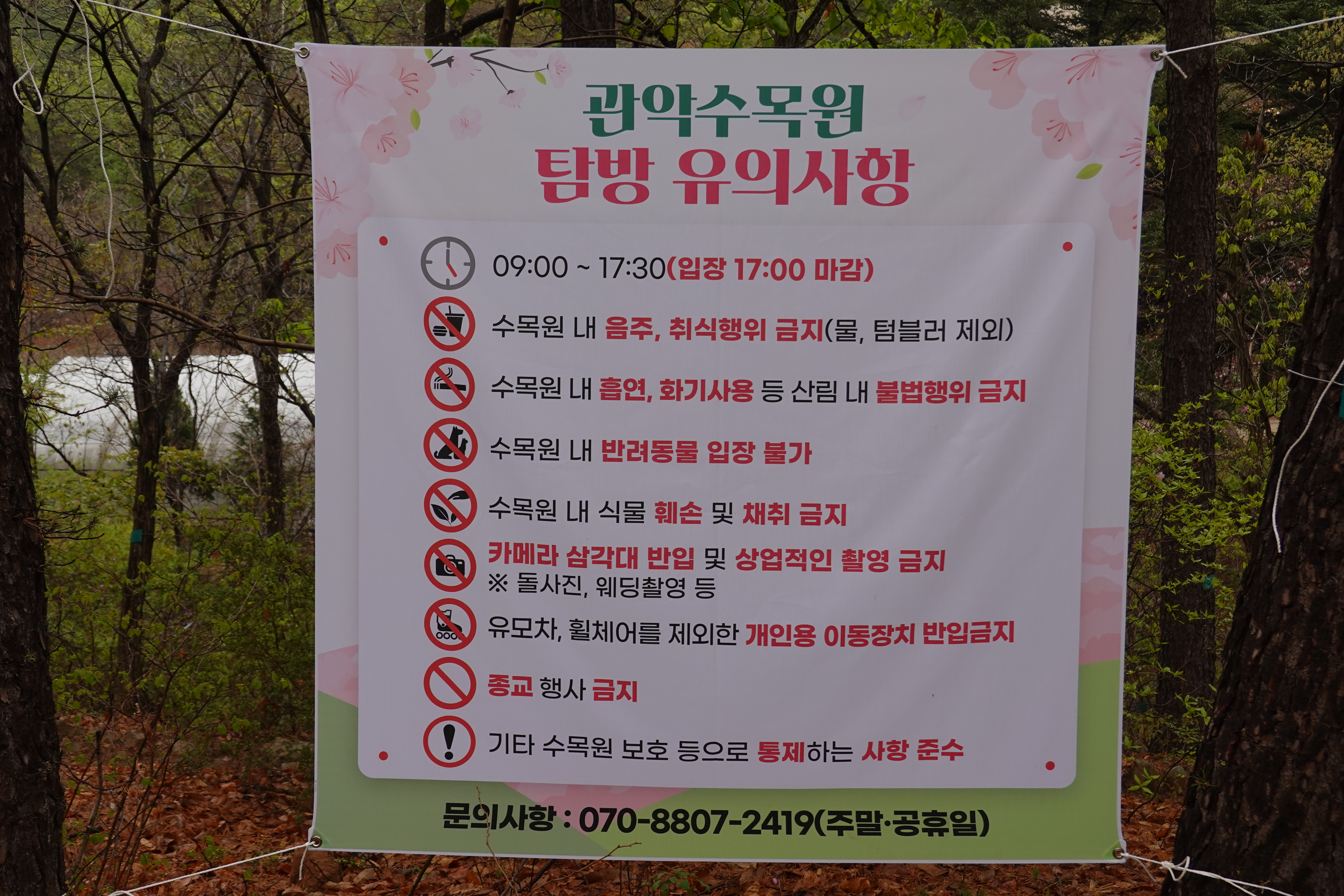 주의사항으로는 관악수목원의 산림보호를 위해 개방기간 수목원 내 음주·취식행위(물, 텀블러 제외) 금지, 흡연·화기사용 금지, 반려동물 입장 금지, 식물 훼손·채취 금지, 유모차와 휠체어를 제외한 개인용 이동장치 반입을 금지한다.