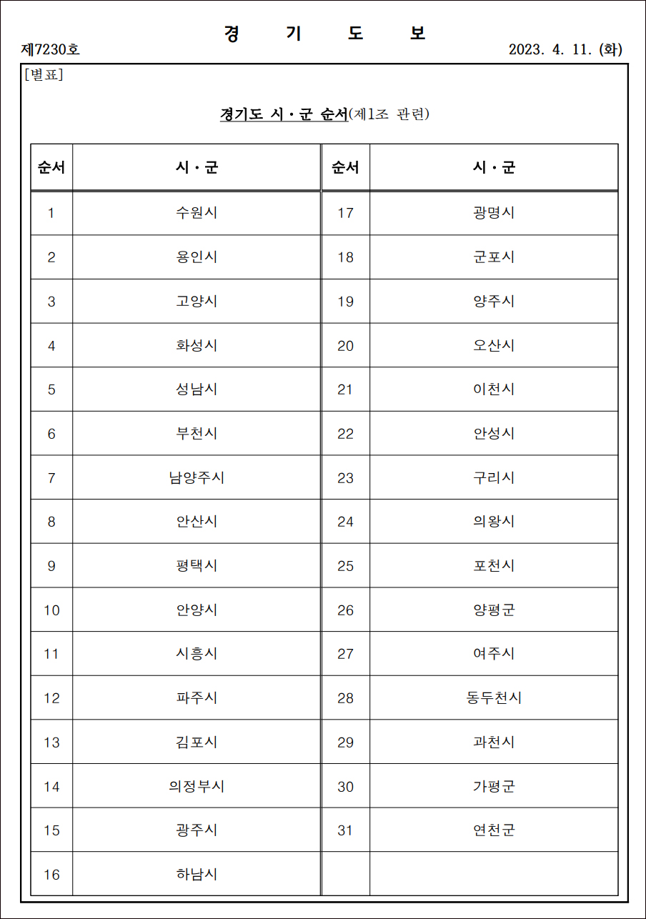 경기도는 최근 조례규칙심의회에서 의결된 ‘경기도 시군 순서 규정 일부 개정 규정’을 11일 자로 도보에 공포했다고 밝혔다.