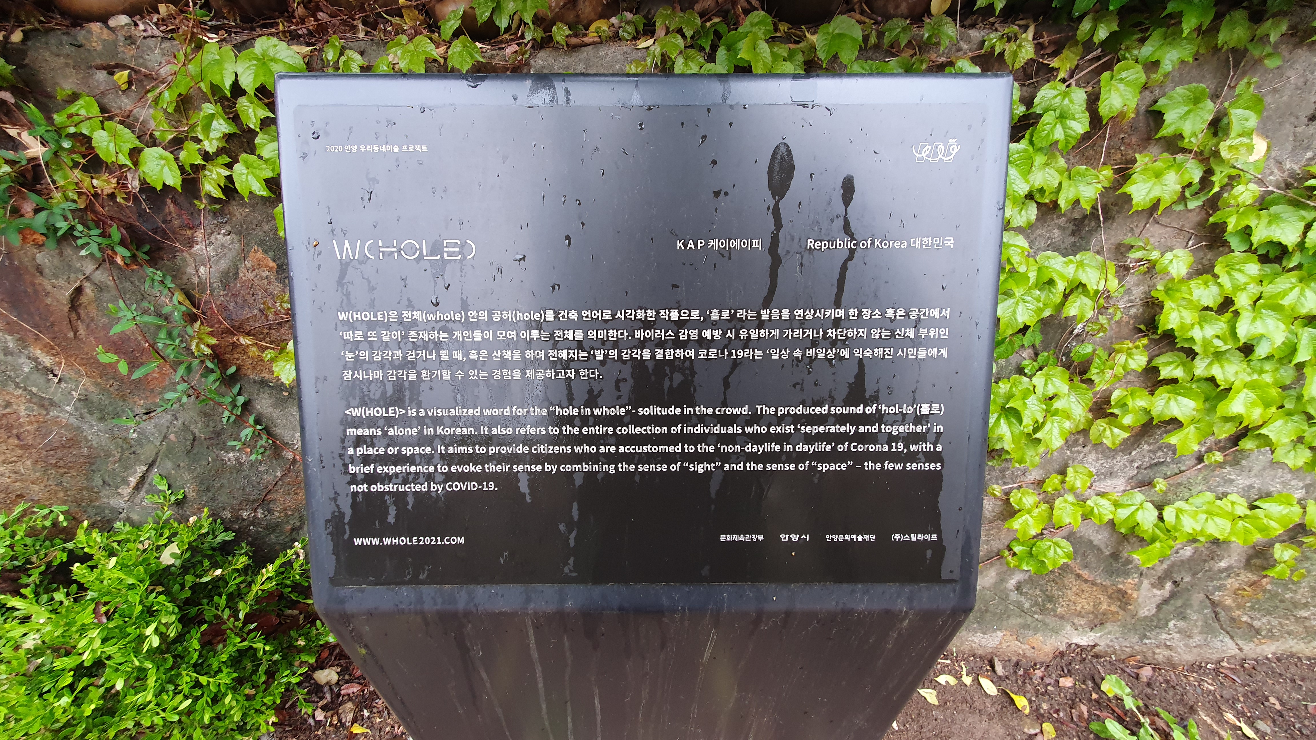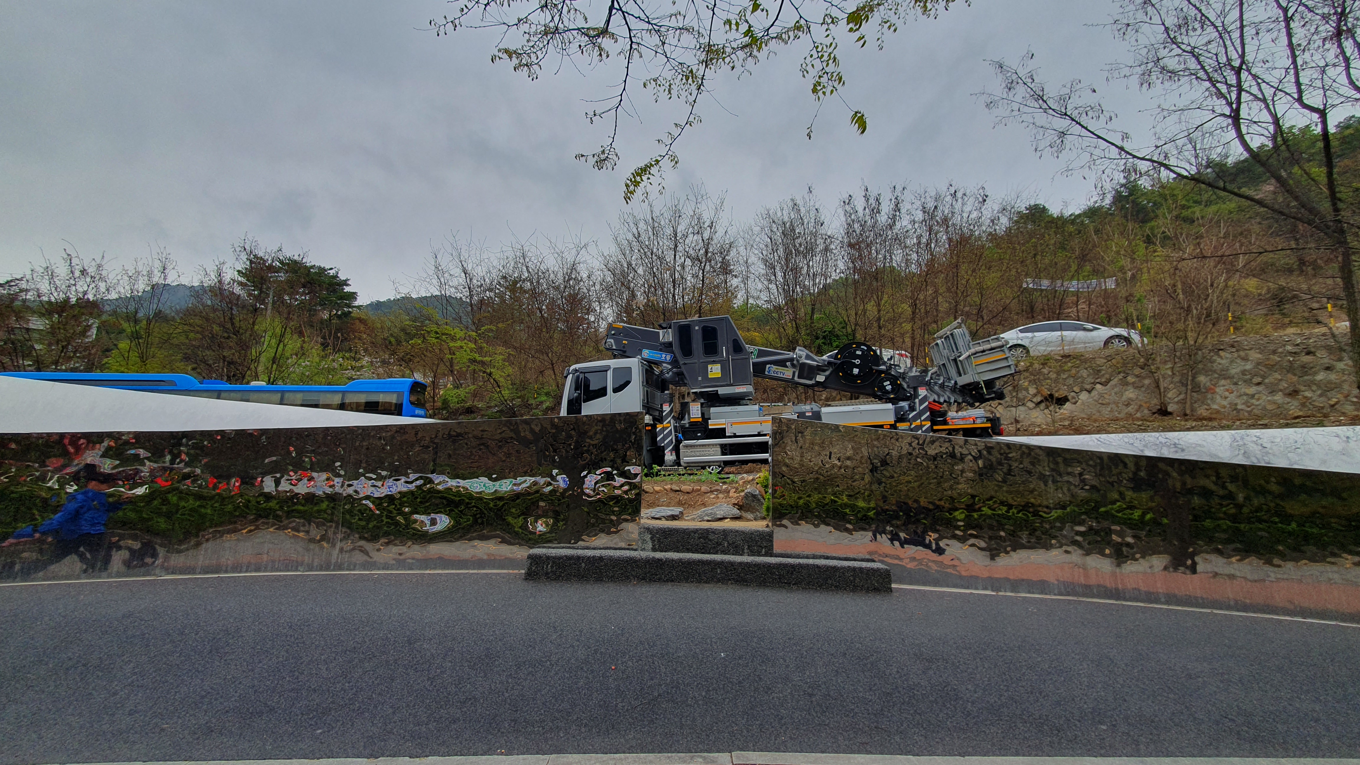 2023.04.15/ #도시기록 #apap #안양예술공원 #W(HOLE)/ 안양예술공원 중간쯤 삼성3교를 지나 좌측 산비탈의 초입 옛날 만안각수영장 부지를 임시주차장으로 만든 입구에 설치된 조형물 전시인 <W(HOLE)>은 반달형 스테인리스와 탄성고무를 이용한 작품으로 지역 주민들이 스테인리스에 비친 자신과 주변 풍경을 색다른 모습으로 느낄 수 있으며 푹신한 탄성고무의 촉감으로 포근한 감성과 안전성까지 고려했다. 마스크 착용이 일상이 된 상황에서 관람객들은 유일하게 가리지 않은 눈과 발의 감각을 이용해 전시를 느낄 수 있다.