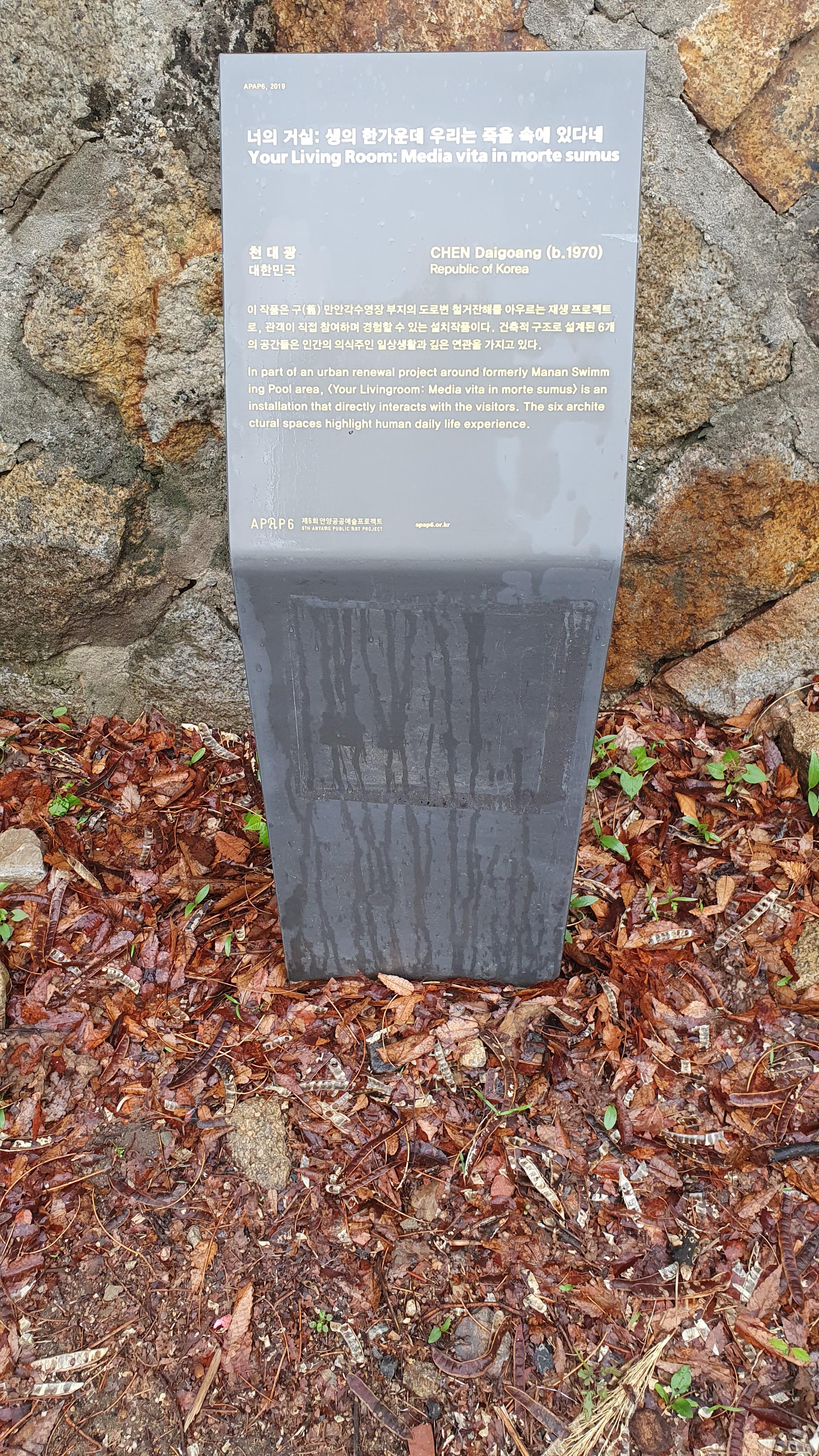 작품의 설치장소는 구 만안각수영장 잔해이다. 작가에게 안양예술공원(구 안양유원지)은 유년과 청년기의 많은 시간을 함께 했던 추억의 장소이기도 하다. 하지만 안양유원지와 공유했던 작가의 정신적 공간은 비참할 정도로 망가지고 해체되고 폐기되어버렸다. 만안각수영장의 잔해는 유일하게 작가의 어린 시절의 기억을 소환할 수 있는 장소일 뿐이다. 작품의 제목은 그레고리안 챈트에서 차용했다. 중세의 무기력한 인간은 절대적인 신(神)에 대한 믿음에 기대어 살았고, 현대 사회에서 신은 자본으로 대체되었다. 현대인의 자아상실감이 풍요로운 물질공간 안에서도 일어나고 있다는 것은 철학적 사고를 바탕으로 한 자아성찰이 이루어지지 않기 때문이다. 물질적 진화의 속도에 정신적 진화의 속도가 맞춰지지 않으면 그 차이만큼의 고통이 발생한다. 삶과 죽음이 다르지 않으며, 가치 있는 삶이 무엇인지 생각하는 것과 삶 속에서 항상 죽음을 준비하는 것은 인간의 삶을 의미 있게 한다. 고통은 불행이며 개체 불행의 합은 사회문제가 된다. 작품은 관광객에게 제공되는 ‘하나의 장소’이며, 그 의미는 관광객 스스로 부여하게 된다.